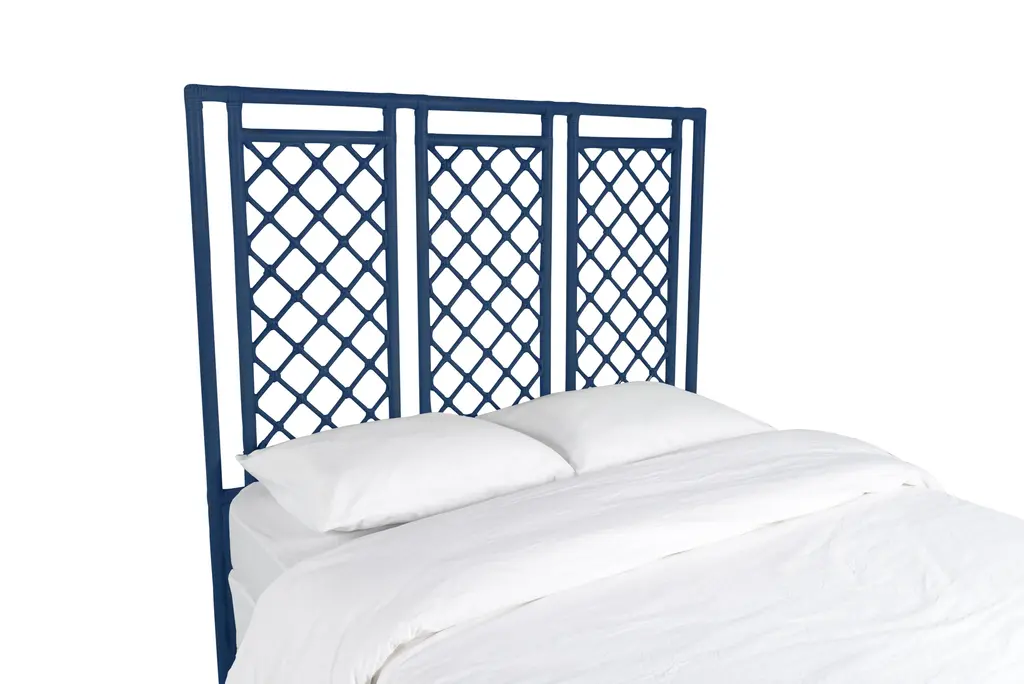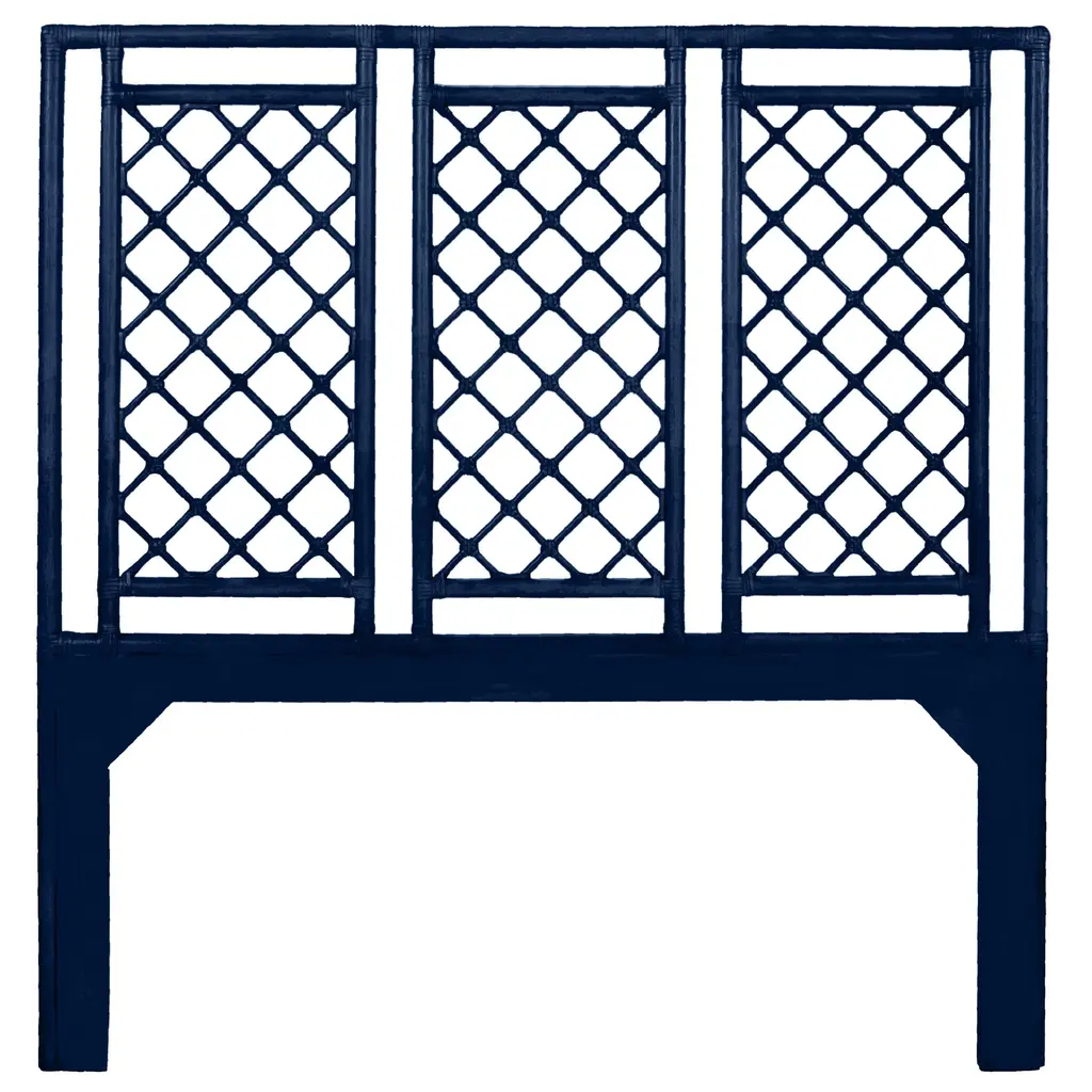 This headboard features classic Rattan design in a geometric pattern. Constructed of solid rattan and hand bound with rawhide bindings. This headboard can be attached to any standard bed frame or hung on the wall. Each headboard is hand finished in the USA and made to order, please allow time for delivery.