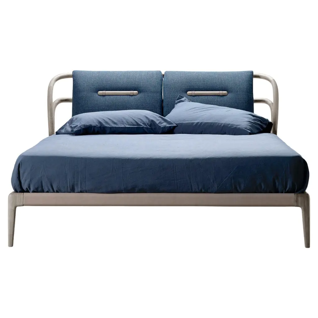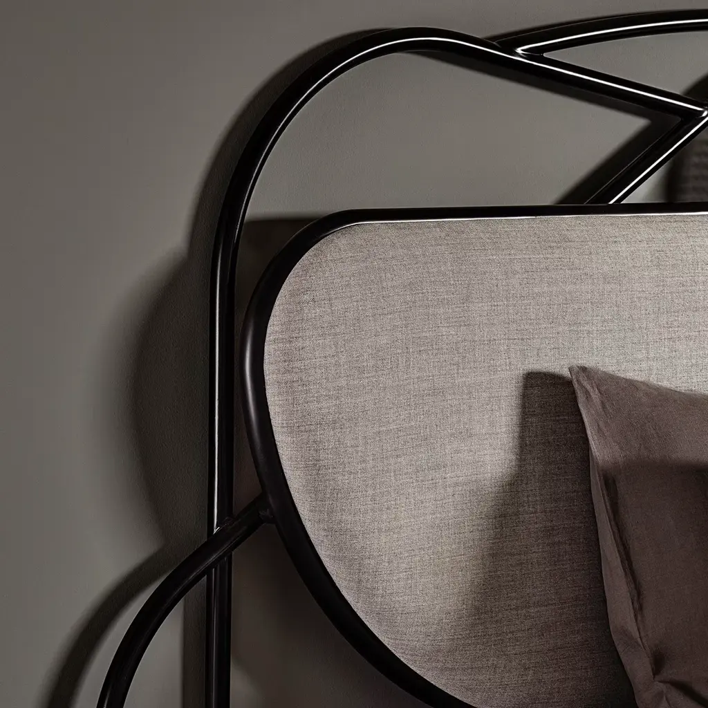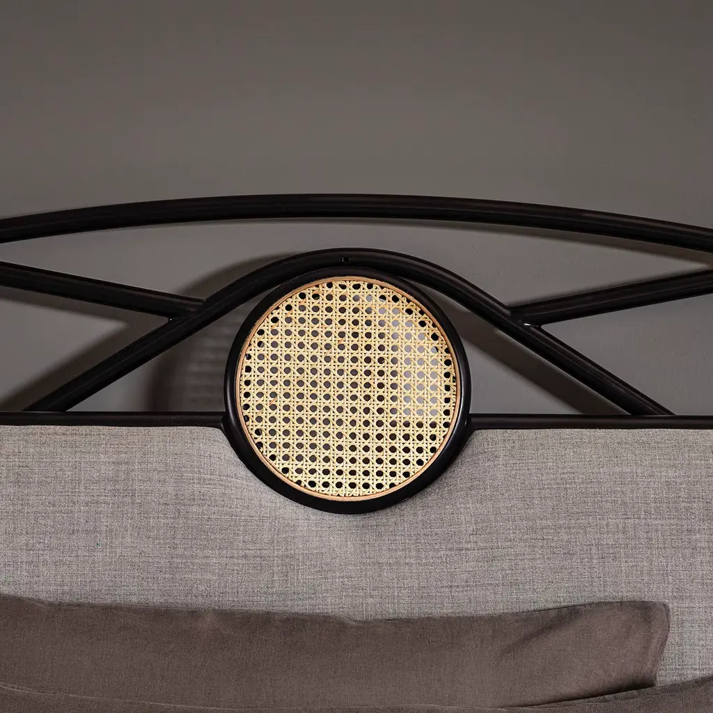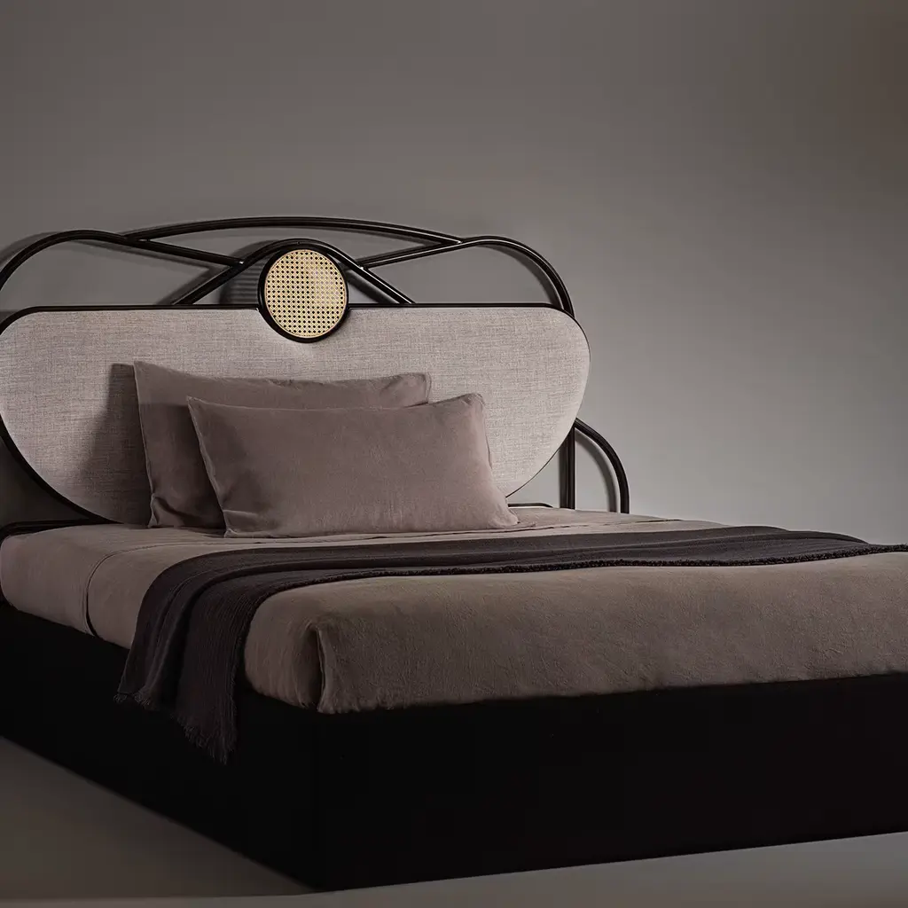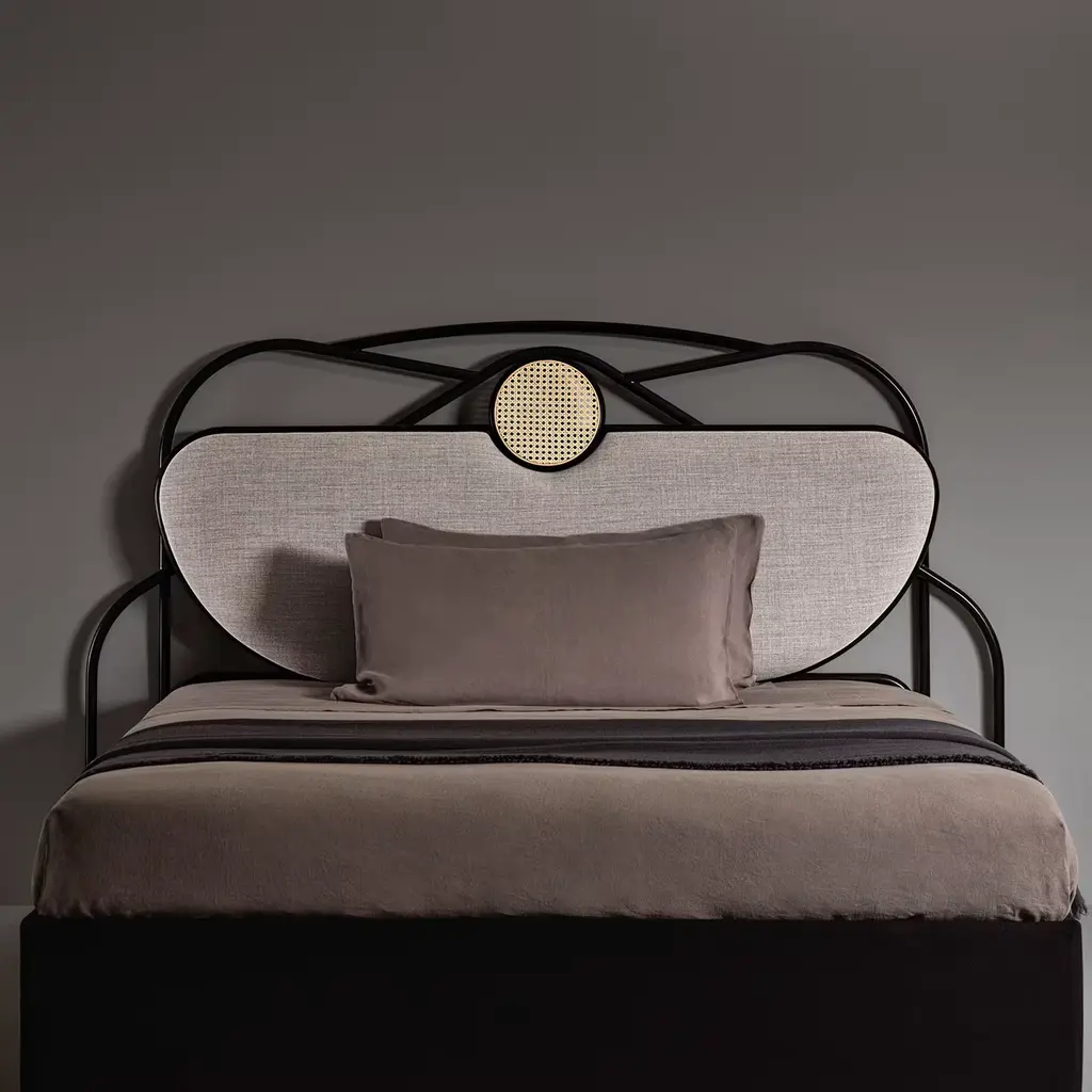 Inspired by the Belle Epoque, the Yvette Headboard, designed by Chiara Andreatti, complements subtle femininity with a bold creative spark. Characterized by its curving profile in black lacquered wood and metal tubing, the Yvette creates a delicate pattern on the wall, while the woven cane is a subtle nod to the brand's signature style. Bedframe not included.