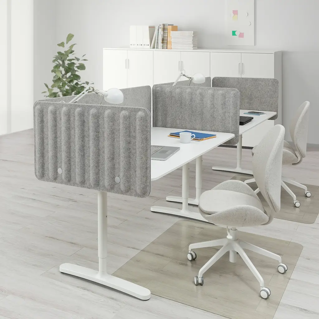 BEKANT Desk with screen - white/gray 126x31 1/2 18 7/8 ". The melamine surface is durable, stain resistant and easy to keep clean. Deep table top gives a generous work surface and lets you sit at a comfortable distance from the computer monitor. Holds push pins and can be used as a noticeboard.