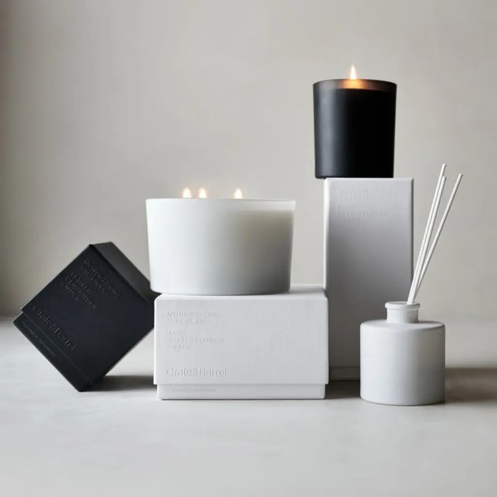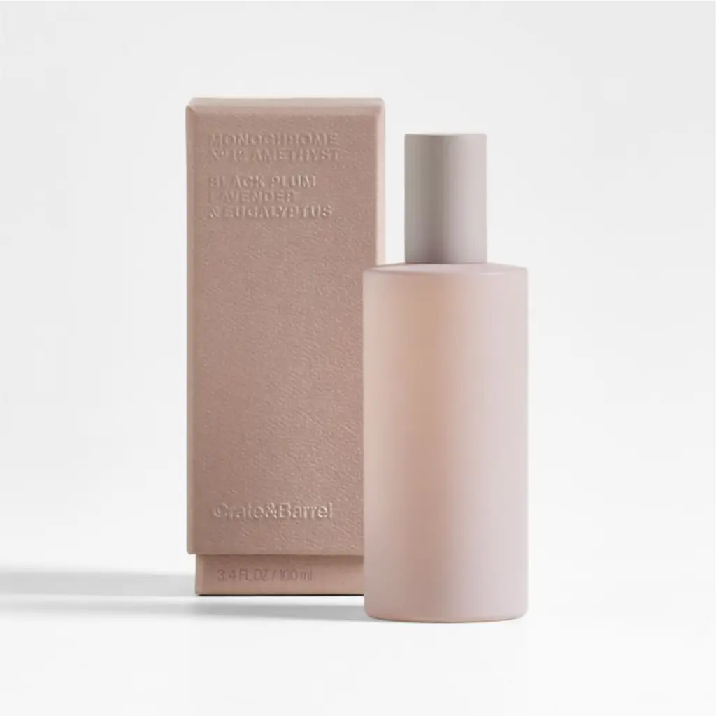 Utterly modern in monochromatic white. Our room spray infuses the air with the fresh scents of lemon zest, mint and basil grounded by the richness of sage, cashmere wood and musk. The nozzle releases the perfect amount of fragrance for the ideal level of ambient scent. Packaged in a white gift box, the white glass vessel has a clean, crisp look that brightens your coffee table, dresser or mantel. Part of our Monochrome scent collection, the No. 01 Blanc room spray is a Crate & Barrel exclusive.