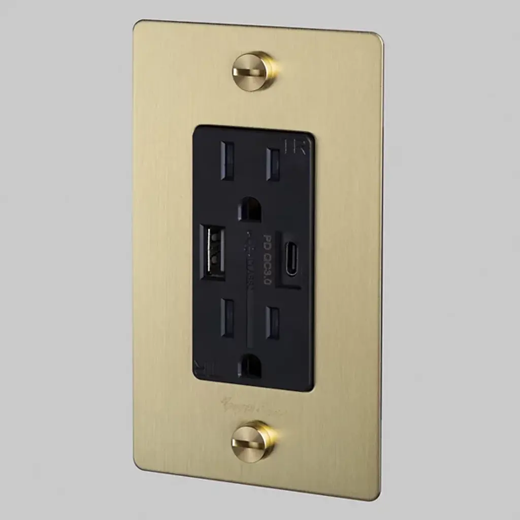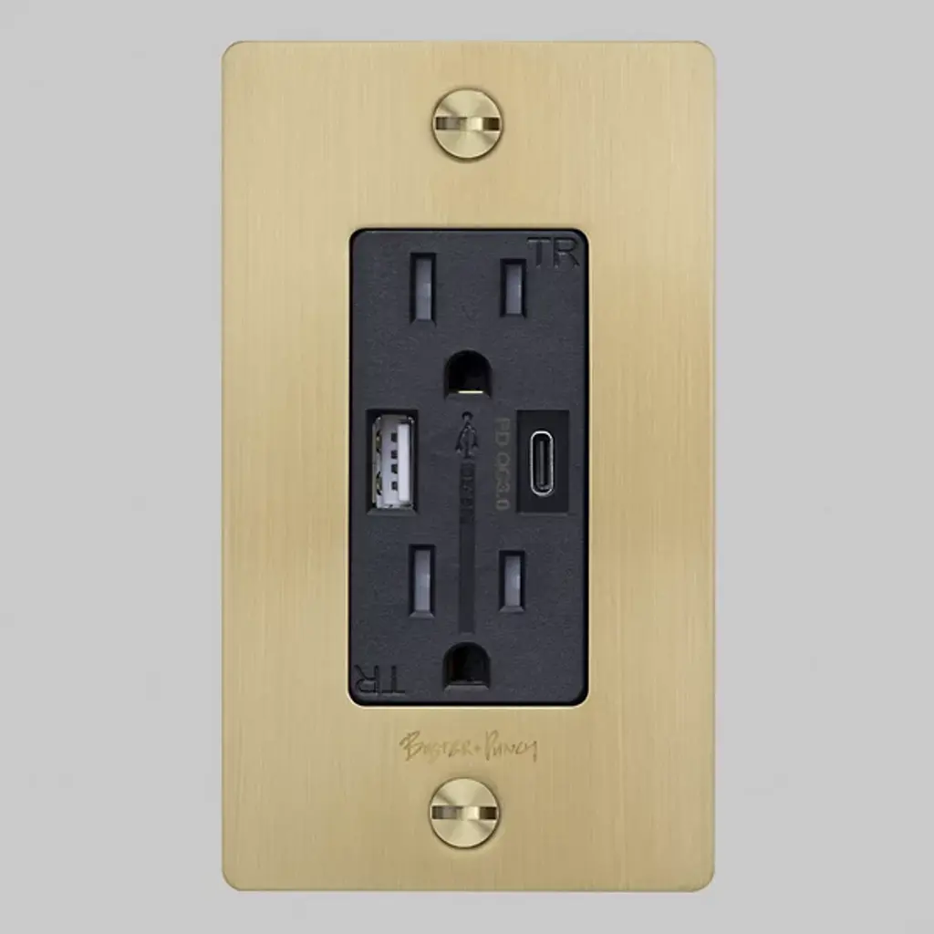 Power up with the 1-Gang Combination Duplex Outlet with USB-A and USB-C Ports from Buster + Punch. Your outlet is composed of stainless steel, which takes on a linear shape for an industrial look. Your outlet is USB Type-C compatible and adheres to the USB-PD 3.0 fast charging standard. The 1-Gang Combination Duplex Outlet comes with a wall plate and coin screws.
