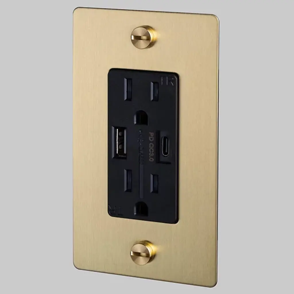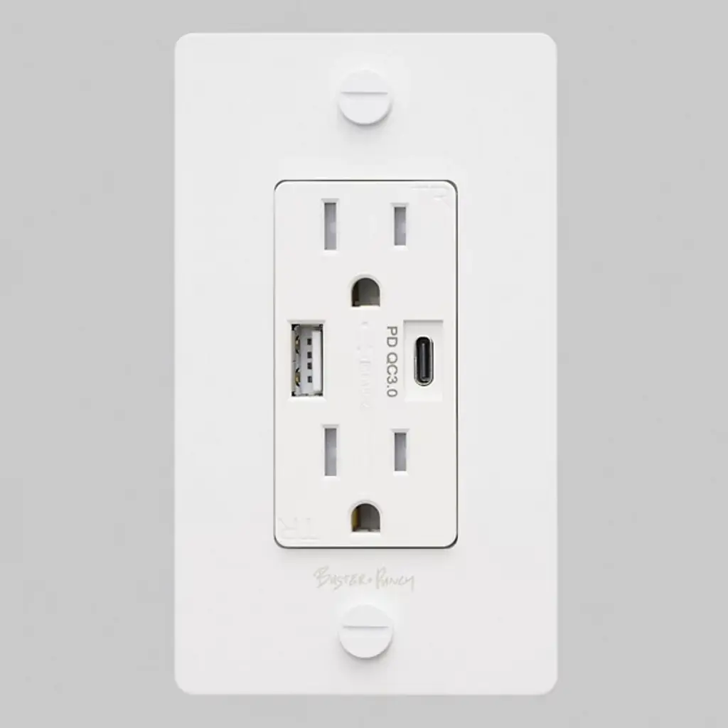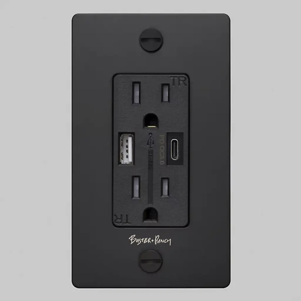 Power up with the 1-Gang Combination Duplex Outlet with USB-A and USB-C Ports from Buster + Punch. Your outlet is composed of stainless steel, which takes on a linear shape for an industrial look. Your outlet is USB Type-C compatible and adheres to the USB-PD 3.0 fast charging standard. The 1-Gang Combination Duplex Outlet comes with a wall plate and coin screws.