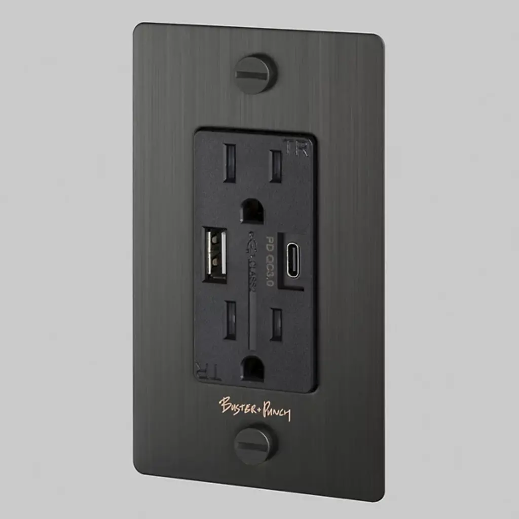 Power up with the 1-Gang Combination Duplex Outlet with USB-A and USB-C Ports from Buster + Punch. Your outlet is composed of stainless steel, which takes on a linear shape for an industrial look. Your outlet is USB Type-C compatible and adheres to the USB-PD 3.0 fast charging standard. The 1-Gang Combination Duplex Outlet comes with a wall plate and coin screws.