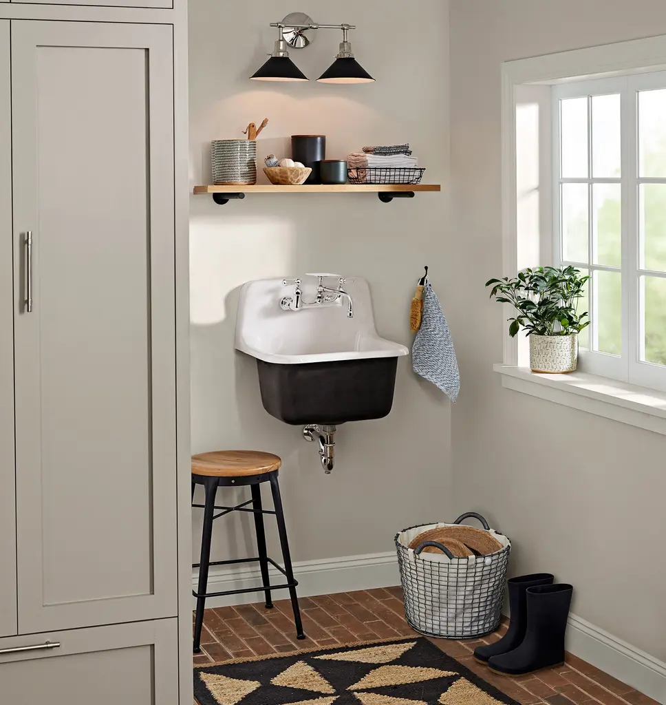 This timeless wall-mounted design pairs club-style handles with an integrated soap dish for a clean, classic look.