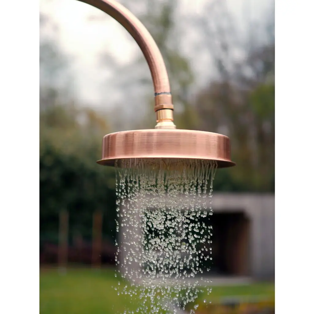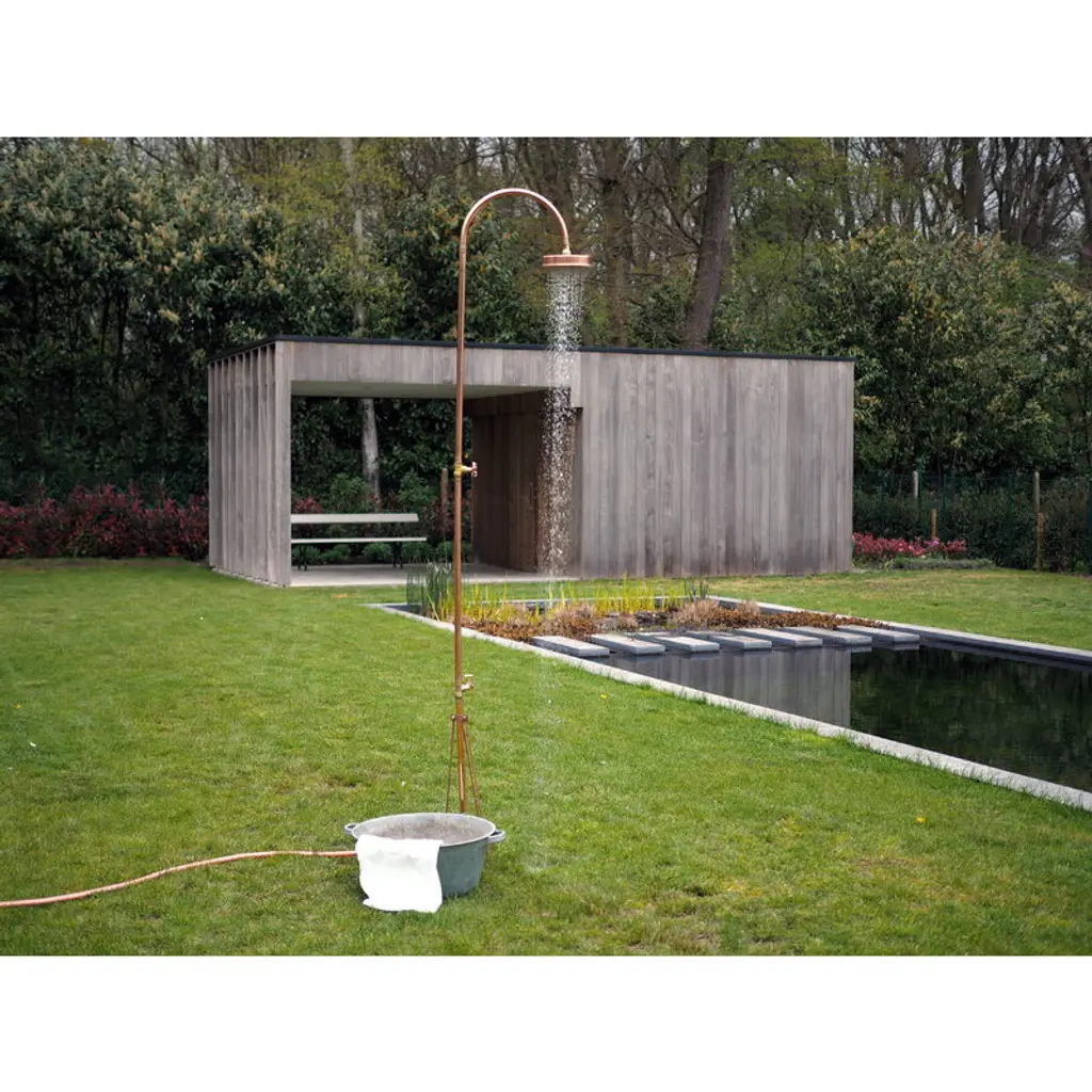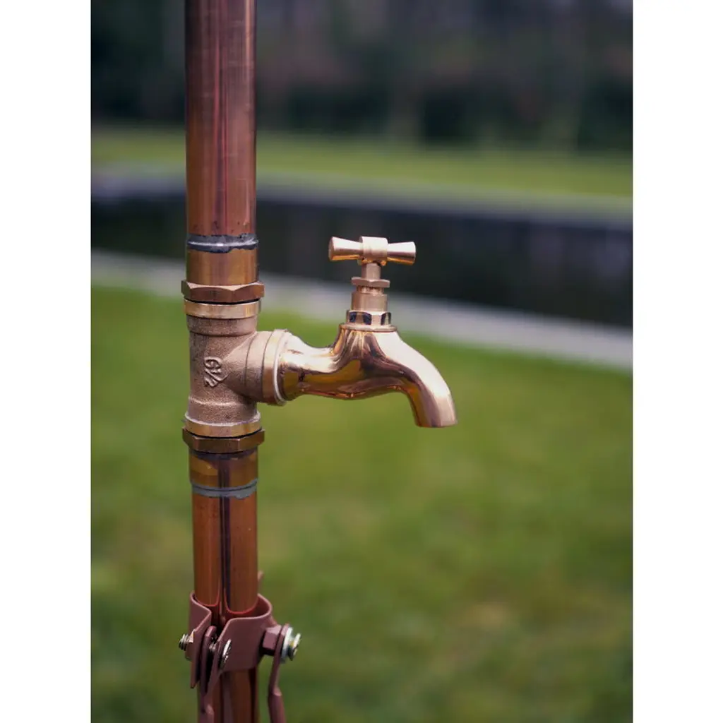 The Excel outdoor shower makes for the perfect finishing touch to a garden, pool area, sauna or beach. The shower is made of copper tube and has a sleek and luxurious look, and over time, its shade becomes beautifully patinated – of course, it is possible to polish the copper if you prefer to keep it as is. Thanks to the innovative spiked structure, the Excel outdoor shower can be easily erected anywhere by pushing its spikes directly into the ground. It only takes a few minutes to assemble with no tools needed at all. The shower features a small drain tap at the bottom part for rinsing your feet or filling a watering can. The Excel shower is best suited for users between 160 and 74.8 in (190 cm) in height. If you want a lower or higher shower, please contact our Customer Service to order the suitable accessories.