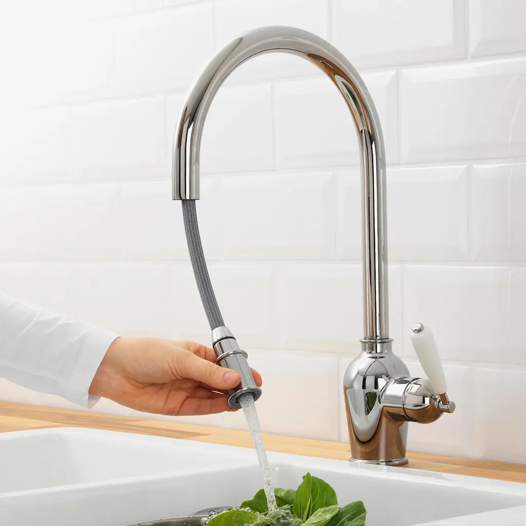 INSJÖN Kitchen faucet with pull-out spout - chrome plated. 10-year Limited Warranty. Read about the terms in the Limited Warranty brochure. Rinsing dishes is easier with the pull-out spout. A counterweight makes the hose easily retract back into the kitchen faucet.