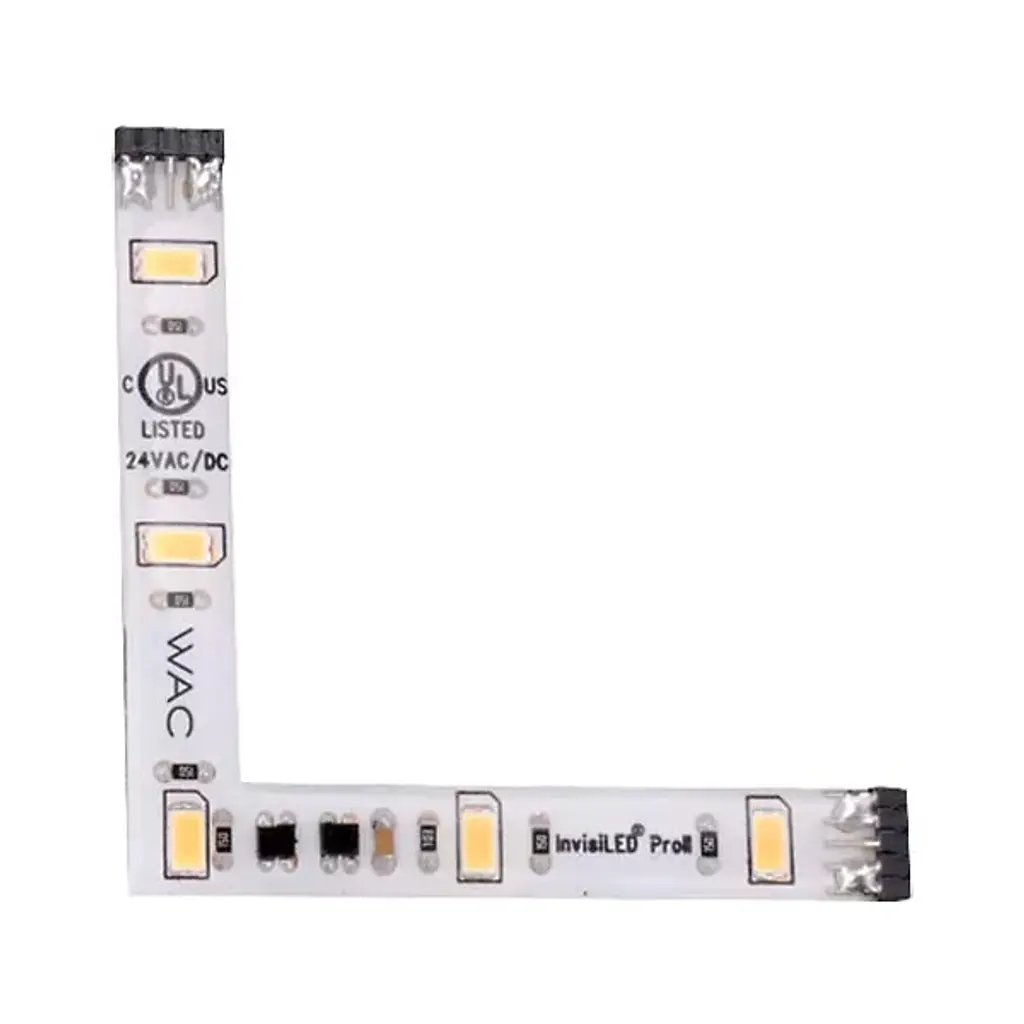 The brightest InvisiLED system out there. The InvisiLED 24V Pro 2 High-Output 5 LED L Connector from WAC Lighting is an environmentally friendly way to navigate your lighting system around corners without sacrificing lumens output. This L-shaped light strip has two female connections and can accommodate both left- and right-side applications. It also includes a single male “I” connector and an end cap. With the diodes evenly spaced at 1-inch on the center, InvisiLED doesn’t leave any empty patches, giving you a full-bodied light system. It’s easily installed with an option of three different mounting methods depending on where you’re placing it.