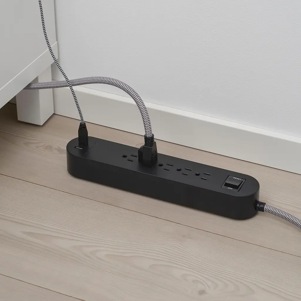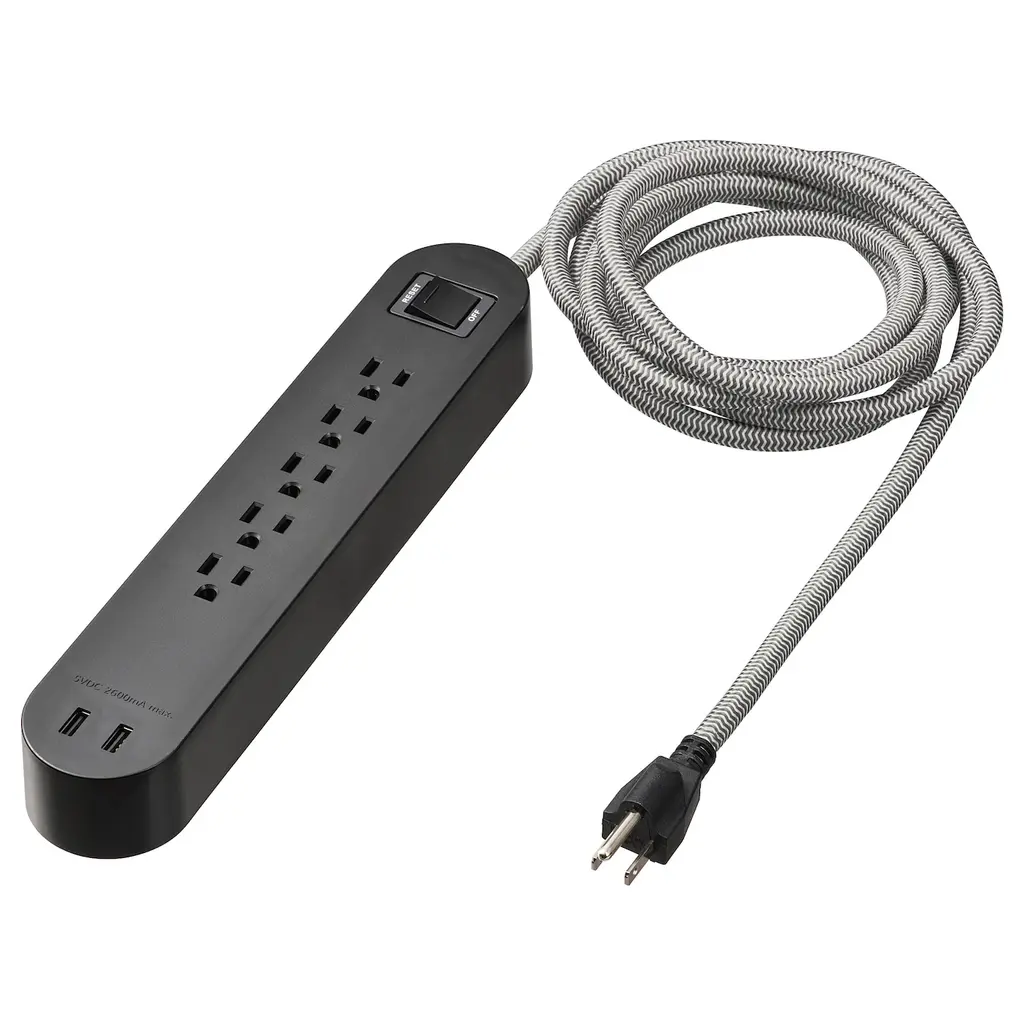 KOPPLA 5 outlet power strip & 2 USB ports - black/white/textile 118 ". You can charge your smartphone, computer and other devices all at the same time, since the power strip has 5 individual outlets and 2 USB ports. Only for indoor use. Current USB ports: Max. 2600mA. Voltage USB ports: 5Vdc.