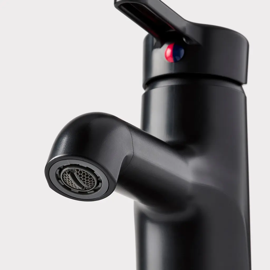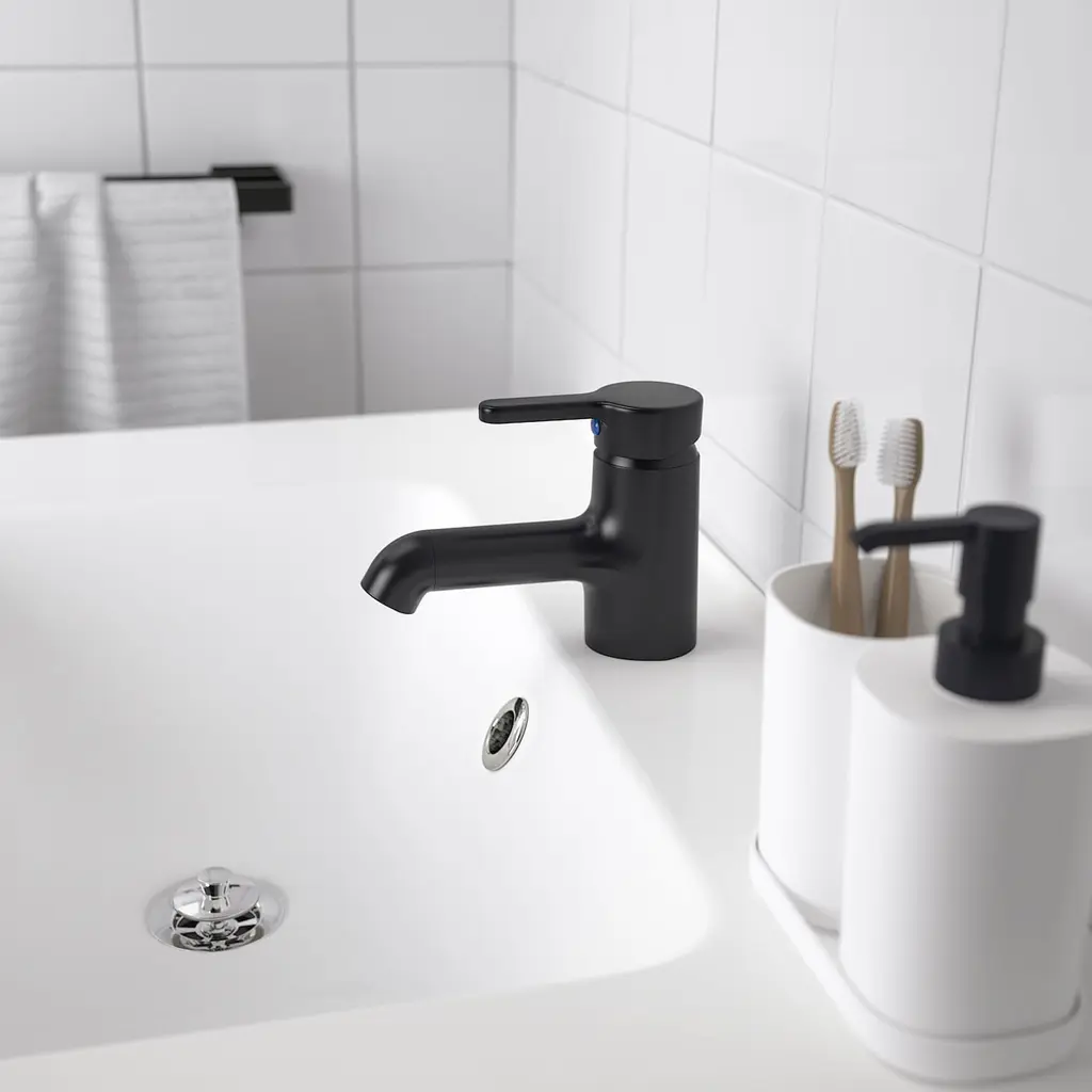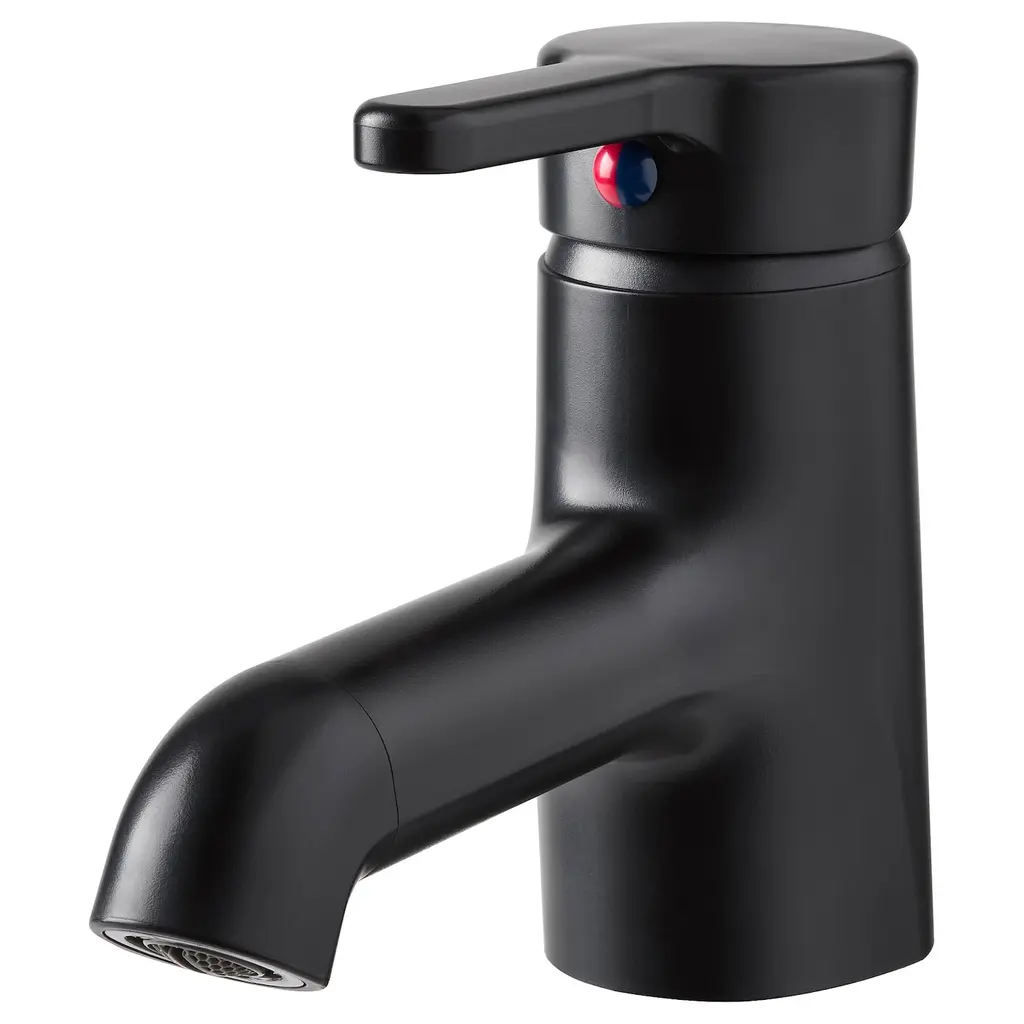 SALJEN Bath faucet - black. 10-year Limited Warranty. Read about the terms in the Limited Warranty brochure. Hot water is released by turning the lever to the left. It is only then that hot water is consumed. Sink strainer not included. Connection hoses with 9/16" connection included. Length: 13¾".