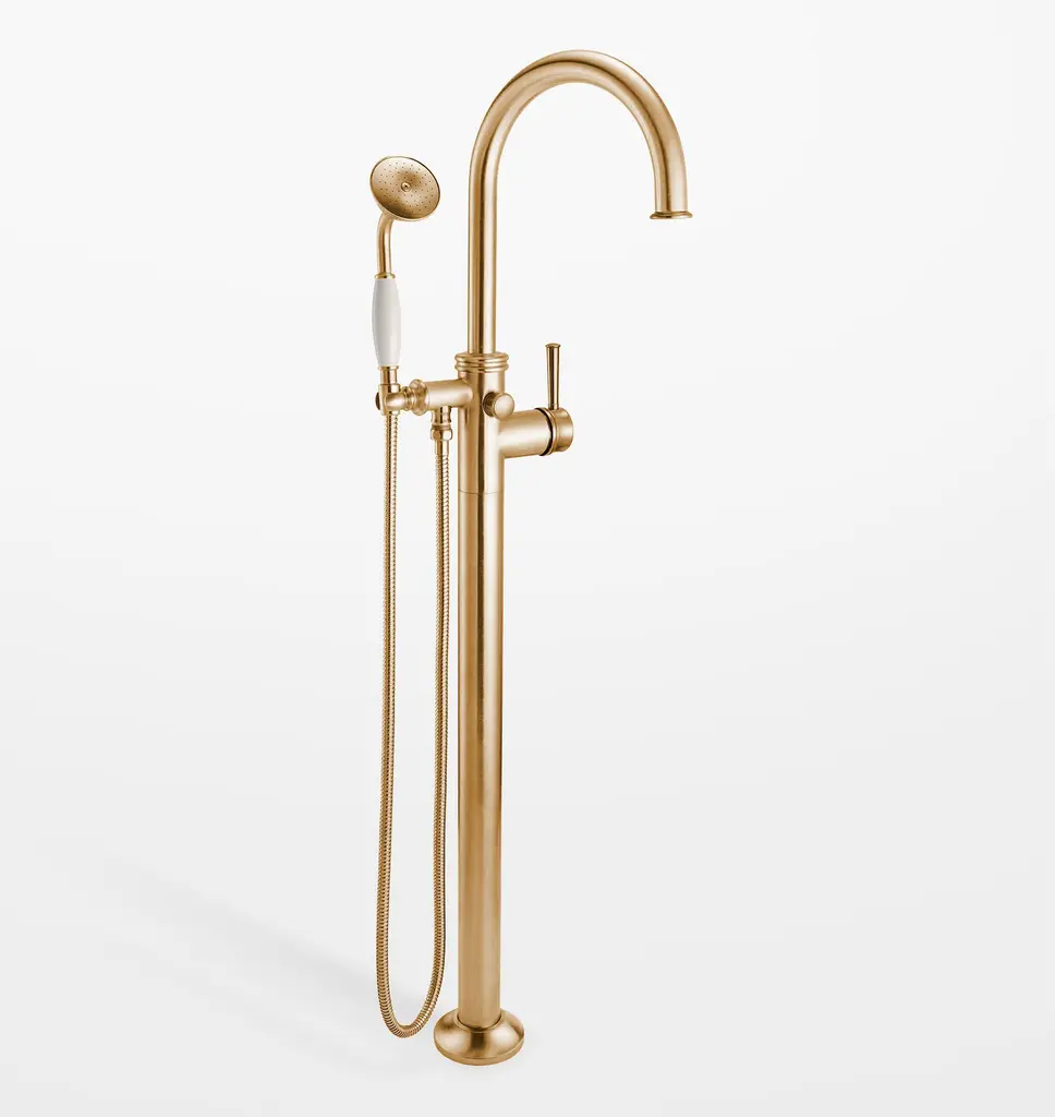 With clean curves and a modern design, our Tiburon Floor Mounted Tub Filler with Handshower adds a soft minimalist look to your bathroom. Crafted from solid brass, the tub filler features a flow rate of 10 gallons per minute to quickly and efficiently fill your tub. Available in several finish options.For our handcrafted plumbing selection, we partner with companies a lot like our own. Based in Huntington Beach, California Faucets has designed, assembled, and finished all its own parts since 1988. We worked closely with them on this collection to bring you the finest fittings available.