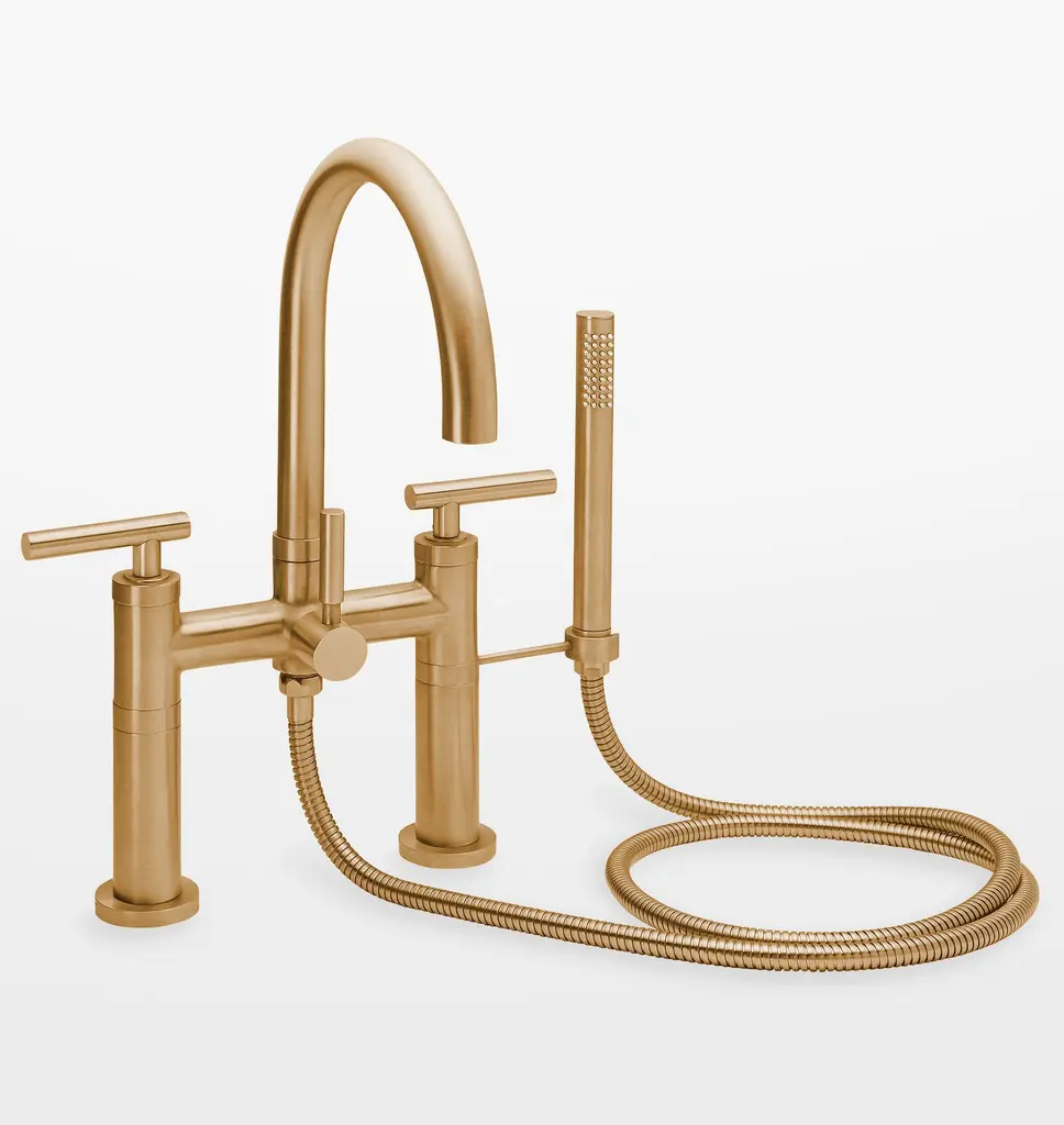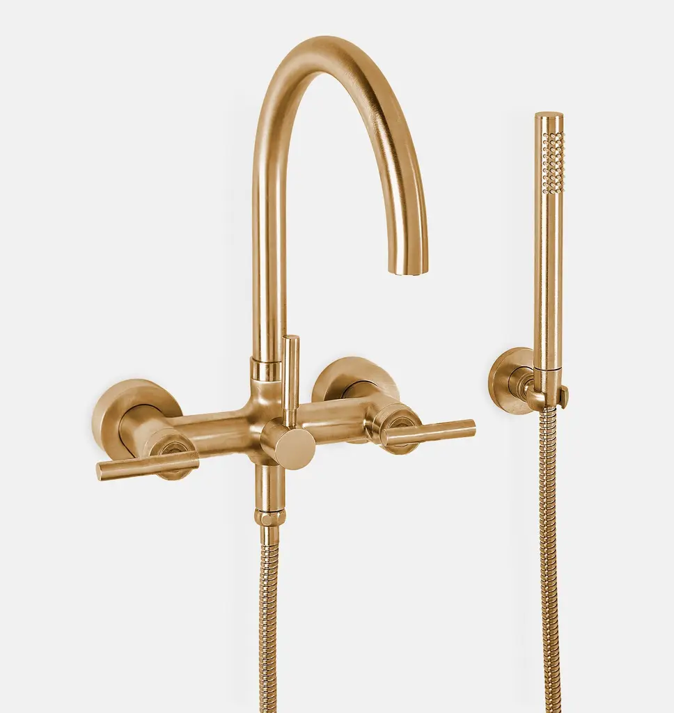 With clean curves and a modern design, our Tiburon Wall Mounted Tub Filler with Handshower adds a soft minimalist look to your bathroom. Crafted from solid brass, the tub filler features a flow rate of 15 gallons per minute to quickly and efficiently fill your tub. Available in several finish options.For our handcrafted plumbing selection, we partner with companies a lot like our own. Based in Huntington Beach, California Faucets has designed, assembled, and finished all its own parts since 1988. We worked closely with them on this collection to bring you the finest fittings available.
