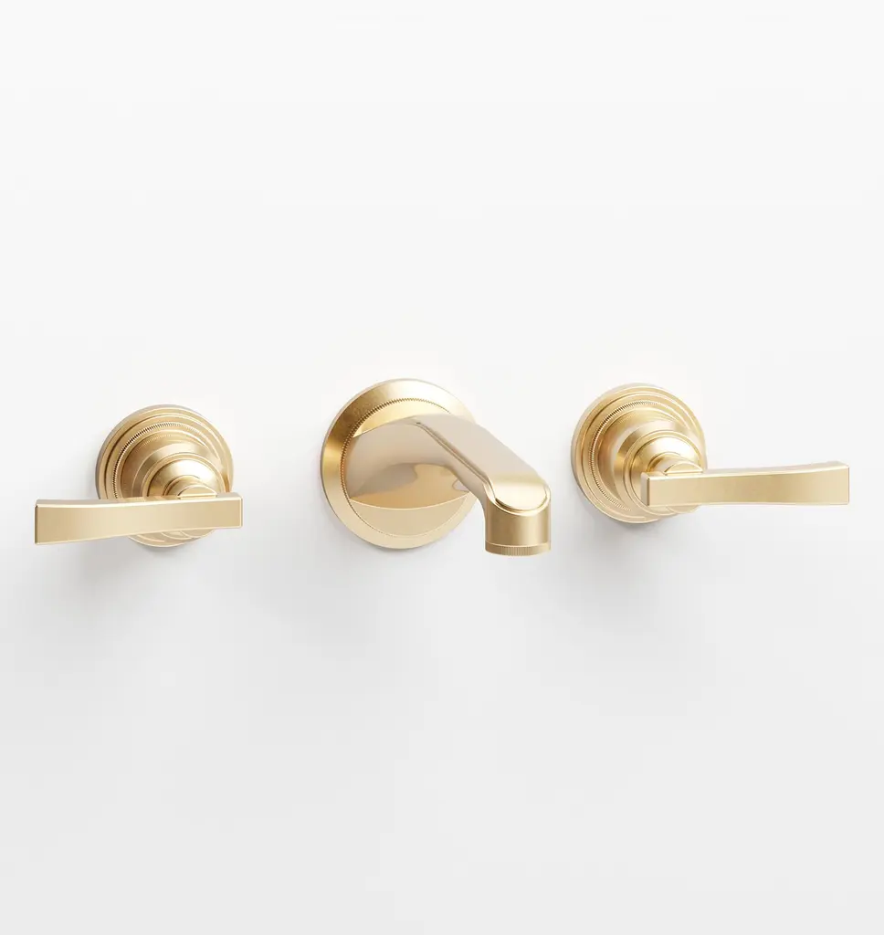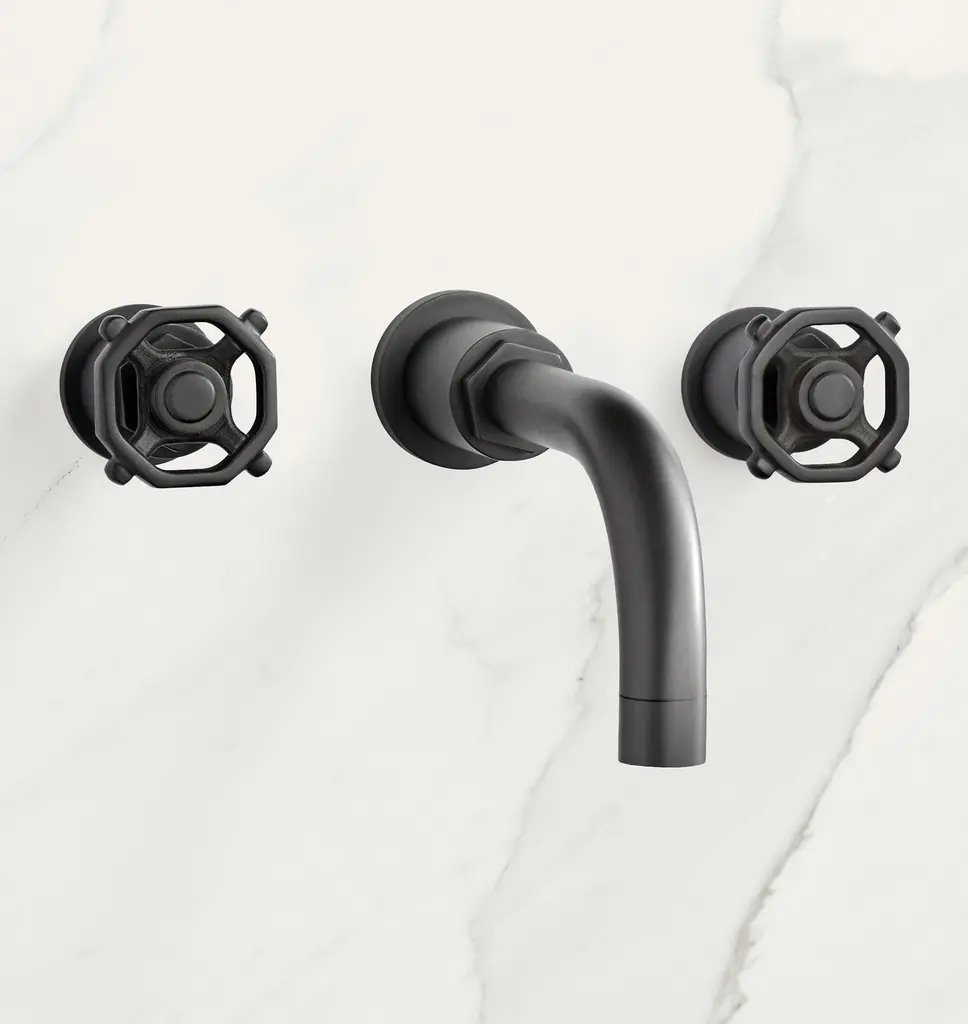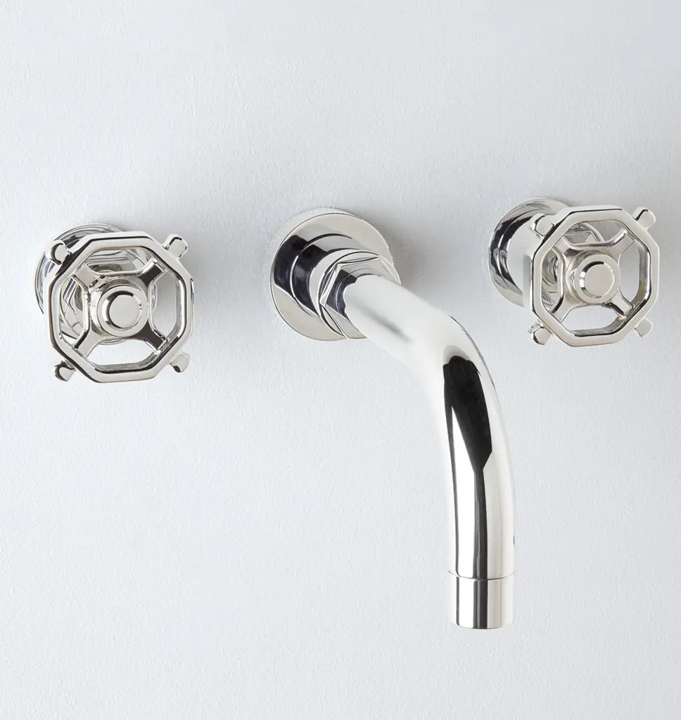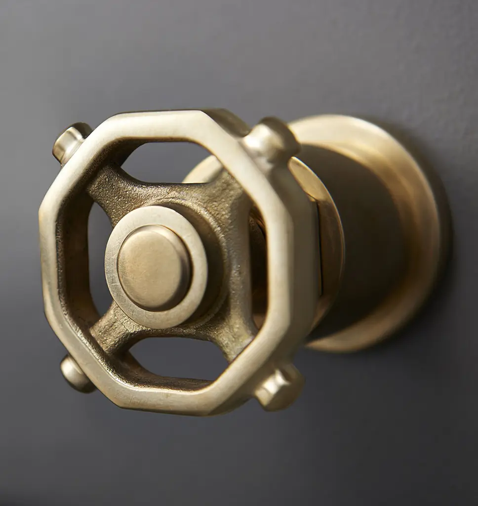 Crafted from solid brass and inspired by utilitarian styles, Tolson features unique handles designed to evoke industrial handwheels—a timeless element for your bath.