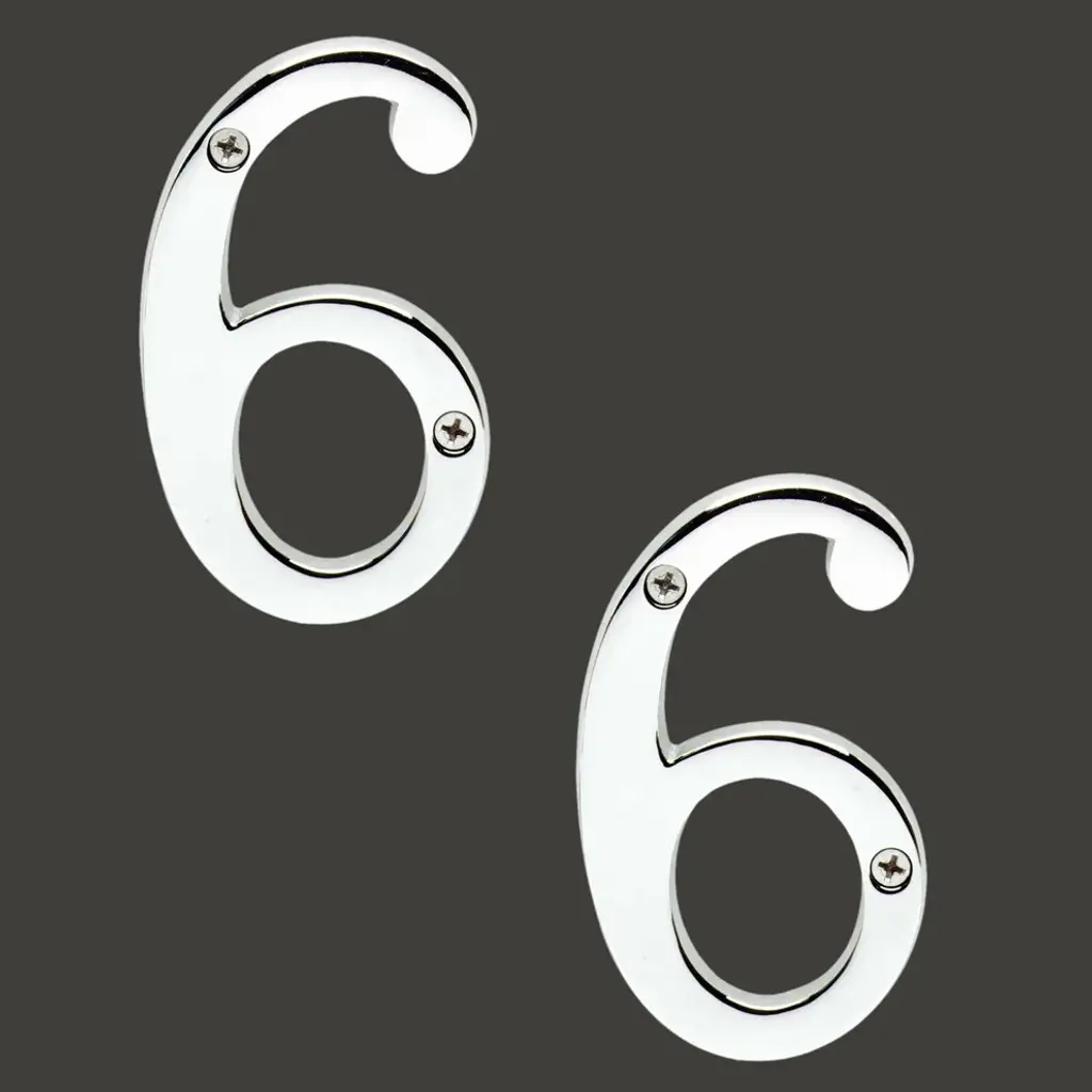 Item 28561 (2) pieces House numbers: Crafted of chrome over solid brass, these sand cast numbers measure 3-7/8 in. high. Beautiful chrome will withstand the test of time. Includes 2 screws for mounting.