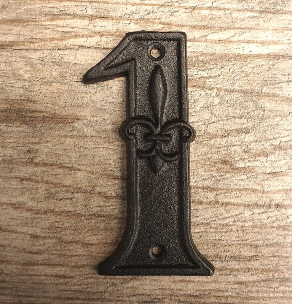 Strong and Sturdy, build to last for years to come. Cast Iron material is maintenance free since they don''t rust & break easily, perfect for Home or office use.Vintage Black finish with Fleur de lis design embossed. Hand made product with rustic & Ornate look , Easy to install on wood, brick or cement wall etc.Large enough to be seen from the street. Measures 4"" X 0.5". Matching screws included.Make your house numbers unique and attractive because this is the first thing people look before they enter your home.