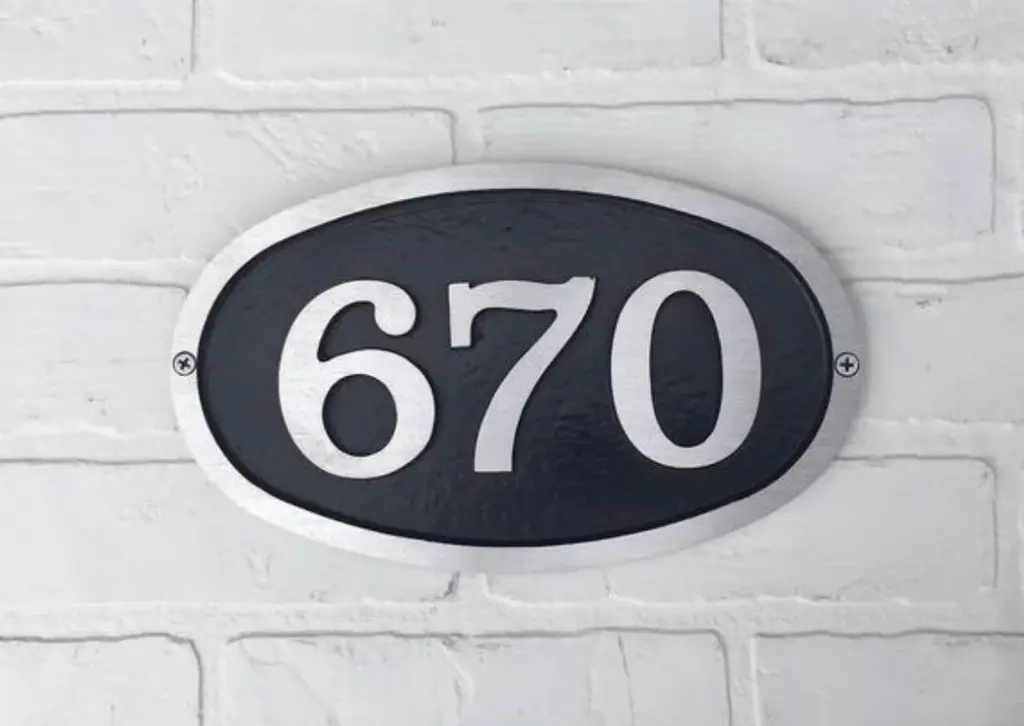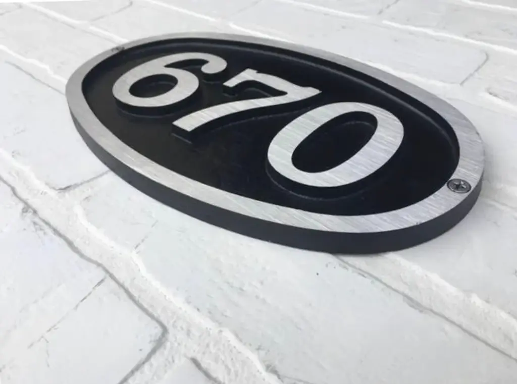 TRADITIONAL SERIES:The Traditional address plaques feature one of a kind designs finished in signature brass or aluminum reveal border and numbers allowing the numbers to be seen from greater distances. They are cast solid from superior quality pure authentic brass or aerospace grade aluminum, are extra thick, are durable, and are naturally rust-free.TRADITIONAL SMALL OVAL ADDRESS PLAQUE: • Cast solid high quality aerospace grade aluminum • Accommodates up to 3, three inch high numbers • Orientation: Horizontal • Dimensions: 10 3/4" X 6" X 1/2" • Color: Black background with signature polished brass number and border reveal • Clear coated - Weather resistant • 3" Bold font • Cast solid aluminum as one piece, the numbers are NOT removable • Durable, thick (1/2"), strong, and will last a lifetime • Hardware included, screw heads are color matched • Made in the USAORDER DETAILS:IMPORTANT: All orders are custom made. After you place your order we will contact you to ask for the numbers you would like on your plaque. This plaque can fit between 1 and 3 numbers. If you have any questions please send us a message.HANDMADE PRODUCTS:Please note that all our products are meticulously handmade by master artisans one piece at a time. Due to this process, there are slight variations from one item to the next. Such variations are inherent in the manufacturing of handmade products, expect minor distinctions that will make your purchase special and truly one of a kind.