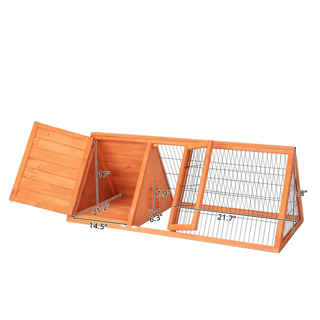 This pet hutch is beautifully crafted from high quality solid fir wood and has a triangular shape. With no rough edges or splinters, this pet hutch would be perfect for animals such as a small rabbit, guinea pig, ferret. This hutch is spacious and the length of it allows the animal in it to run around. Furthermore, this hutch features two doors making it easy to clean and a cosy sleeping area which has a wooden floor making it more comfortable for your pet. Please note that this item requires home self assembly. Features: 1. Put anywhere and have an instant home.Use in the garden to keep the grass down (save on mowing!) 2. Two opening doors for easy access 3. Strong wire with opening for easy access 4. Separate sleeping area run area with divider 5. Sturdy and lightweight.Open base so can put on grass Specifications: 1. Dimensions: (50.4 x 23.6 x 19.7)"" / (128 x 60 x 50)cm (L x W x H) 2. Weight: 7.15kg / 15.76lbs 3. Gate Dimensions: (14.5 x 19.9)"" / (37 x 50.5)cm (W x H) 4. Small Door Dimensions: (9.25 x 19.9)"" / (23.5 x 50.5)cm (W x H) 5. Interior Arch: Dimensions: (6.3 x 7.9)"" / (16 x 20)cm (W x H) 6. Material: Fir Wood Package includes: 1 x Cage 1 x Installation Manual Assembly Tools Notes: 1. Manual measurement has been used, there may be some reasonable error 2. All the pictures are taken by actual samples, slight chromatic aberration may occur due to lighting or display