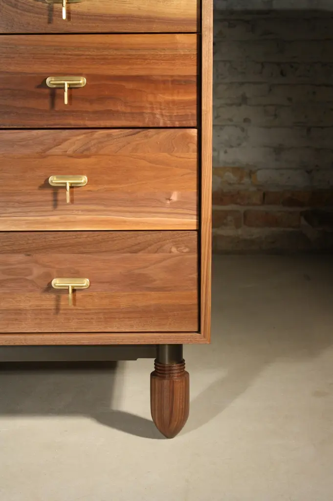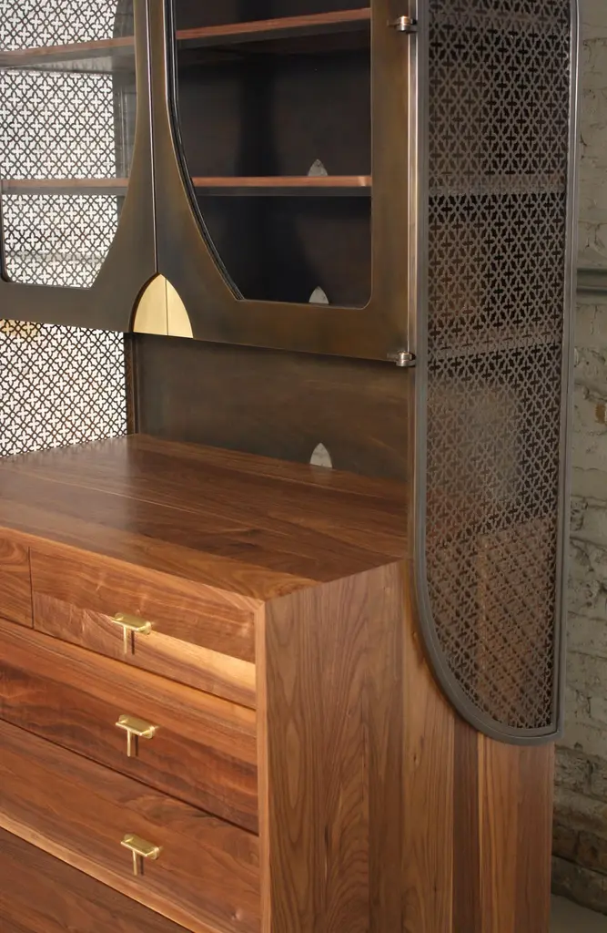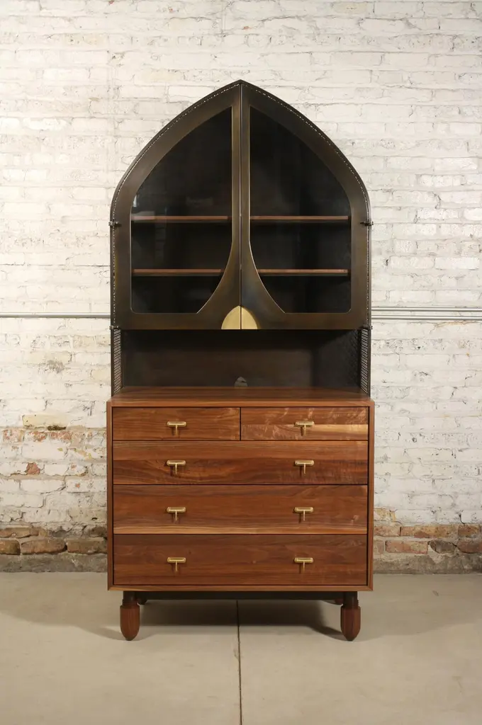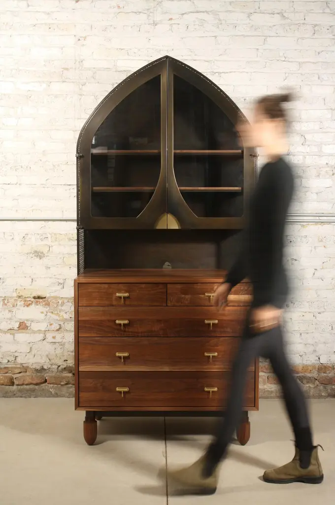Basilica Hutch by Laylo StudioLimited EditionDimensions: D 61 x W 101.6 x H 213.3 cm.Materials: Blackened steel, brass, glass, walnut, felt.A hutch built in celebration of the four-centered arch. An architectural archetype that appears in the collective tabernacle of many different cultures, each with specific nuance, Basilica borrows this distinct geometry to define a space for displaying artifacts of personal significance.LAYLO is the practice of Sam and Lydia Link. Founded with the intention of building through the exploration and integration of traditionally siloed crafts, the partners design and independently produce limited edition, functional works in their Chicago workshop using both contemporary and age-old equipment and techniques.Sam and Lydia are deeply committed to creating each piece themselves, believing firmly that this hands-on approach imbues their creations with a tangible essence of their presence as both artisans and artists.Their work is a testament to their dedication and passion, an ode to the meticulous and diligent process of creation. They adopt a "slow-cooker" approach to design and manufacturing, a deliberate counter-narrative to the relentless 24/7 production schedule that has dominated the market since the mid-19th century referencing the contrarian Arts and Craft and Studio Craft movement that emerged. As a result of their methods, each piece in their collection is not merely an object but a narrative of Sam and Lydia’s personal journey through the manual manipulation of materials. Their work is informed not just by their own creative visions but also by external references that guide their labor. In an age of mass production, LAYLO stands out as a beacon of individuality and craft, offering pieces that are not just made but are brought into existence with intention, care, and a profound connection to the history and significance of making.