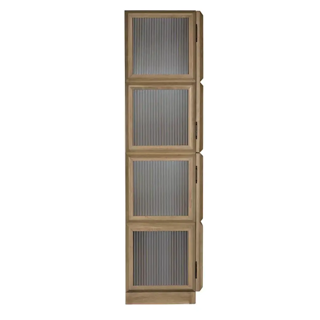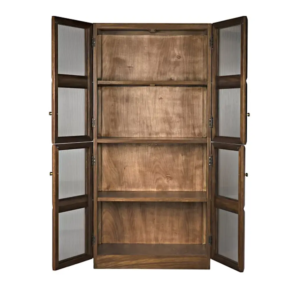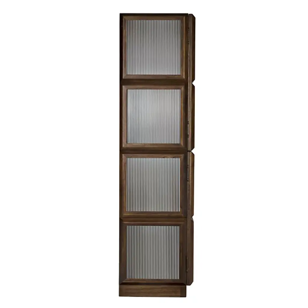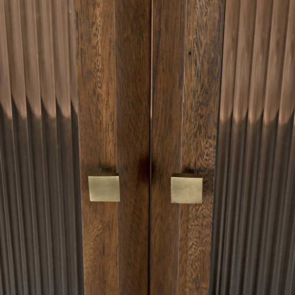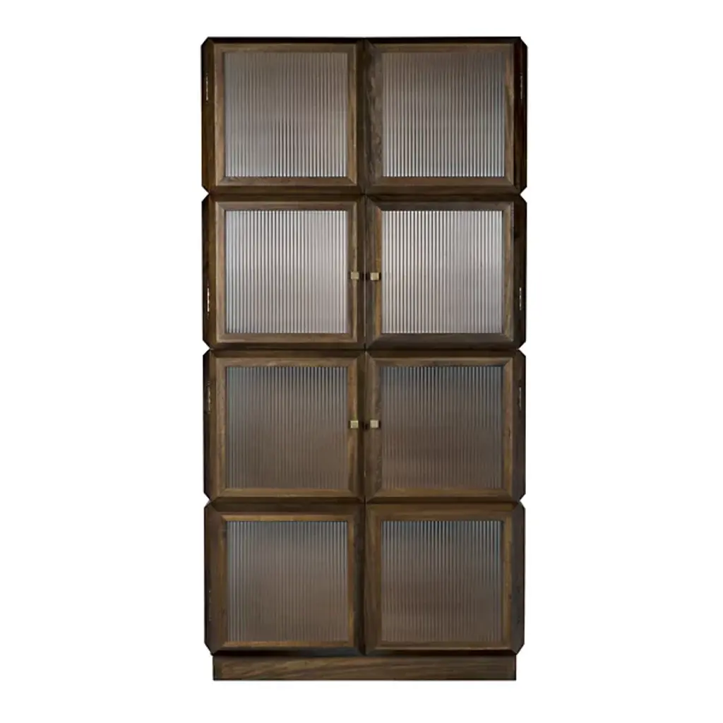 The Collins Hutch from Noir showcases modular design through individual door panels arranged in two tiers, each featuring ribbed glass inserts that create rhythmic vertical lines across the framework. Deep faceted door fronts add dimensional interest while the ribbed glass inserts provide textural contrast against the smooth wood surfaces. Brass pull knobs accentuate each compartment with warm, metallic touches. The substantial scale and geometric organization make this storage piece function as room architecture, while fixed shelving in both top and bottom sections provides a reliable interior structure for organized display.