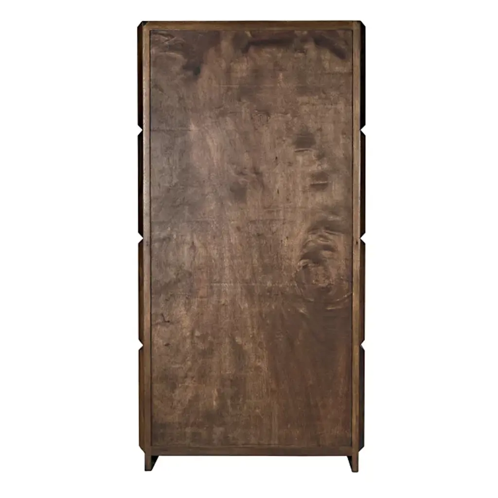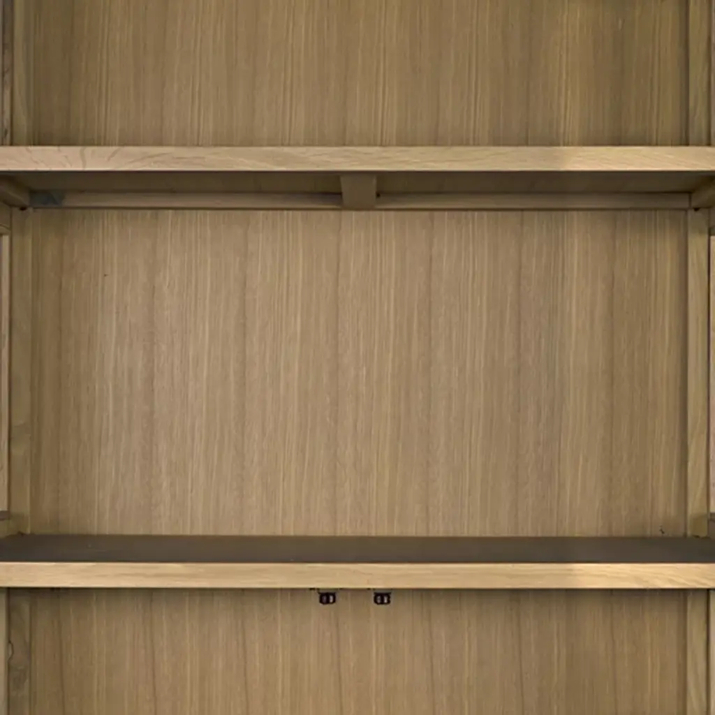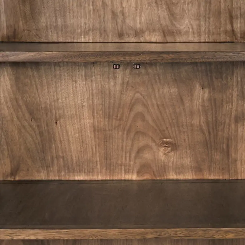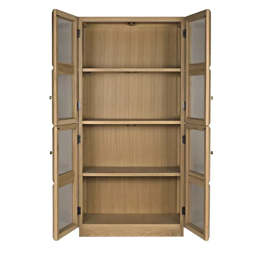 The Collins Hutch from Noir showcases modular design through individual door panels arranged in two tiers, each featuring ribbed glass inserts that create rhythmic vertical lines across the framework. Deep faceted door fronts add dimensional interest while the ribbed glass inserts provide textural contrast against the smooth wood surfaces. Brass pull knobs accentuate each compartment with warm, metallic touches. The substantial scale and geometric organization make this storage piece function as room architecture, while fixed shelving in both top and bottom sections provides a reliable interior structure for organized display.