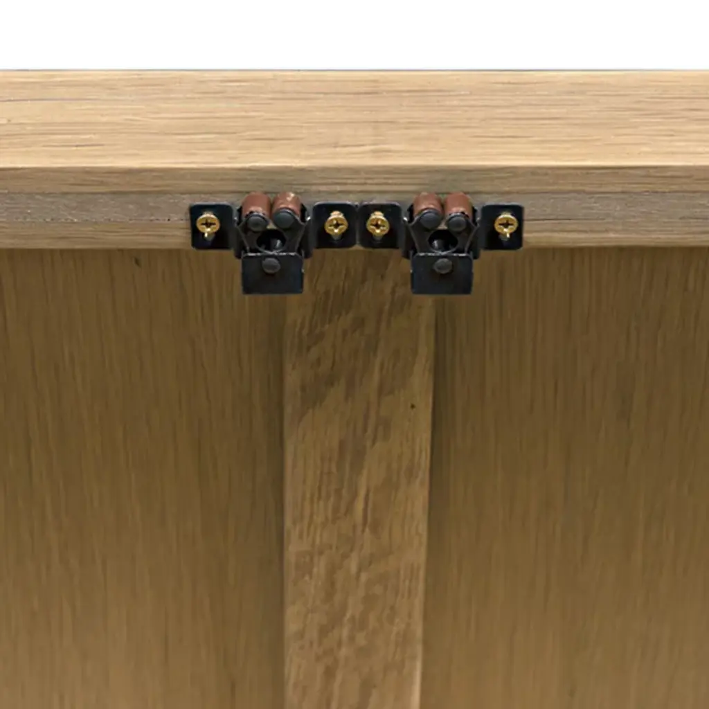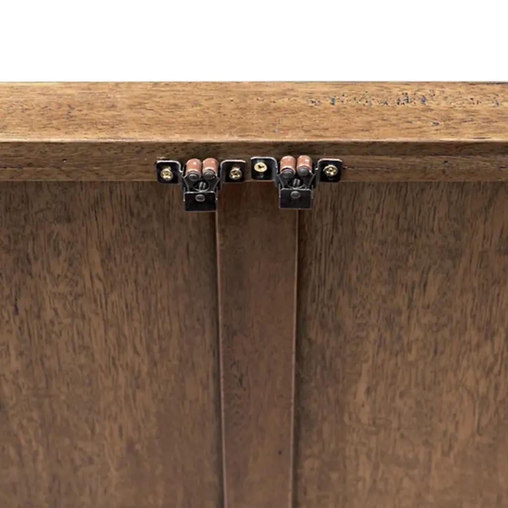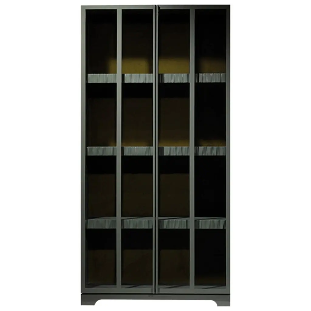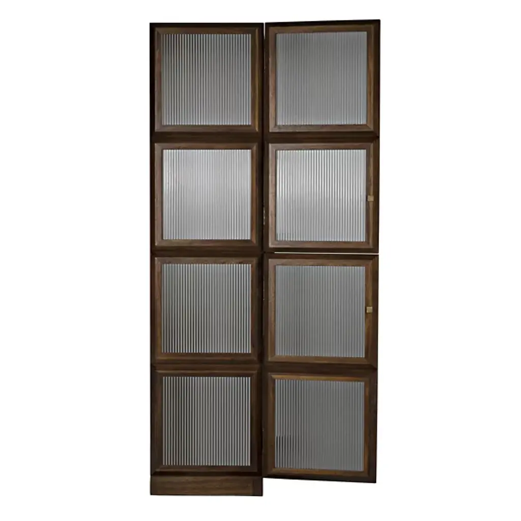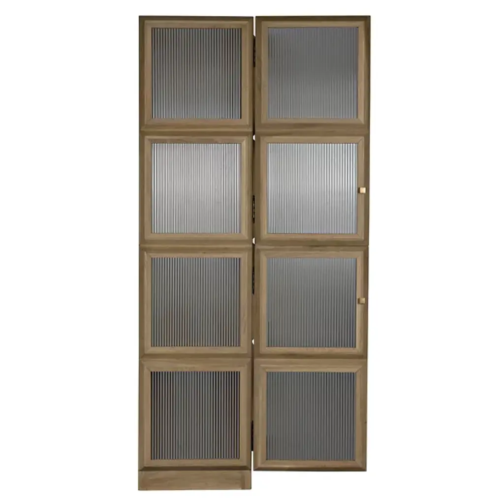 The Collins Hutch from Noir showcases modular design through individual door panels arranged in two tiers, each featuring ribbed glass inserts that create rhythmic vertical lines across the framework. Deep faceted door fronts add dimensional interest while the ribbed glass inserts provide textural contrast against the smooth wood surfaces. Brass pull knobs accentuate each compartment with warm, metallic touches. The substantial scale and geometric organization make this storage piece function as room architecture, while fixed shelving in both top and bottom sections provides a reliable interior structure for organized display.