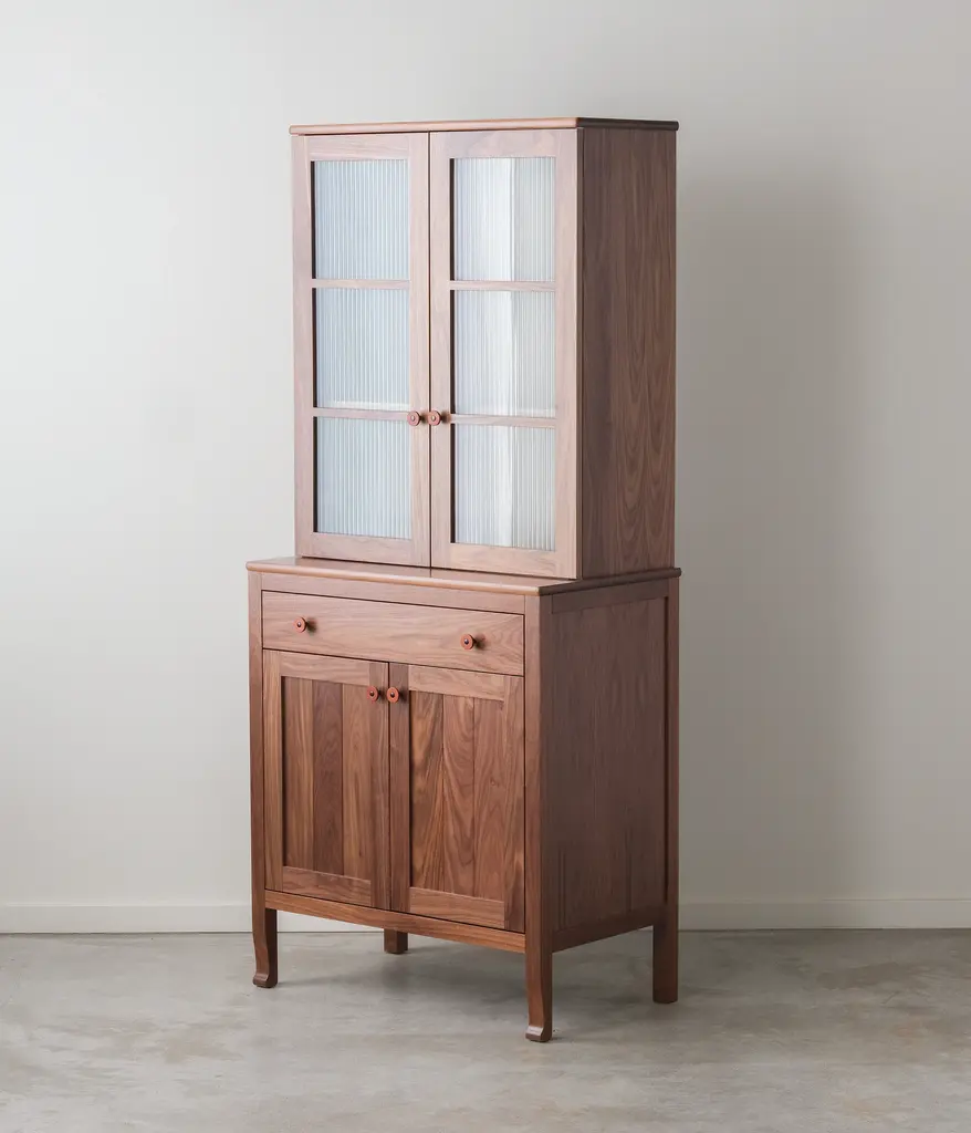 The Palmer media console features fluted glass door panels with leather pulls. There are two adjustable shelves and two cord cutouts in the back of the cabinet for cord management.
