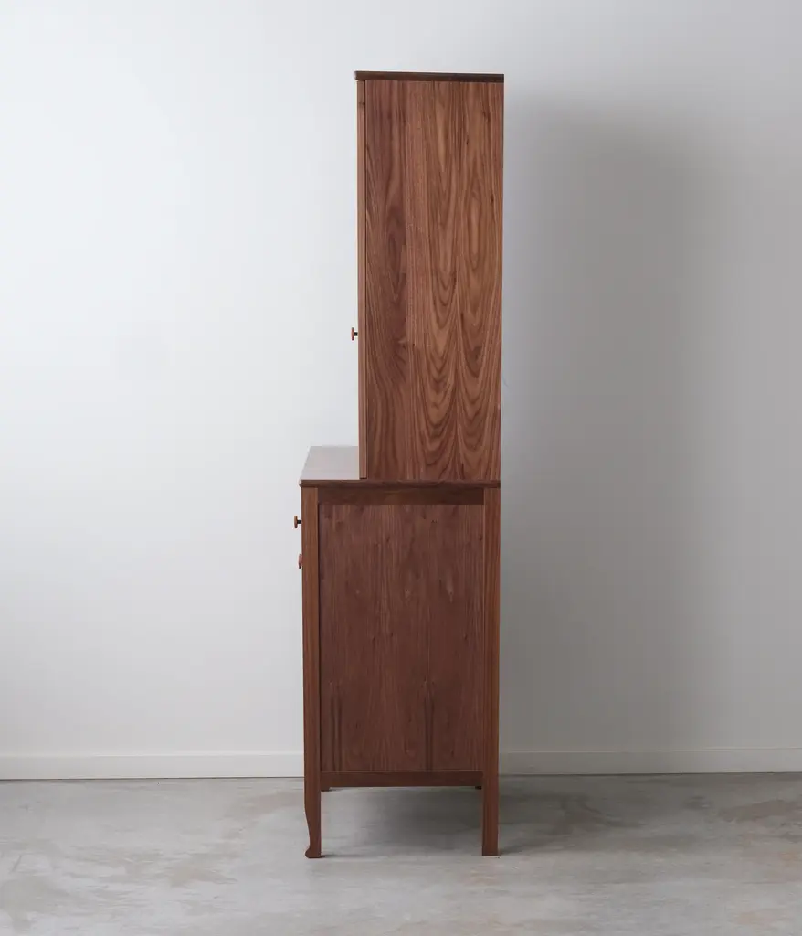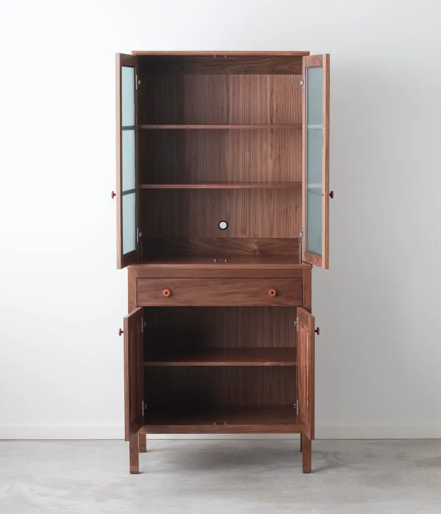 The Palmer media console features fluted glass door panels with leather pulls. There are two adjustable shelves and two cord cutouts in the back of the cabinet for cord management.