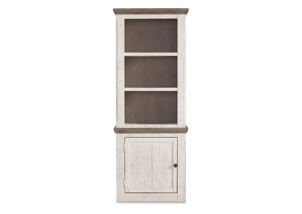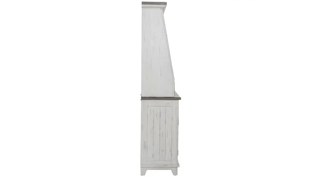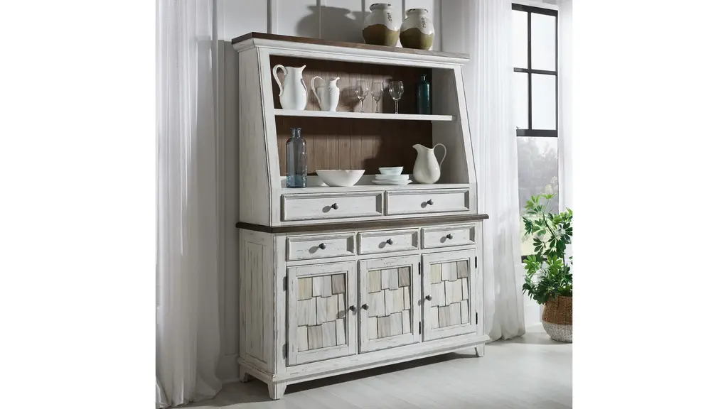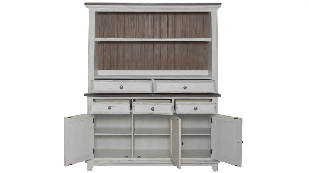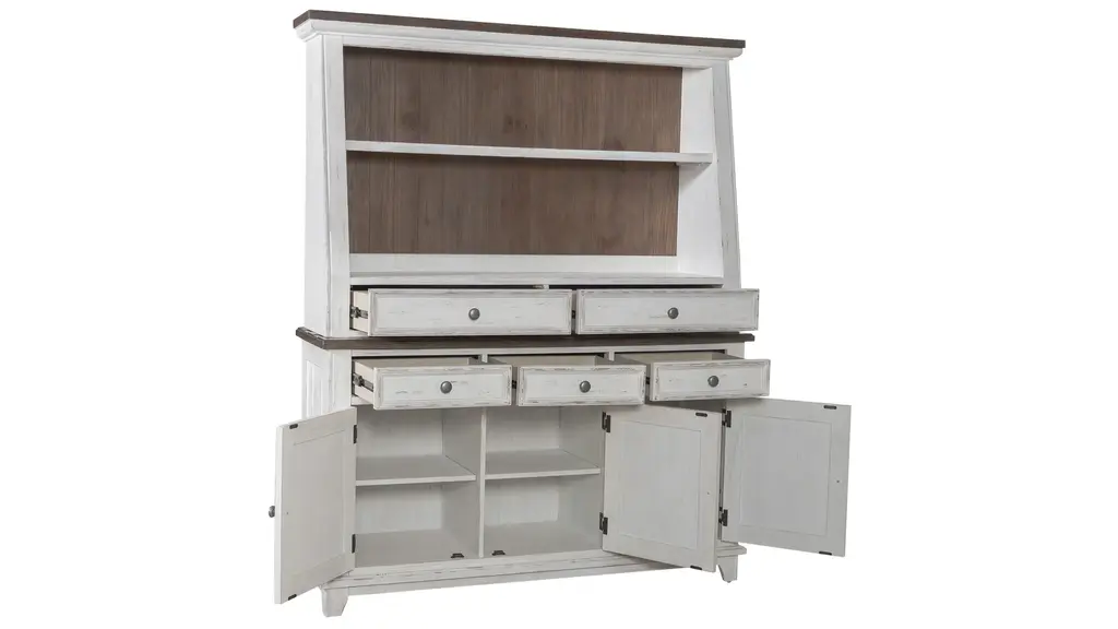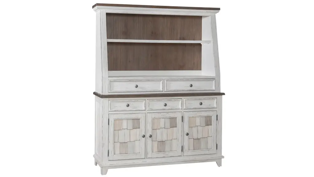 The River Place server and hutch strikes the perfect balance of life on the coast and a comfy home tucked away in the hills. Crafted with Pine solids and veneers, this set features a heavily distressed Riverstone White and Tobacco finish. The server has three wood framed doors with unique shingle accents that feature color tons of white, gray, and brown that blend effortlessly with the Riverstone White and Tobacco finish for a unique design. Each door opens to reveal one adjustable wood shelf. There are three full extension drawers with wood framed drawer fronts that feature premium felt lining and the added luxury of soft closing drawer guides. The center drawer is equipped with a removable felt lined silverware tray. The top and side panels feature a high-low veneer pattern for added dimension and flow into angled tapered feet. The angled server hutch has a leaning design and features a heavy top crown. There are two full extension drawers with wood framed drawer fronts that offer premium felt lining and the added luxury of soft closing drawer guides. The fixed open wooden shelf is the perfect place to beautifully display your items against the planked back panel in the Tobacco finish that blends effortlessly with the Riverstone White finish. Accented with custom Antique Pewter knob hardware, the River Place Server and Hutch creates an inviting airy atmosphere in your home while providing comfort in your own private getaway.