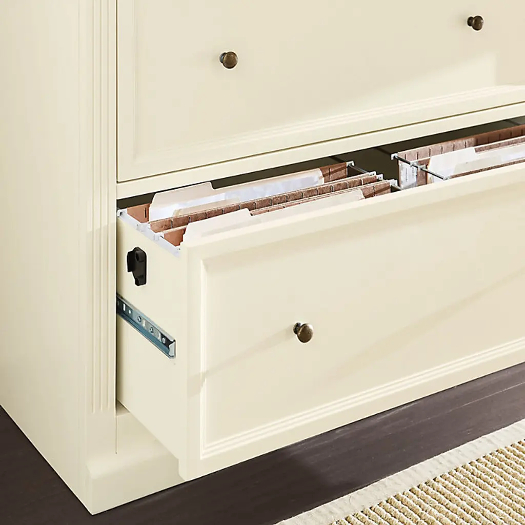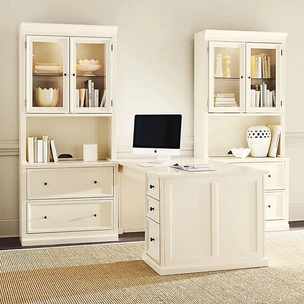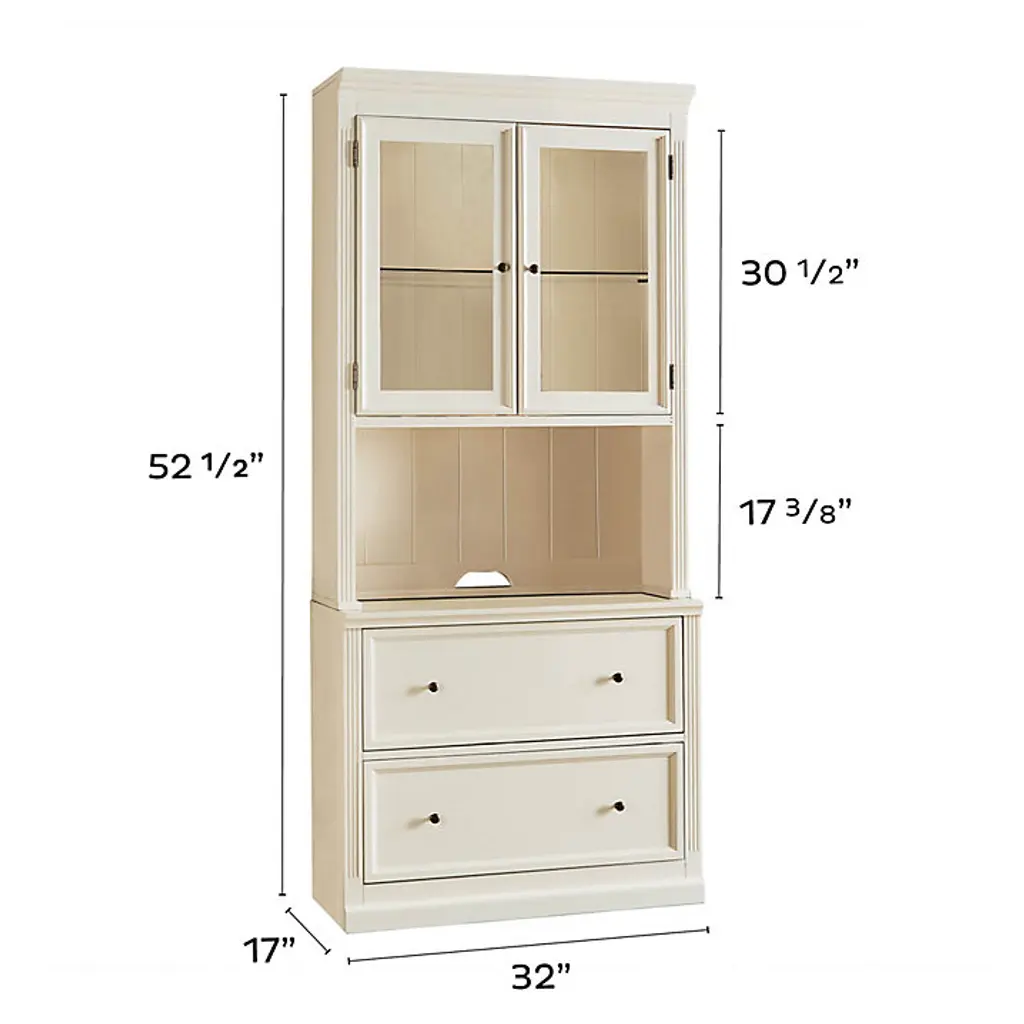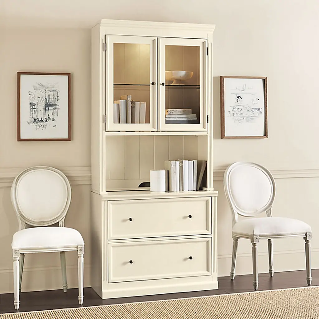 Our modular Tuscan office furniture collection blends modern versatility with the classic looks of a custom built-in. Each piece works with every other, so you can design a home office, media center or storage solution to fit your space and needs perfectly. The double lateral File Console holds letter or legal files, and pairs with the Tuscan File Hutch to create vertical display area and file storage in a space-saving footprint. File cabinet multi-tasks as a printer stand. Hutch's beveled glass doors and a built-in light above the adjustable glass shelf showcase the contents. Light adjusts to three levels with a simple touch. Stand multiple Hutches side-by-side to make a custom-length hutch/credenza with as much file storage as you need. Flush sides make it seamless and easy. Tuscan File Console and Hutch features: Plinth base & fluted corner railsFile Console features full extension metal drawer glidesHutch has paneled interior & cord managementCrafted with solid wood frames & fine veneersAntique brass finish hardwareIncludes 1 halogen light bulbSwatches availableLevelers for perfect alignmentDownload free Design Guide under "More Details" tabSome assembly required (hutch attaches on back with metal plates)