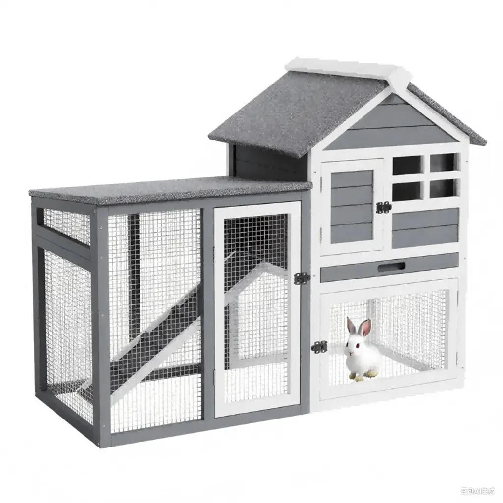 This large rabbit hutch combines style with function, giving small animals like rabbits and guinea pigs a spacious and secure spot to chill. With its modern grey and white look, it fits right into any outdoor area, so your pets can enjoy a comfy habitat while sprucing up your garden. Sturdy Construction: Made from solid fir wood, ensuring it lasts even under tough conditions. This rabbit hutch is tough enough to handle heavy use, making it a solid shelter for your pets.Weatherproof Design: The hutch stands strong against rain, snow, and UV rays, so you can relax knowing your pets are safe outside. It’s wise to cover it for prolonged use in extreme weather to extend its lifespan.Spacious Living Area: With generous dimensions of 57.1 x 17.7 x 33.1 in, it gives plenty of space for your small animals to explore and chill in comfort.Safety Features: With raised perches and lockable doors, the hutch protects your pets from predators and enhances their safety.Easy Assembly: Comes with simple tools and all necessary hardware, allowing two people to set it up quickly, making it a great choice for busy pet owners.