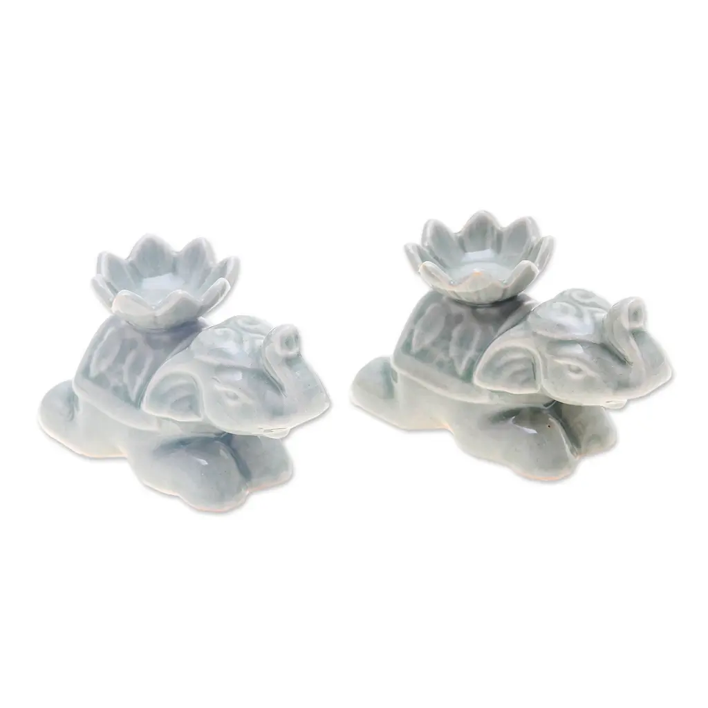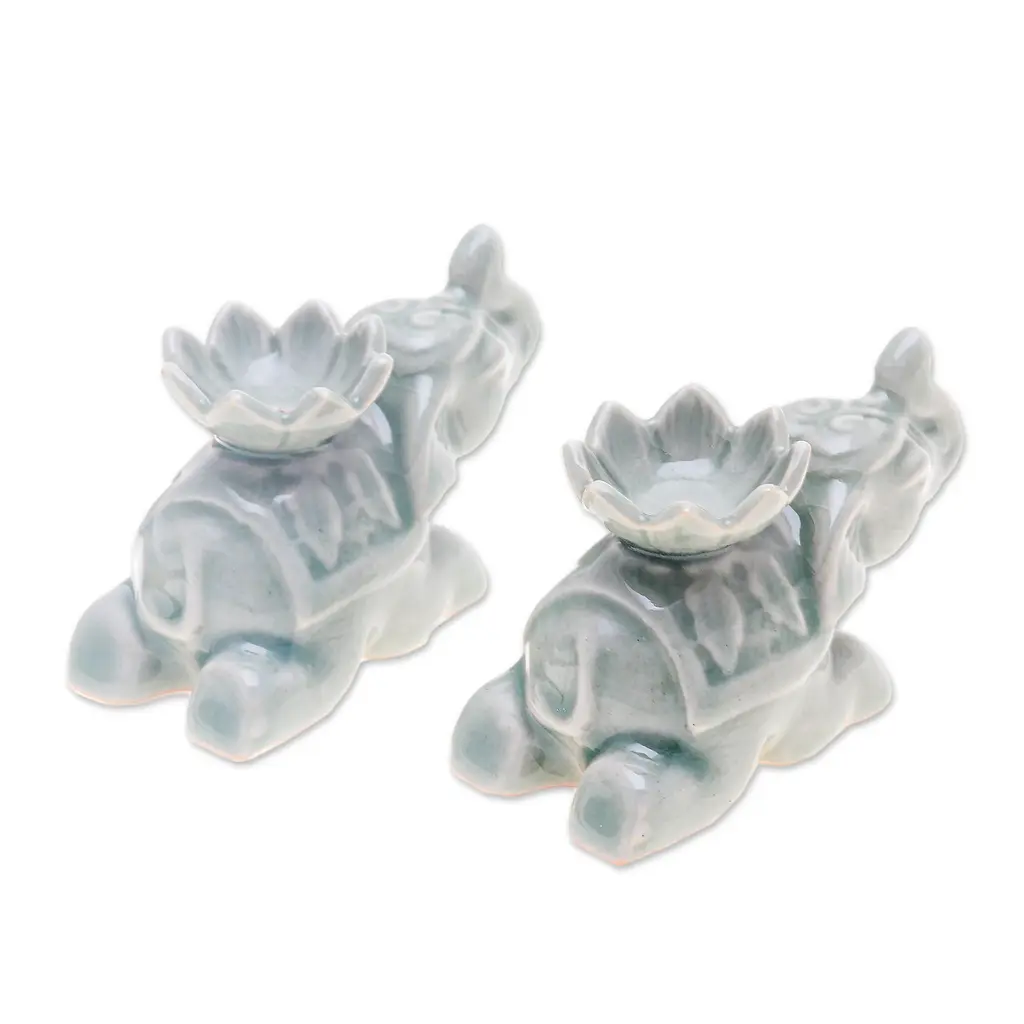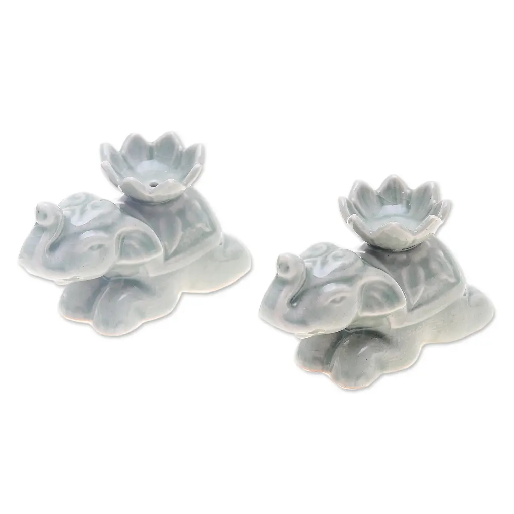 2 Elephant-Shaped Green Celadon Ceramic Incense Holders- Green Pachyderm Beauty