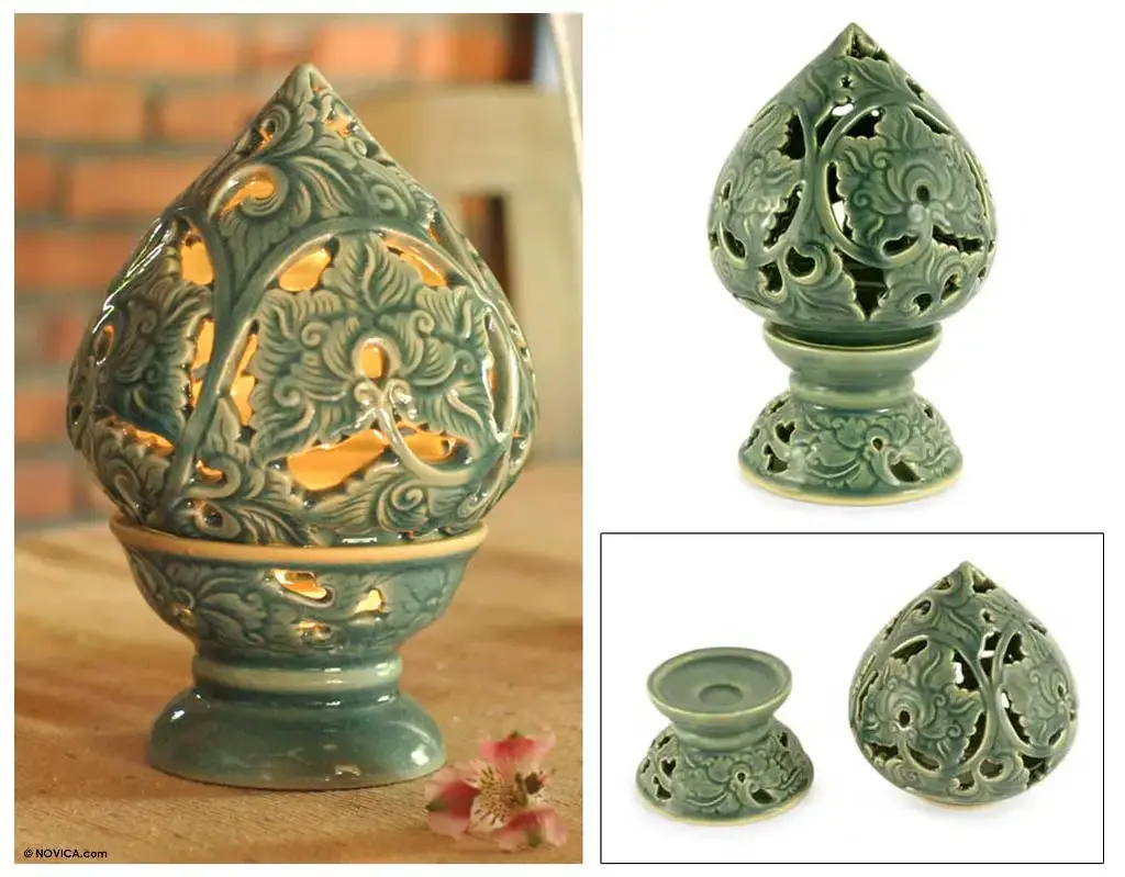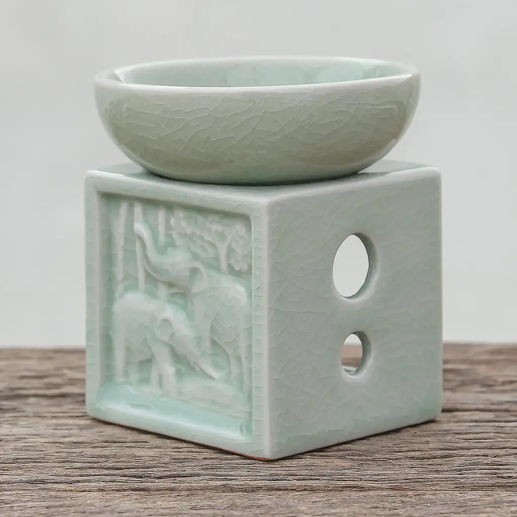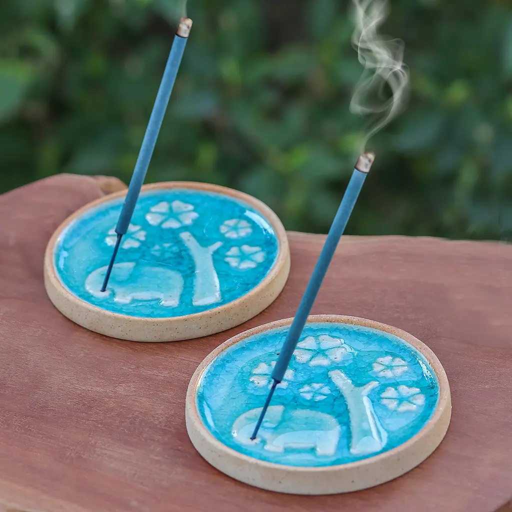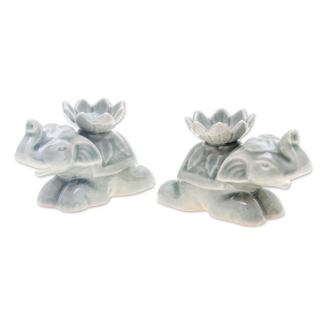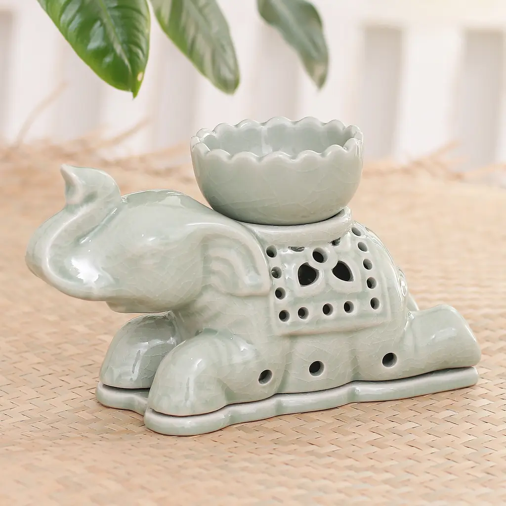 Resting peacefully with lotus flowers balanced on their backs, these green ceramic elephant incense holders blend cultural symbolism with practical artistry. The distinctive crackled glaze creates a web of delicate lines across each figure, adding depth and character to the serene pachyderms. Versatile in function, each handcrafted piece cradles both incense sticks and cones with equal grace, releasing fragrant tendrils of smoke through the sacred lotus, a poetic nod to Thailand's rich spiritual heritage. Artisan Charoensri captures the elephant's gentle strength and the lotus's pure beauty in these wonderful accessories that bring tranquility to any space.
