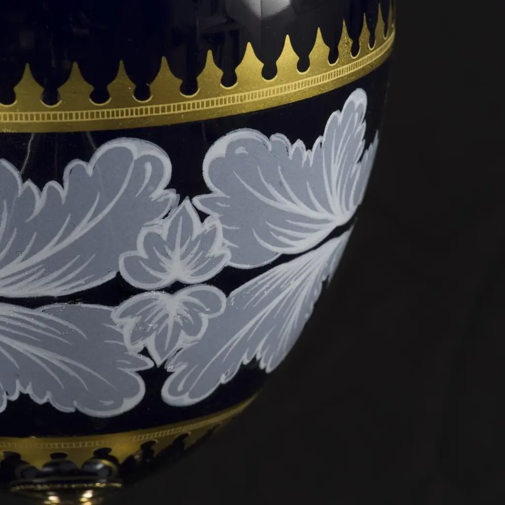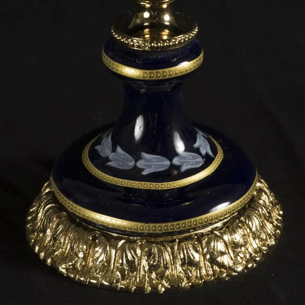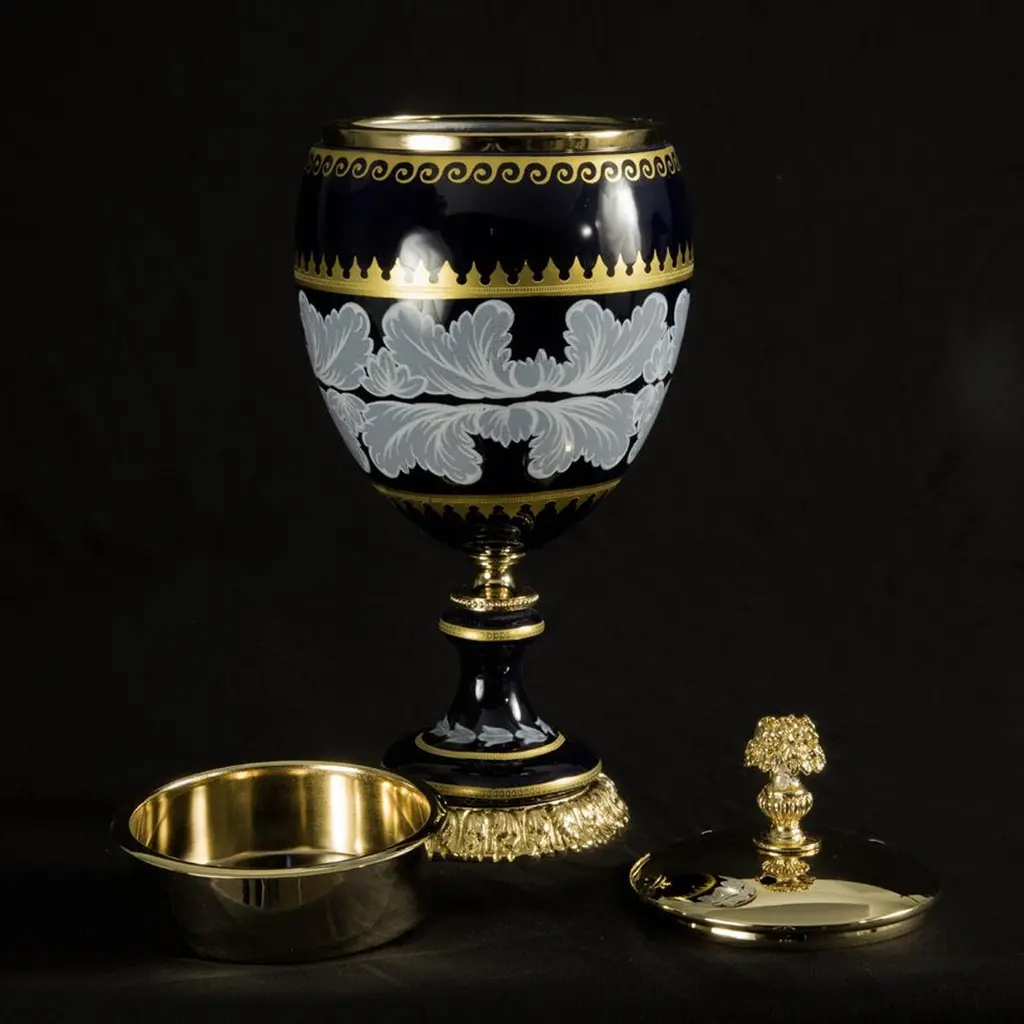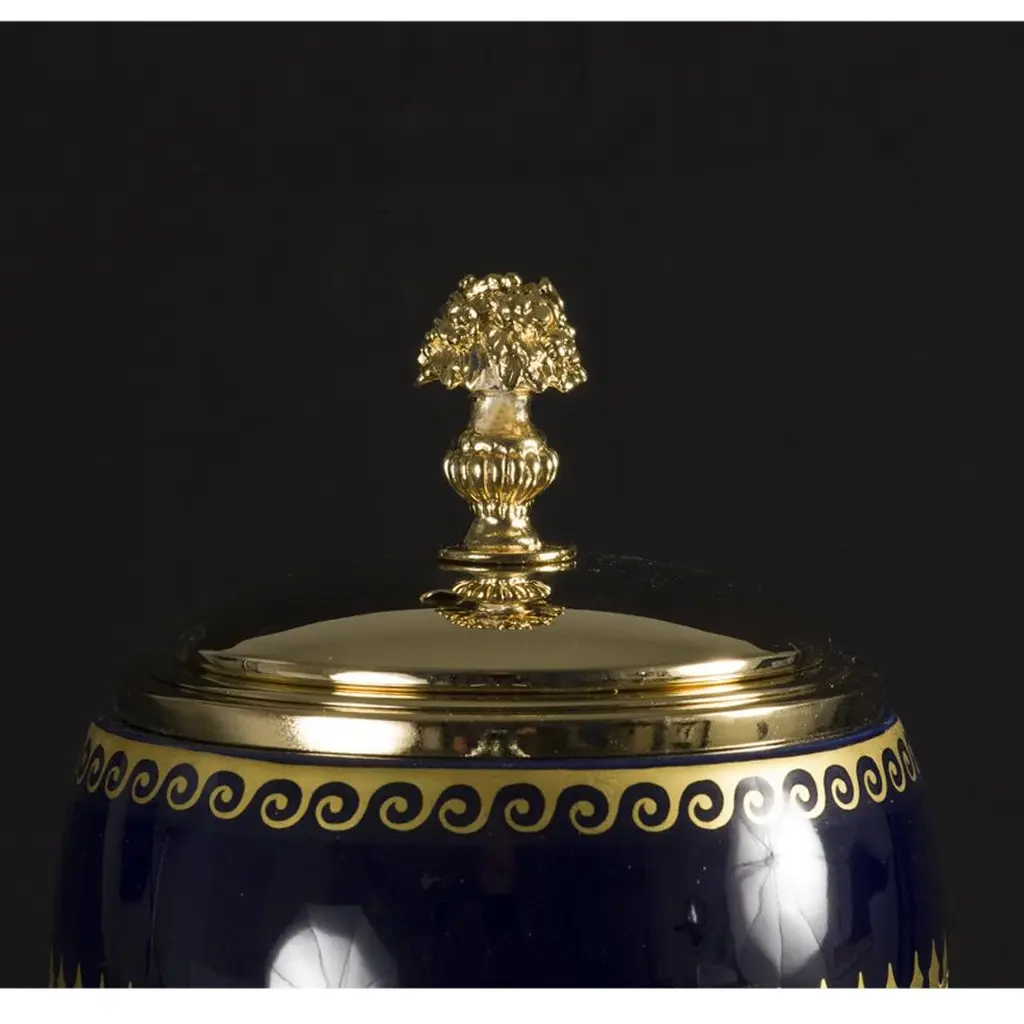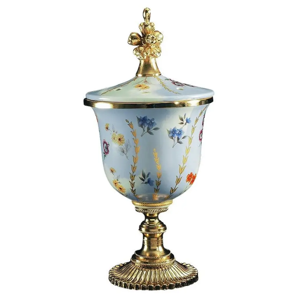 Incense burner in decorated blue porcelain, and pure gold decorations and white flowers, golden metal in lost wax casting. A metal container has been created inside the porcelain cup to burn the incense. Holes have been created above the lid to allow the perfume to come out and spread its aroma into the surrounding environment. Each object is handcrafted and the care for every detail makes each item unique in its kind. Also Oggetti d'Arte will follow with the same passion the request of the most qualified studies of interior architecture from around the world, helping them in achievement of their most ambitious projects.This incense burner, at the customer's request, can be made with different metal finishes and with different porcelain colors so that it can be inserted in the best possible way within your furniture.