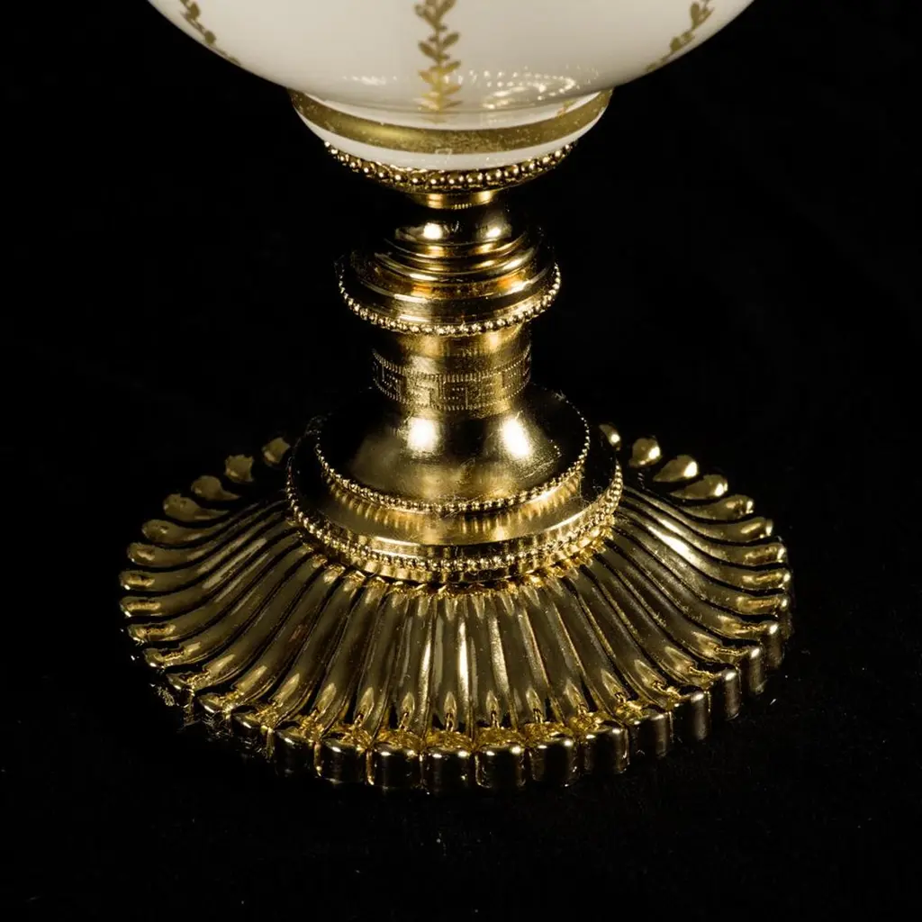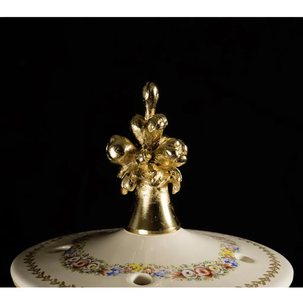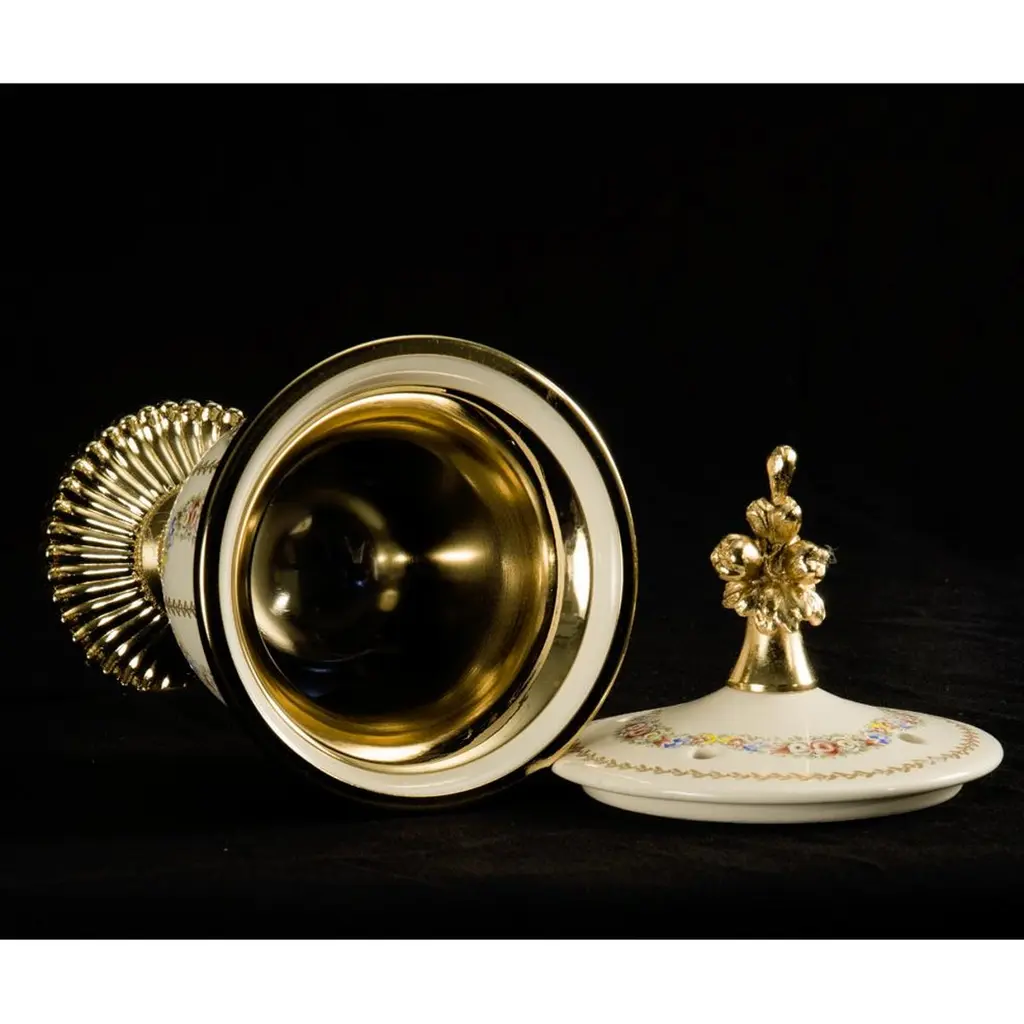 Incense burner in decorated ivory porcelain and pure gold decorations and flowers, golden metal in lost wax casting. A metal container has been created inside the porcelain cup to burn the incense. Holes have been created above the lid to allow the perfume to come out and spread its aroma into the surrounding environment. Each object is handcrafted and the care for every detail makes each item unique in its kind. Also Oggetti d'Arte will follow with the same passion the request of the most qualified studies of interior architecture from around the world, helping them in achievement of their most ambitious projects.This incense burner, at the customer's request, can be made with different metal finishes and with different porcelain colors so that it can be inserted in the best possible way within your furniture.