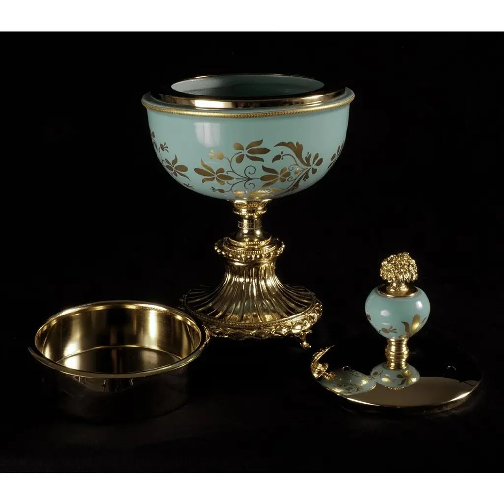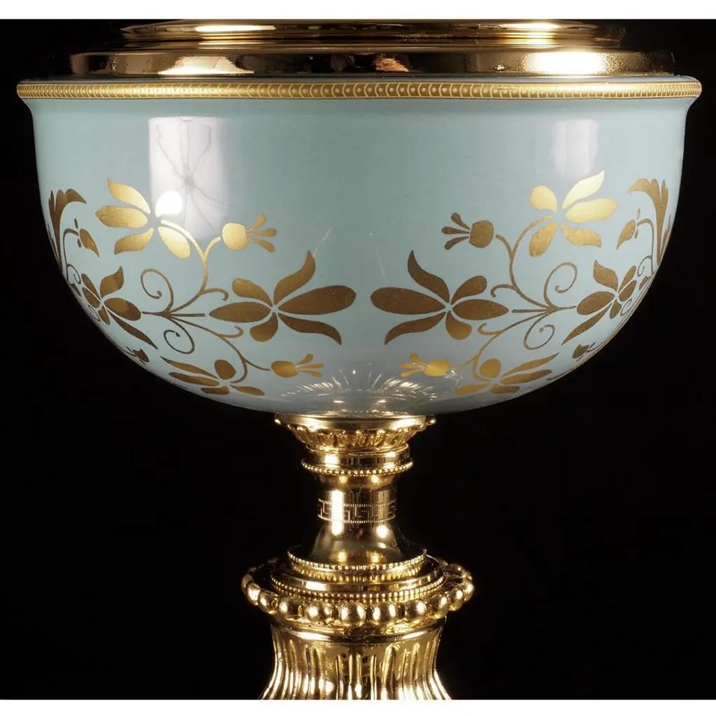 Incense burner in decorated light green porcelain and pure gold decorations, golden metal in lost wax casting. A metal container has been created inside the porcelain cup to burn the incense. Holes have been created above the lid to allow the perfume to come out and spread its aroma into the surrounding environment. Each object is handcrafted and the care for every detail makes each item unique in its kind. Also Oggetti d'Arte will follow with the same passion the request of the most qualified studies of interior architecture from around the world, helping them in achievement of their most ambitious projects.This incense burner, at the customer's request, can be made with different metal finishes and with different porcelain colors so that it can be inserted in the best possible way within your furniture.
