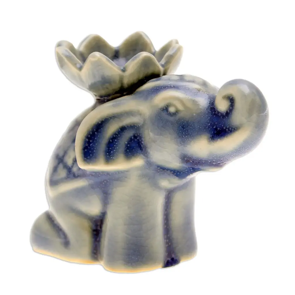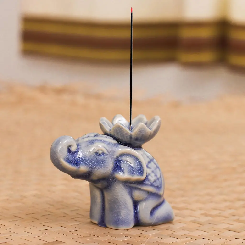 Blue Ceramic Elephant Incense Holder With Lotus Flower- Wise Friend