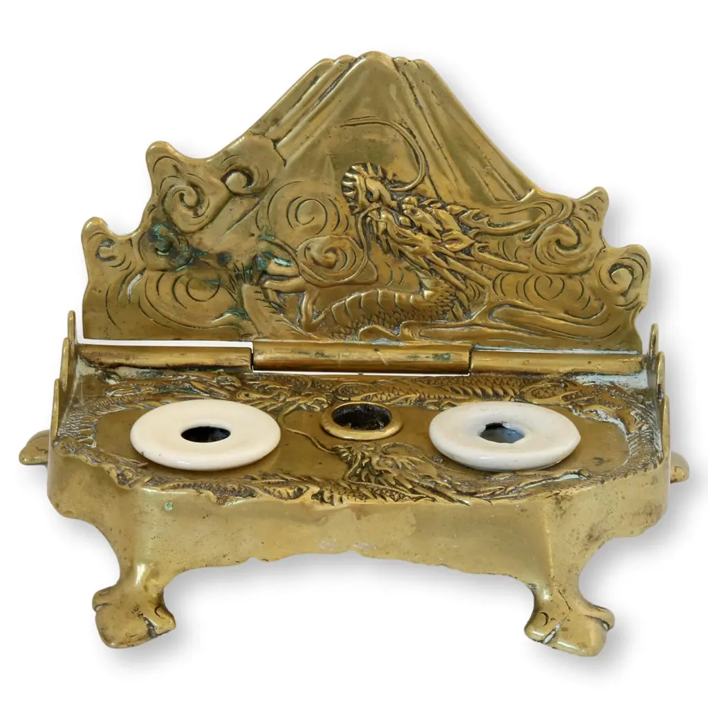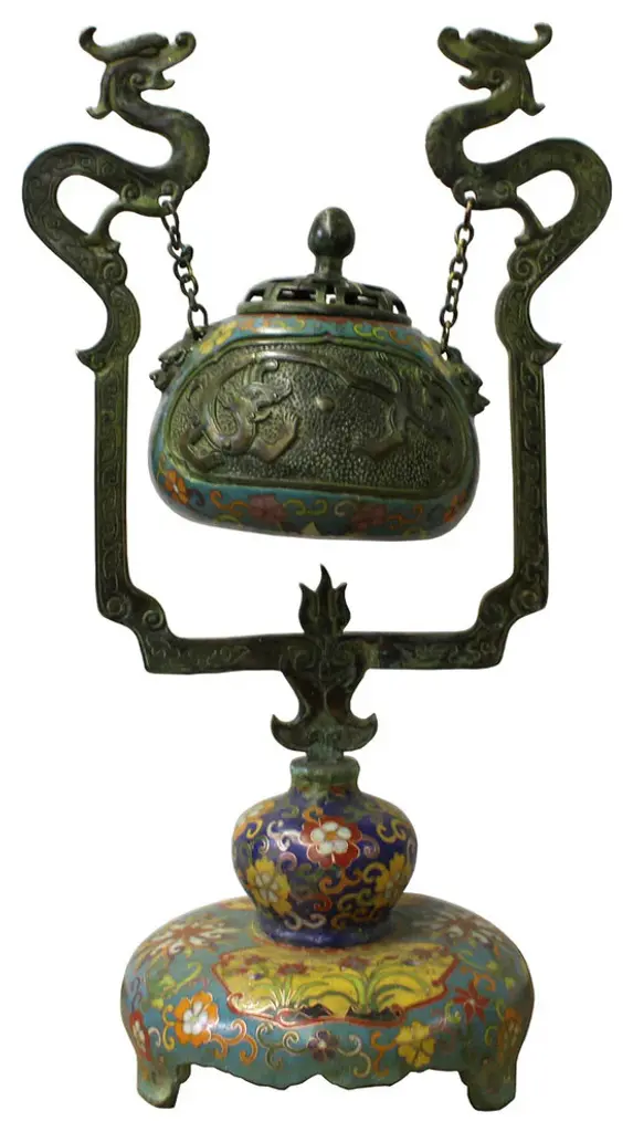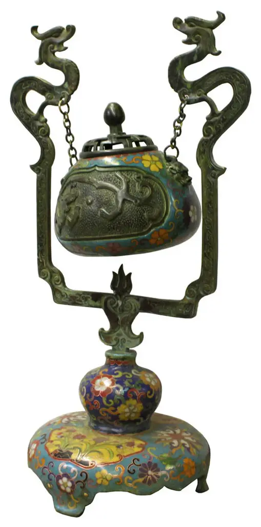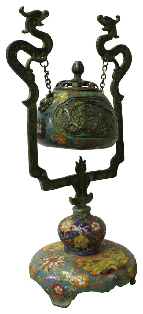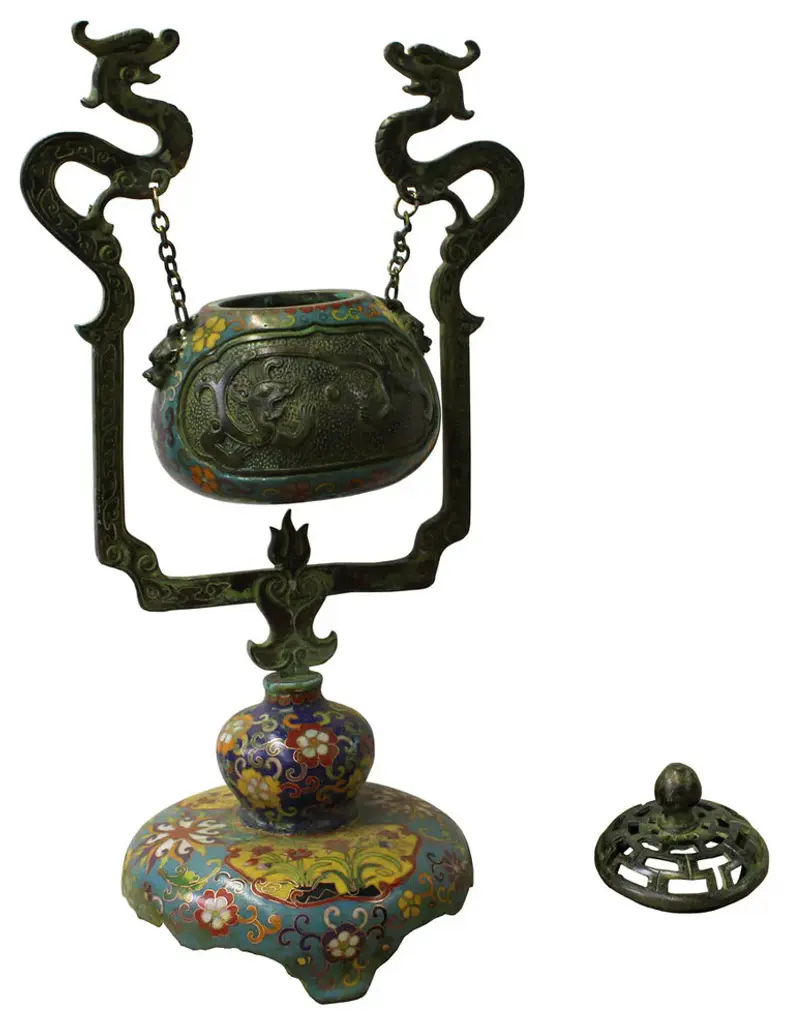 This is a traditional oriental Chinese incense burner made of metal and covered with blue multi-color enamel color. It is in double dragon heads hanging display style. There are floral pattern surrounding the greenish black metal relief motif. Dimensions: w10" x 7" x h18" approximate Origin: ChinaMaterial: MetalCondition: Handmade, Vintage style finish, wear out marks, minor color off, rustEra : Recent