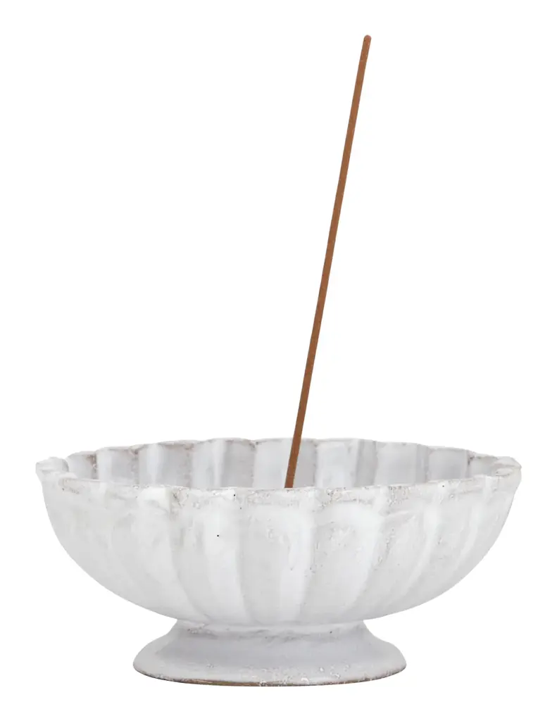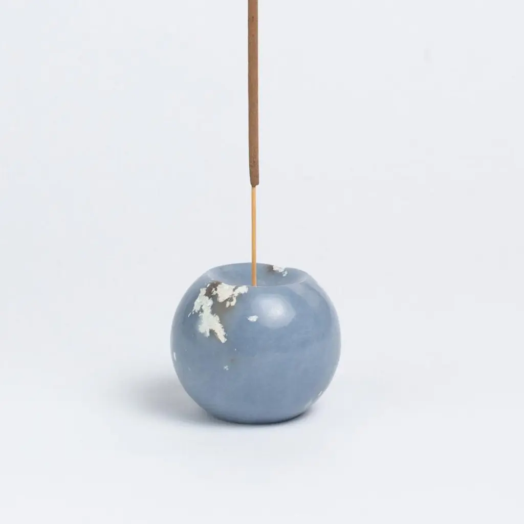 Handmade and full of purpose: celestine incense holder brings harmony to your spiritual space.Your favorite incense is grounded within the smooth sphere of Peruvian Angelite stone, hand-carved with stone carpentry techniques traditional to Perú and certified ethically hand-crafted by NEST. A flat base and slightly curved lip allow the waxing moon shaped incense holder to sit on any table top.Dimension: 2 x 2 x 2 inWeight: 0.5LbMaterial: AngeliteAbout this gemstone:• Carved from the ancient Andean Angelite stone with provenance from the Arequipa Andes of Perú.• This uplifting, soothing stone is said to carry a calming energy relating to the third eye and crown chakras, vibrating on clear communication and intuition.• This naturally occurring milky blue stone carries variations in tone and white flecks intermittently throughout the stone - no two stones are exactly alike.Handmade in Peru by DAR Proyectos.