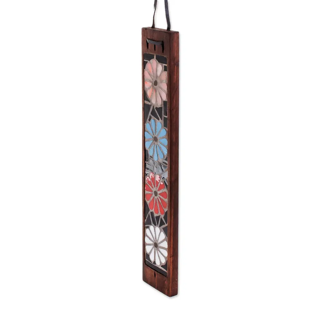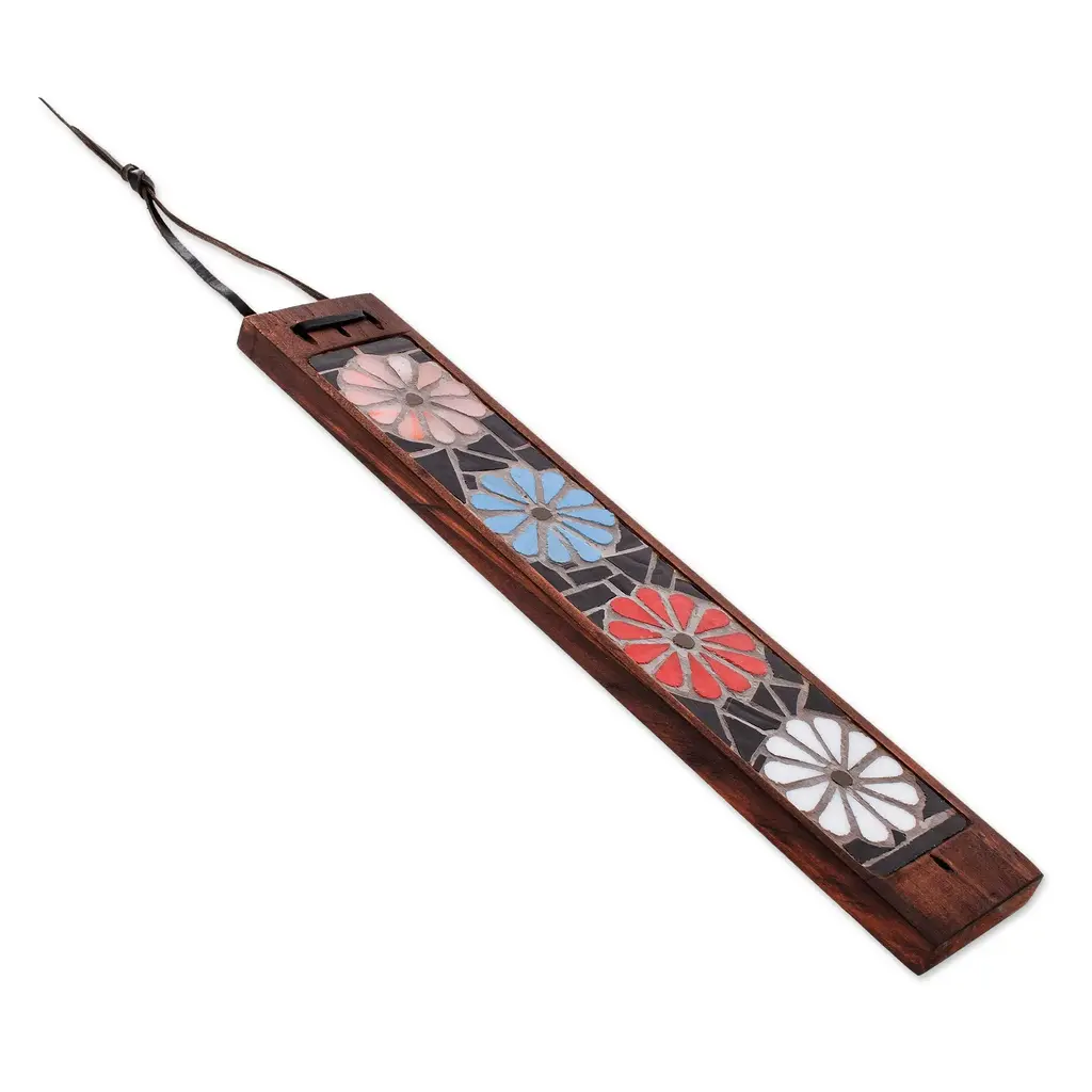 This delightful incense holder is from the Herrera Perlaza Family Artisans in Costa Rica. The holder is crafted from teak wood that has been inlaid with a floral glass mosaic. A hole at one end is ready to hold a stick of incense, and a cord at the other end lets you hang it up when not in use.