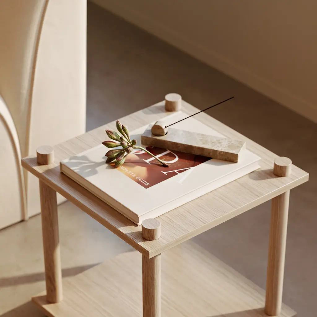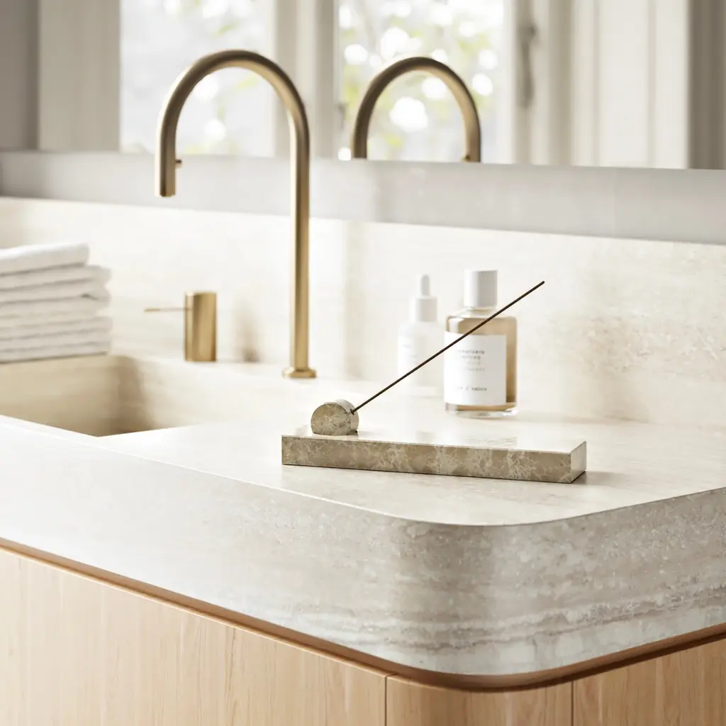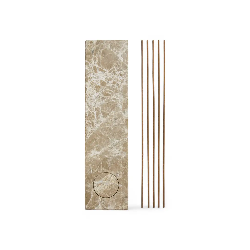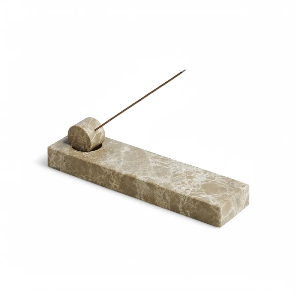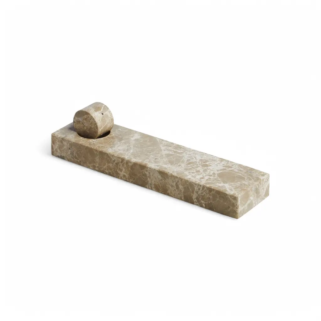A single block of light brown marble, carefully shaped into something both practical and visually sharp. The Monolith incense holder keeps things minimal but considered—every cut and detail has a function. The cylindrical piece slots into a hollow carved from the same stone, using its own weight and surface tension to hold an incense stick at just the right angle. The flat base works just as well for cones or a piece of lava rock with essential oil. It’s a small object, but it feels like it belongs—on a desk, a shelf, or next to a favorite chair.