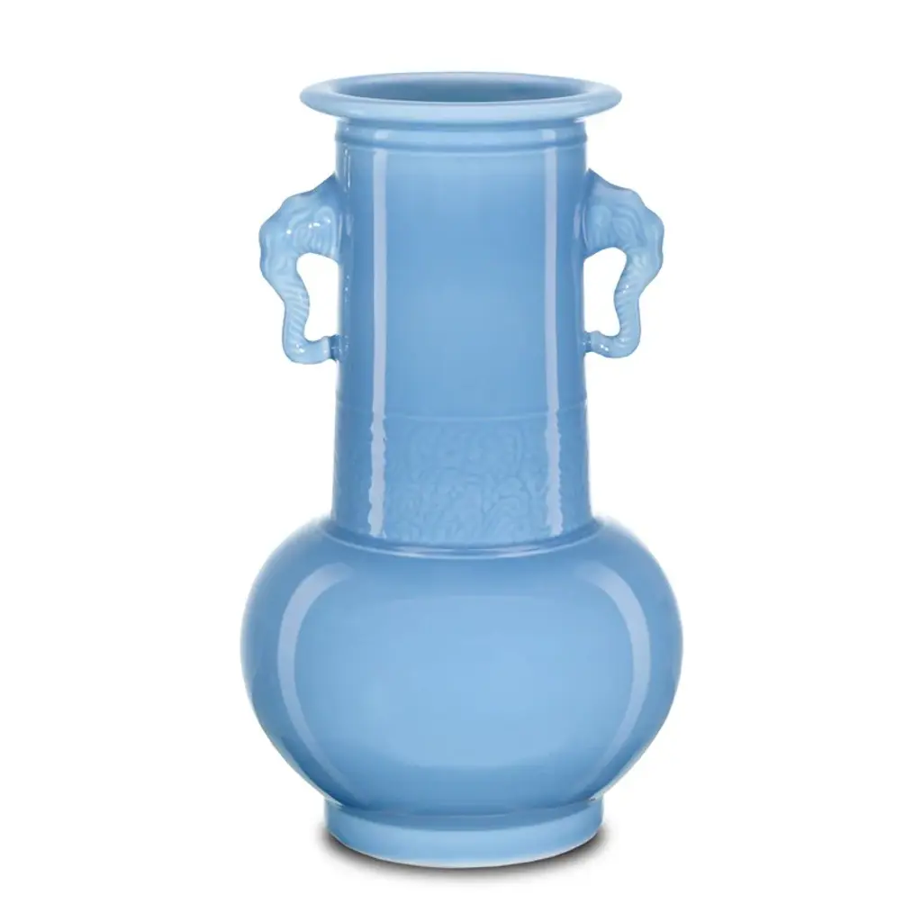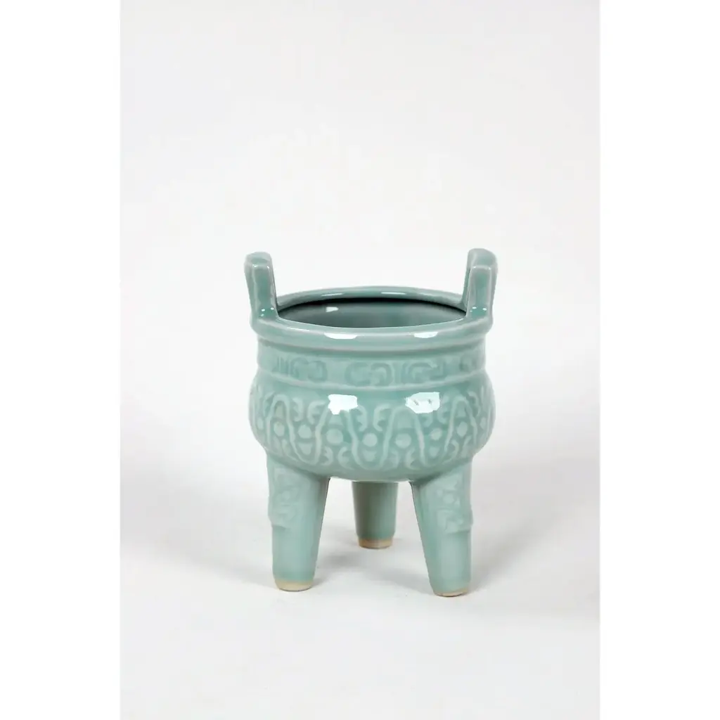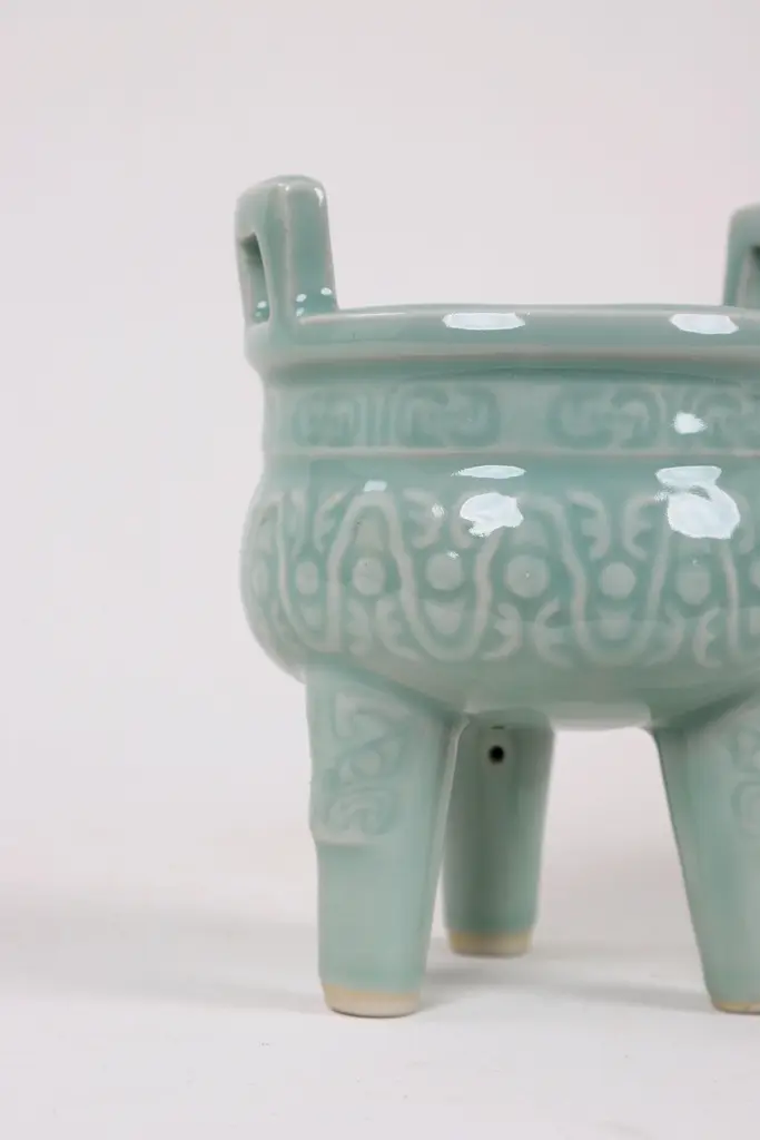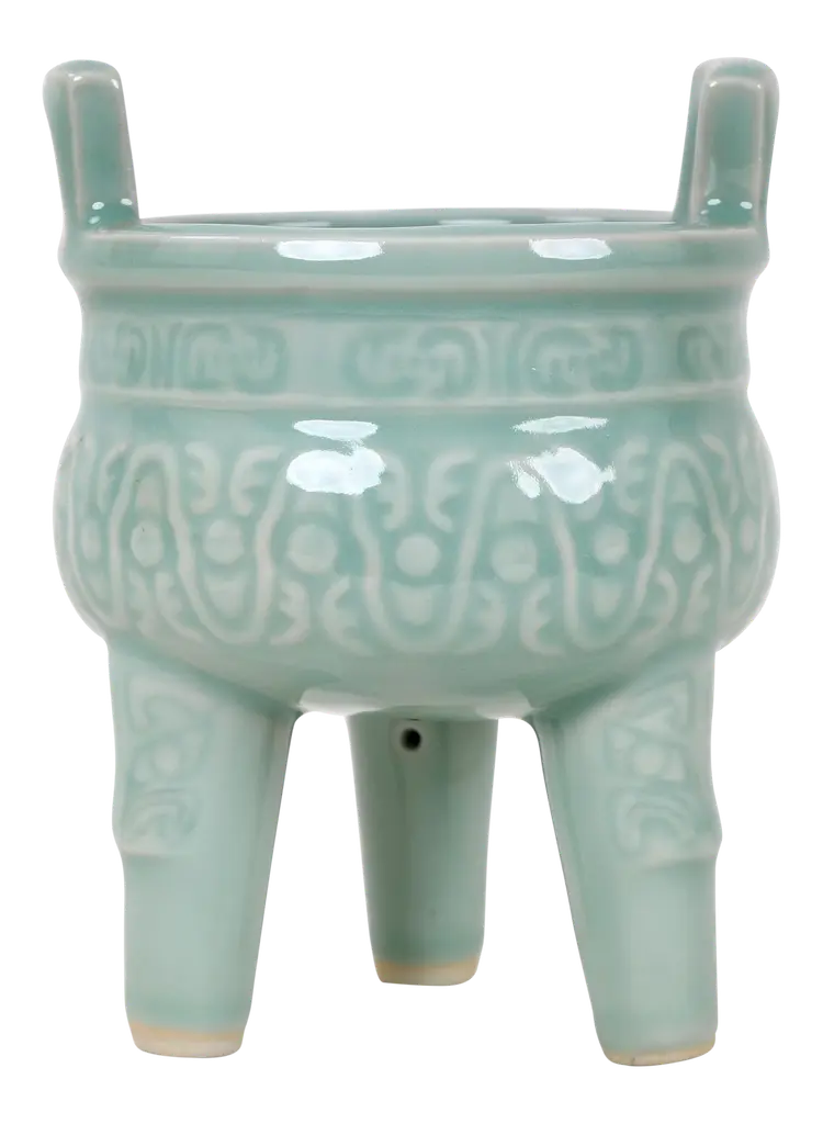 This Celadon vessel is a tripod cauldron with two facing handles. It is an important shape in Chinese rituals. Its rounder shape gives it a more primitive air. Can be use as an incense burner or cachepot.