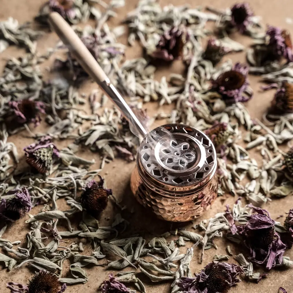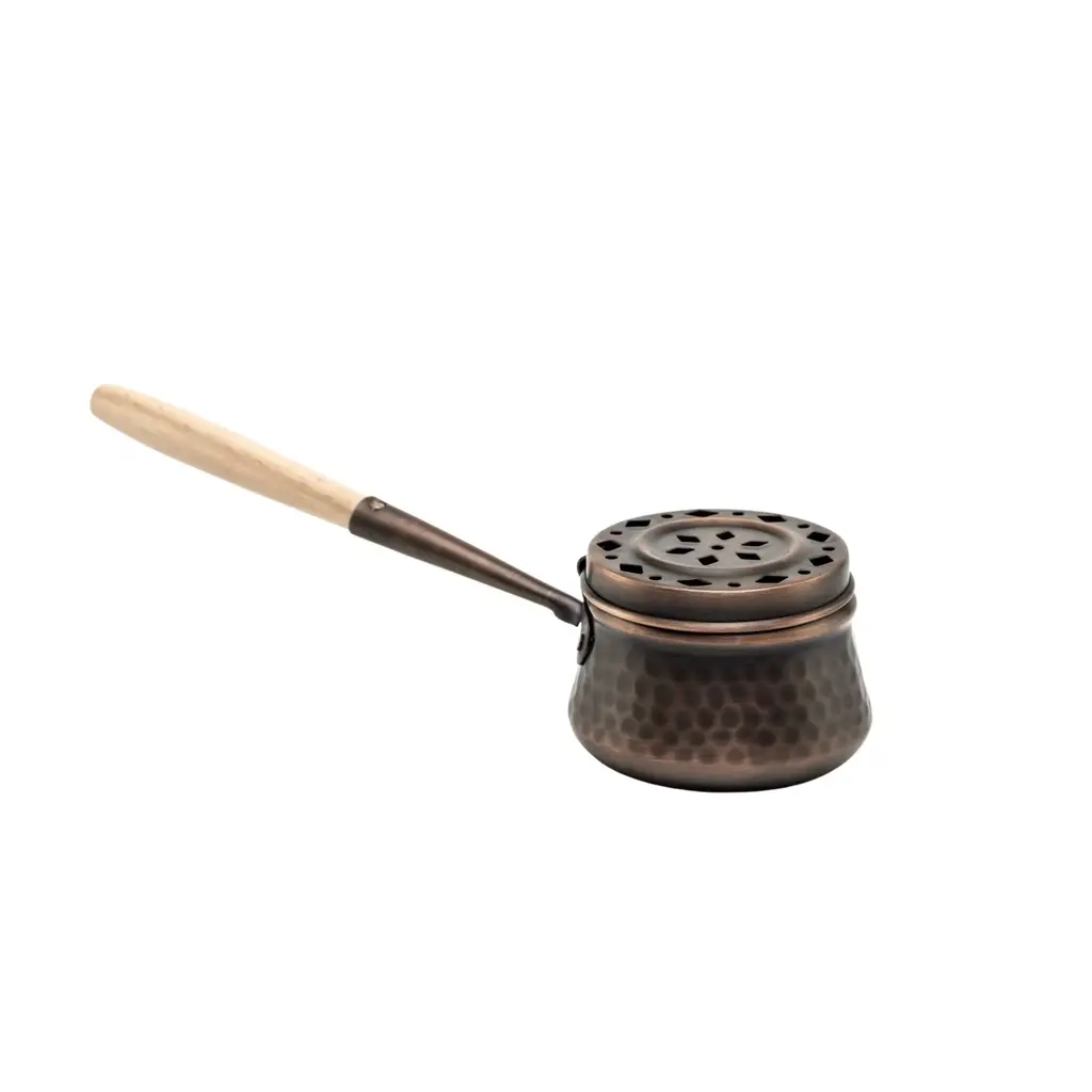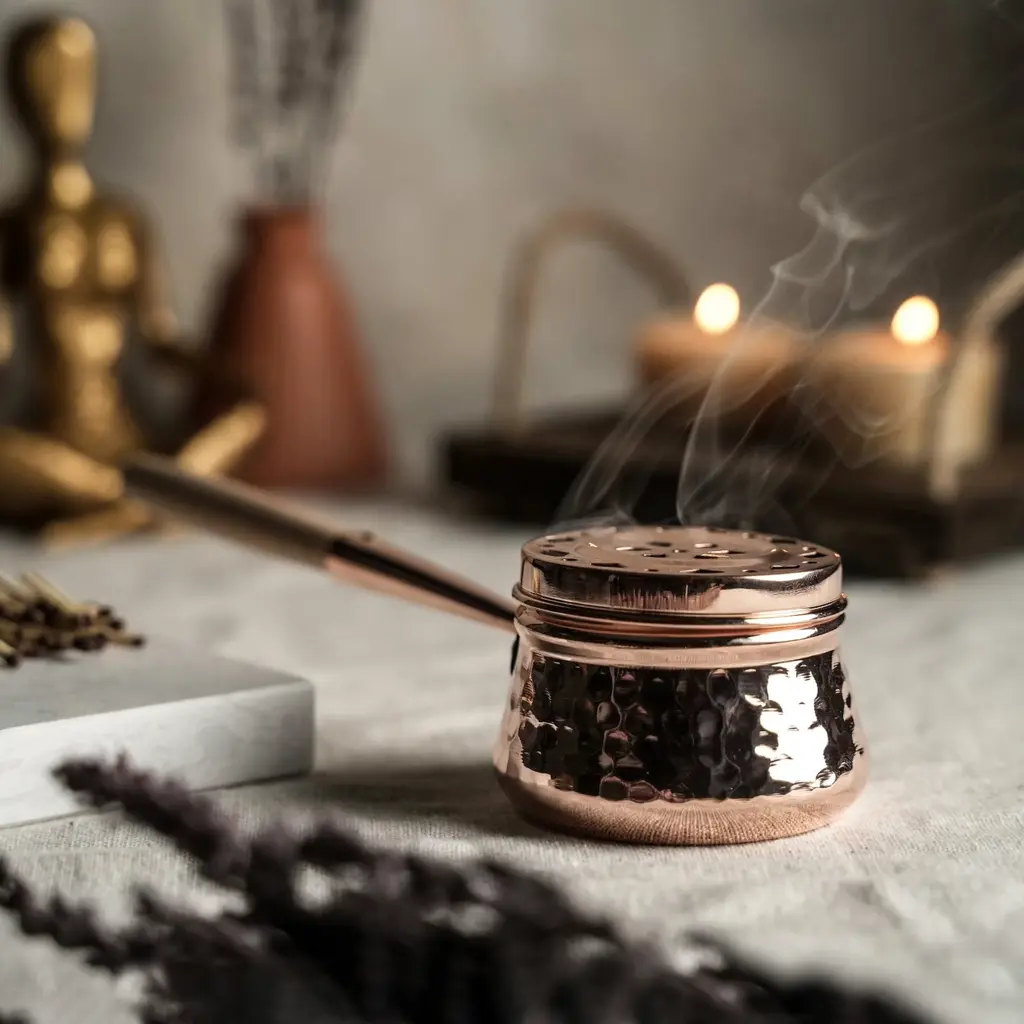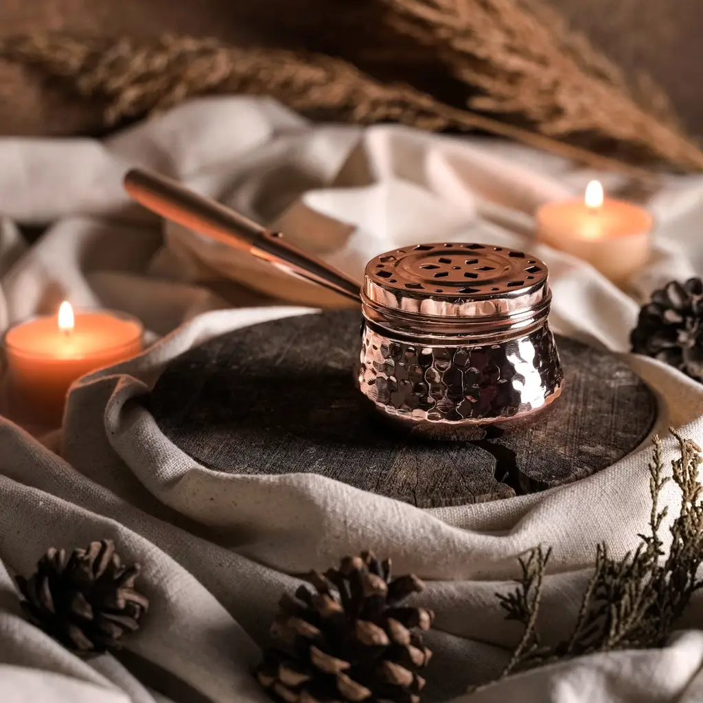 Transform your space into a sanctuary of tranquility with this Handcrafted Hammered Copper Incense Burner. Meticulously designed from 100% copper, its hammered finish exudes artisanal charm, while the perforated lid ensures controlled and even diffusion of incense smoke. The ergonomic handle allows for easy and safe use, making it ideal for cleansing rituals, aromatherapy, or creating a calming ambiance in your home. This incense burner is not only functional but also a beautiful decorative piece that adds a touch of elegance to any room.