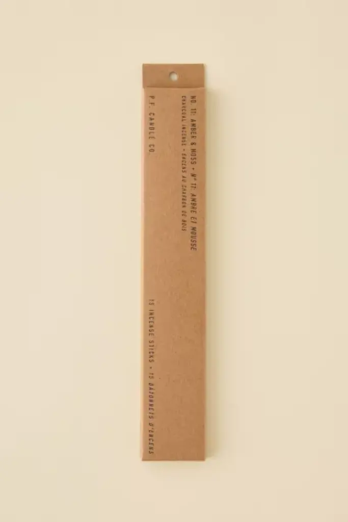 Diffuse entrancing scents throughout your space with P.F. Candle Co.’s incense sticks. These charcoal incense sticks are hand-dipped in phthalate-free fine fragrance oil that offers a moderate scent throw in your space. **Scents** \- Amber & Moss: moss, lavender, sage, orange, lavandin, amber, musk \- Coconut Grove: Coconut water, citron, crushed coconut leaf, pink musk \- Golden Coast: eucalyptus, sea salt air, lime, white lavender, sage, redwood, fir, palo santo **Content + Care** \- Includes 15 incense sticks \- Charcoal, phthalate-free fine fragrance oil \- Imported **Size** \- Burn time: 1 hour \- Dimensions: 10.75"h