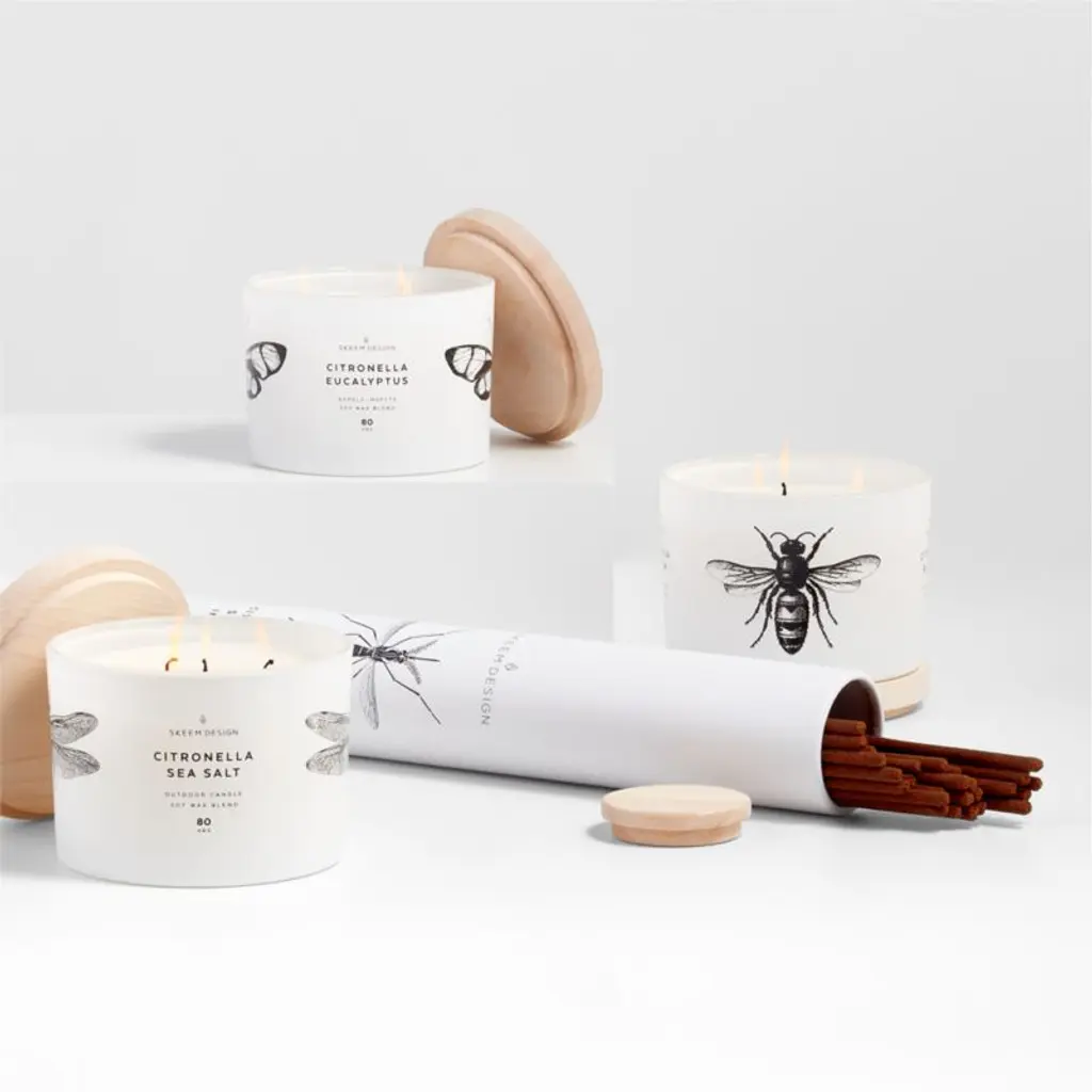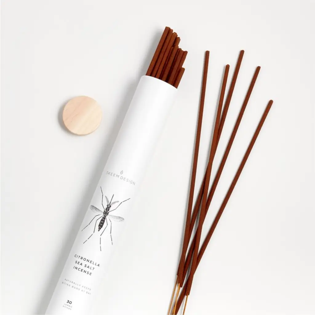 Add fresh fragrance to outdoor cocktail hours or alfresco meals with these delightfully scented citronella incense sticks. The 30 hand-dipped sticks waft the fresh scents of jasmine, sea salt, citrus, ocean air and lemongrass-derived citronella over your porch, patio or picnic table. Printed with a vintage-inspired illustration, the white tube is topped with a wooden lid. These charmingly packaged sea salt citronella incense sticks make a lovely gift for the host of an outdoor gathering.
