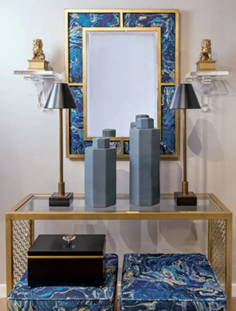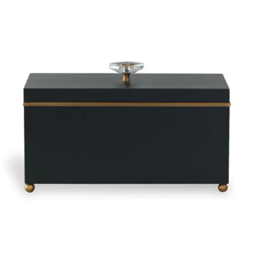 Finished in black lacquer and beautifully offset by a crystal knob and warm pops of aged brass hardware, this rectangular box keeps jewelry, cuff links, and other small valuables safe and stylish.