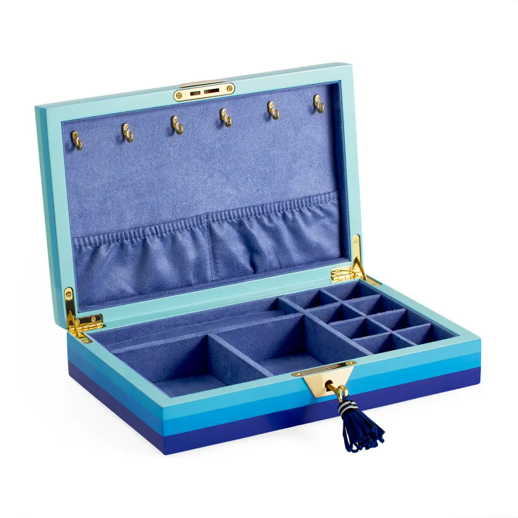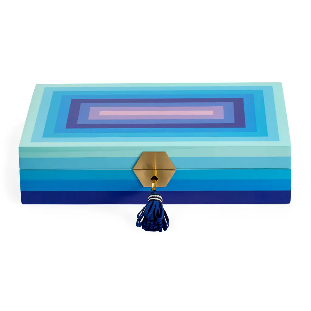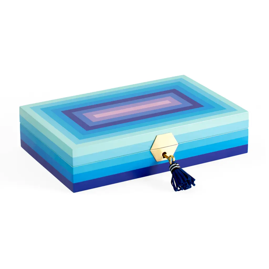 Heavenly Hues.Featuring 60s inspired concentric squares in high-gloss blues and lavenders, our hand-finished Scala Lacquer Jewelry Box gives your baubles a polished place to rest. Featuring a luxe, periwinkle velvet-lined interior. Front key-closure marked with our signature hexagonal brass-plated keyplate. Item #32868