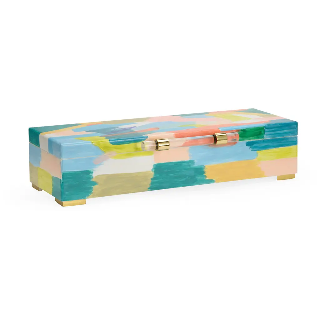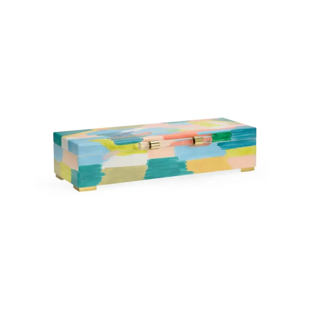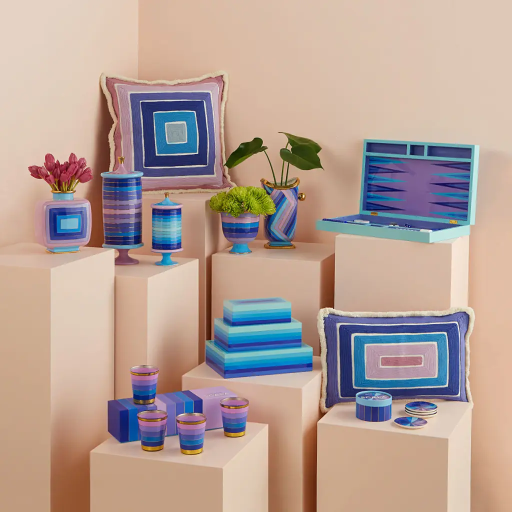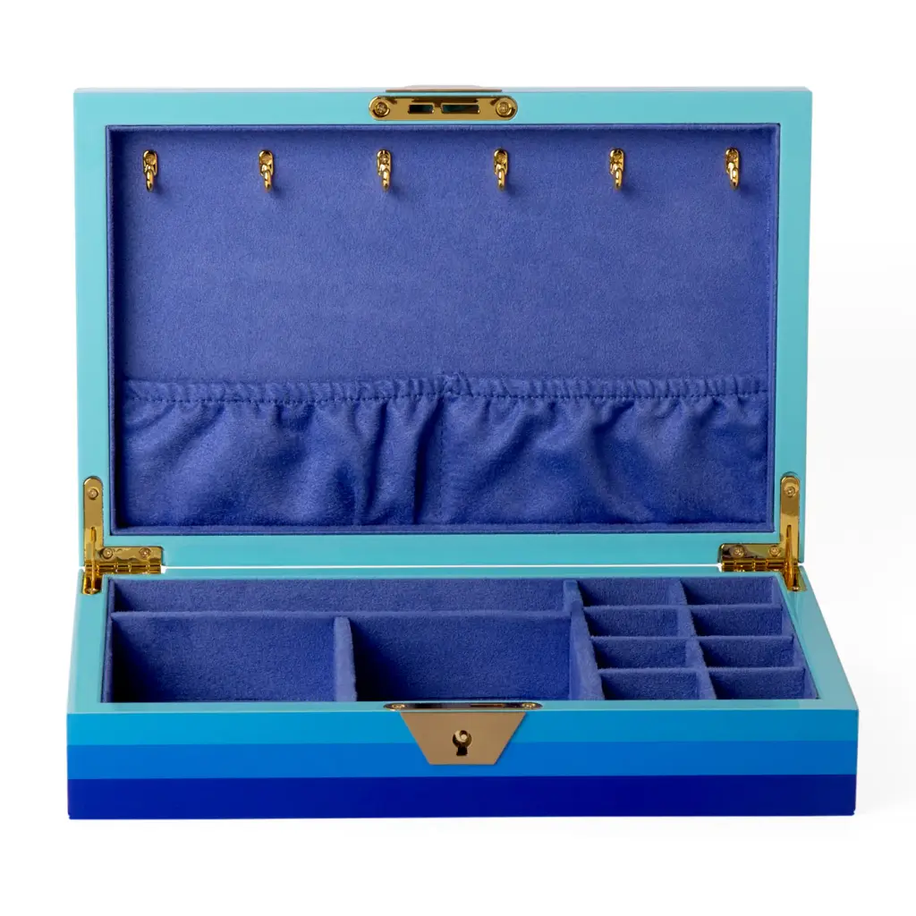 Heavenly Hues.Featuring 60s inspired concentric squares in high-gloss blues and lavenders, our hand-finished Scala Lacquer Jewelry Box gives your baubles a polished place to rest. Featuring a luxe, periwinkle velvet-lined interior. Front key-closure marked with our signature hexagonal brass-plated keyplate. Item #32868