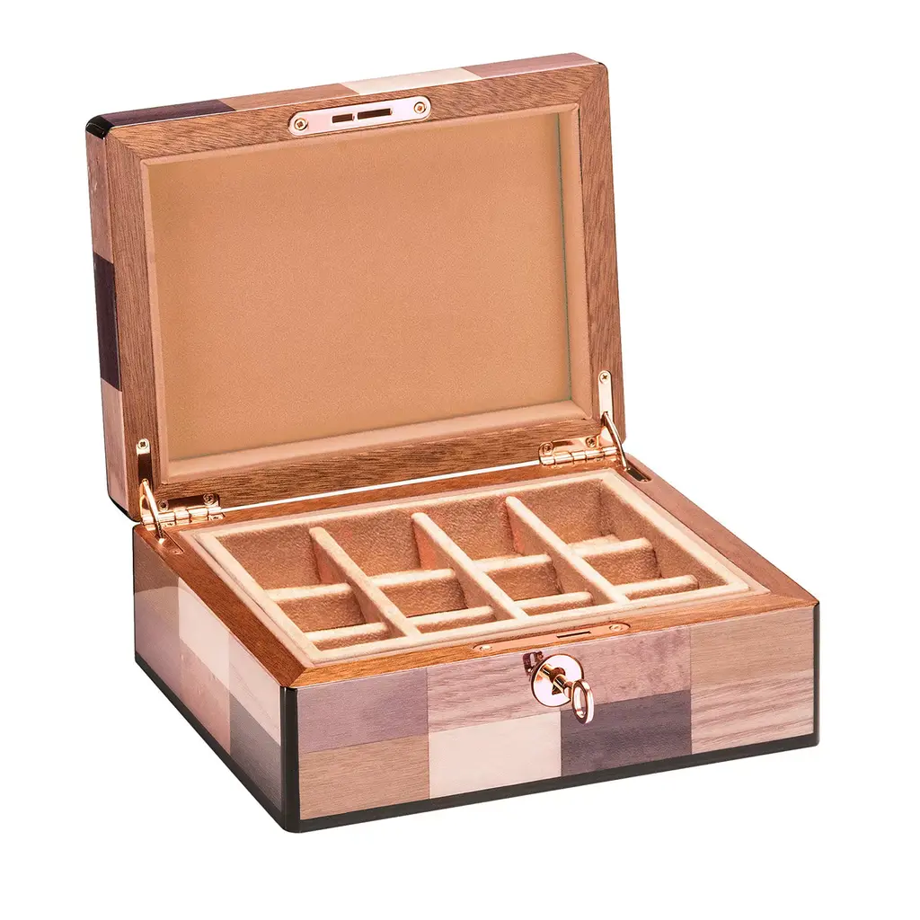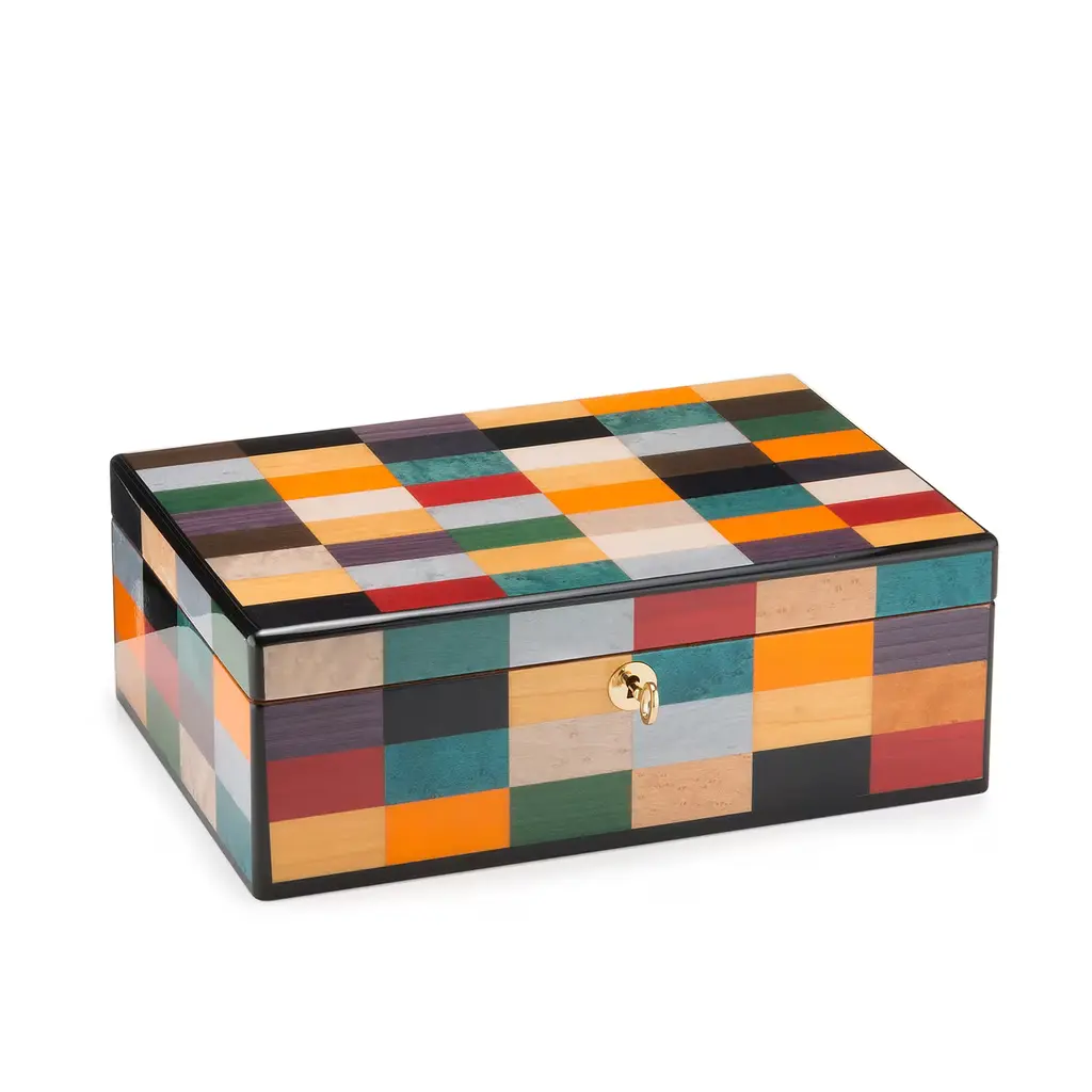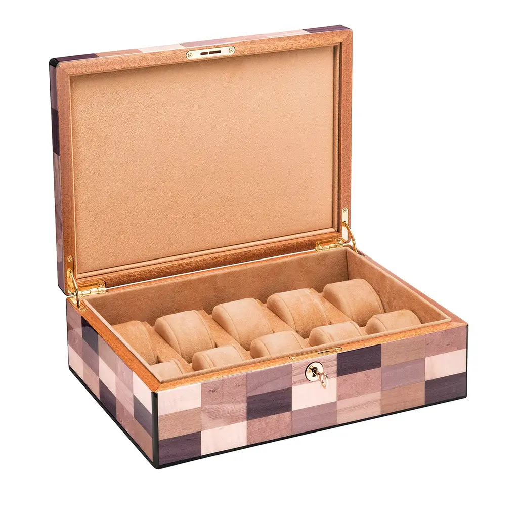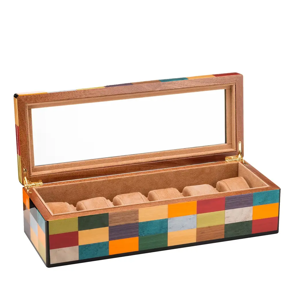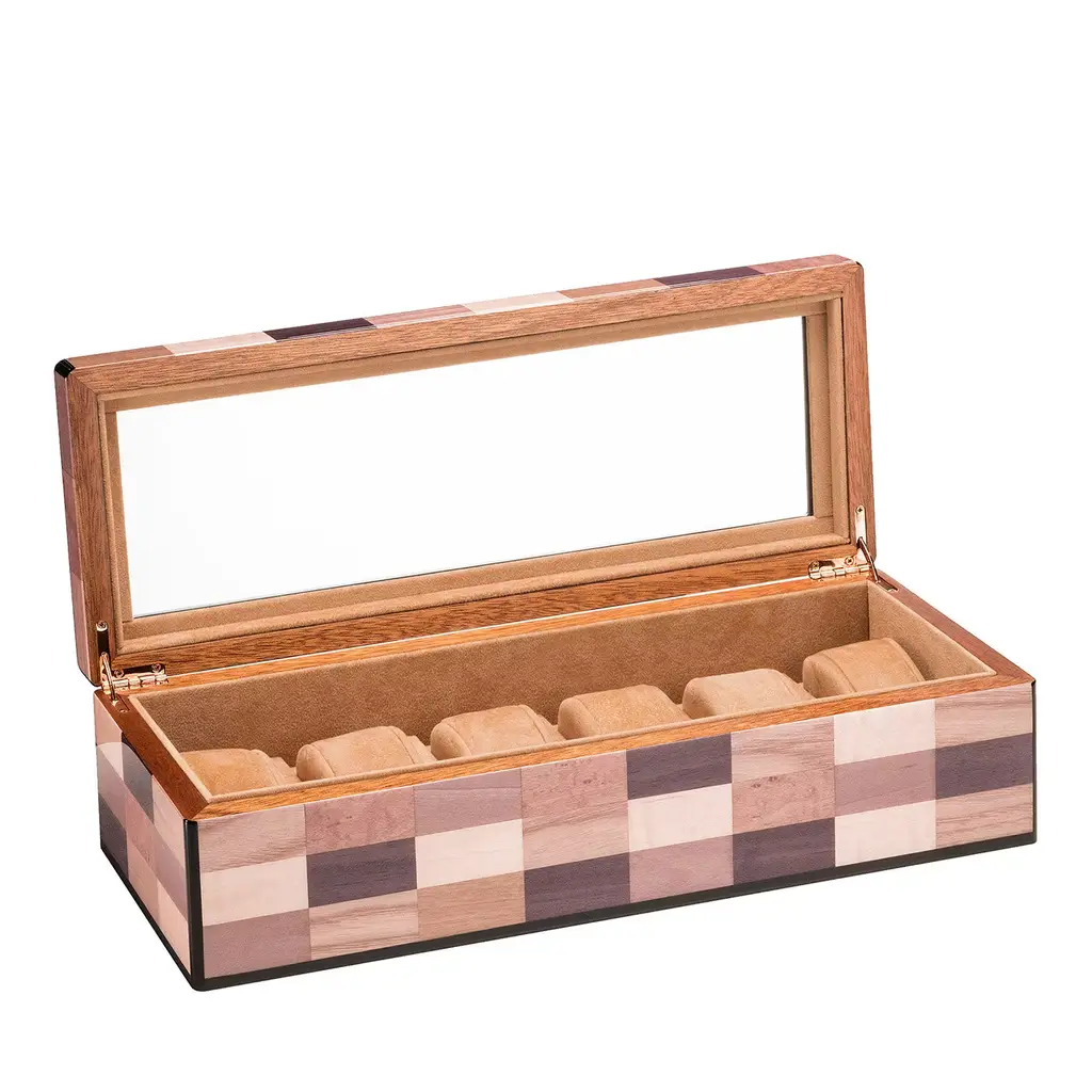 This splendid watch case is a must for a watch aficionado, exquisitely handcrafted of refined materials. Enhanced with a polished and brushed finish, it will shine in any interior thanks to the handmade inlay works of vividly colored rectangles veneered on the mahogany surface. Enriched with gold-finished metal details, the piece is lined with beige Alcantara and can store up to eight watches.