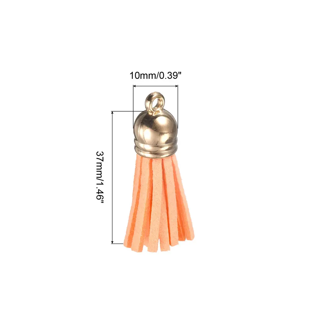 [Leather Tassels] - Total Size: 37mm x 10mm/1.46" x 0.39"(L*Dia); Thickness: 2.3mm/0.091"; Package Included: 120Pcs x Leather Tassels.[Material] - Made of suede leather material that is durable and not easy to fade. It has excellent properties such as lightweight, wear resistance, non-deformation, high strength, and long-term use. The tassel cap is made of plastic material, durable and not easy to deform.[Feature] - The tassel pendants with a leather texture that is comfortable to touch and handle. The leather tassel is not easily bent and not easy to fall off, so that the tassel looks straight and perfect.[Easy to Use] - Designed with a loop on the cap to help you easily attach with a string, keyring, wire without wasting time tidying up or worrying about splitting the thread as it goes through the body.[Application] - Great for keychain tassels, earrings, bag accessories, cellphone straps, zipper pulls, curtain pendants, clothing design, jewelry making and handmade diy accessories crafting.Description:Made of suede leather material that is durable and not easy to fade. It has excellent properties such as lightweight, wear resistance, non-deformation, high strength, and long-term use. The tassel cap is made of plastic material, durable and not easy to deform.The tassel pendants with a leather texture that is comfortable to touch and handle. The leather tassel is not easily bent and not easy to fall off, so that the tassel looks straight and perfect.Designed with a loop on the cap to help you easily attach with a string, keyring, wire without wasting time tidying up or worrying about splitting the thread as it goes through the body.Great for keychain tassels, earrings, bag accessories, cellphone straps, zipper pulls, curtain pendants, clothing design, jewelry making and handmade diy accessories crafting. Product Specifications:Material: Suede LeatherColor: RedTotal Size: 37mm x 10mm/1.46" x 0.39"(L*Dia)Thickness: 2.3mm/0.091"Package Included:120Pcs x Leather Tassels