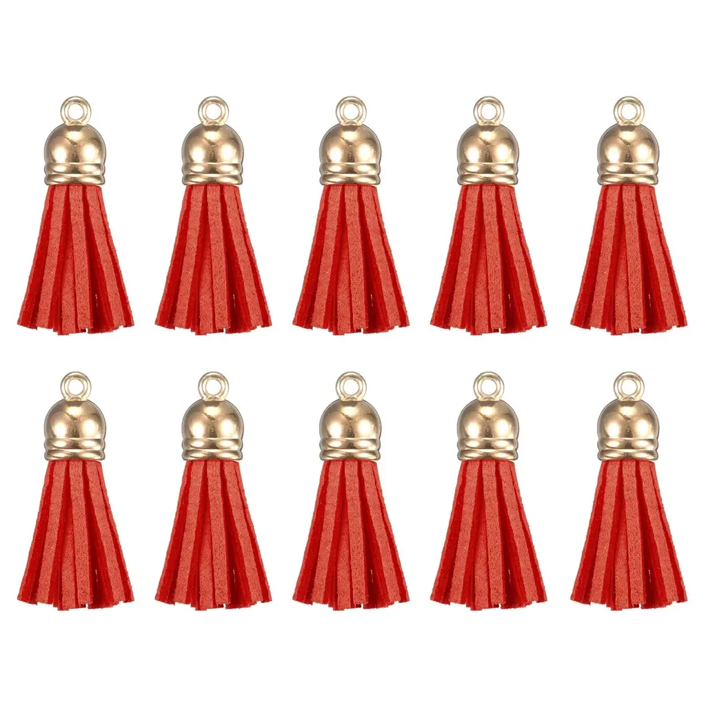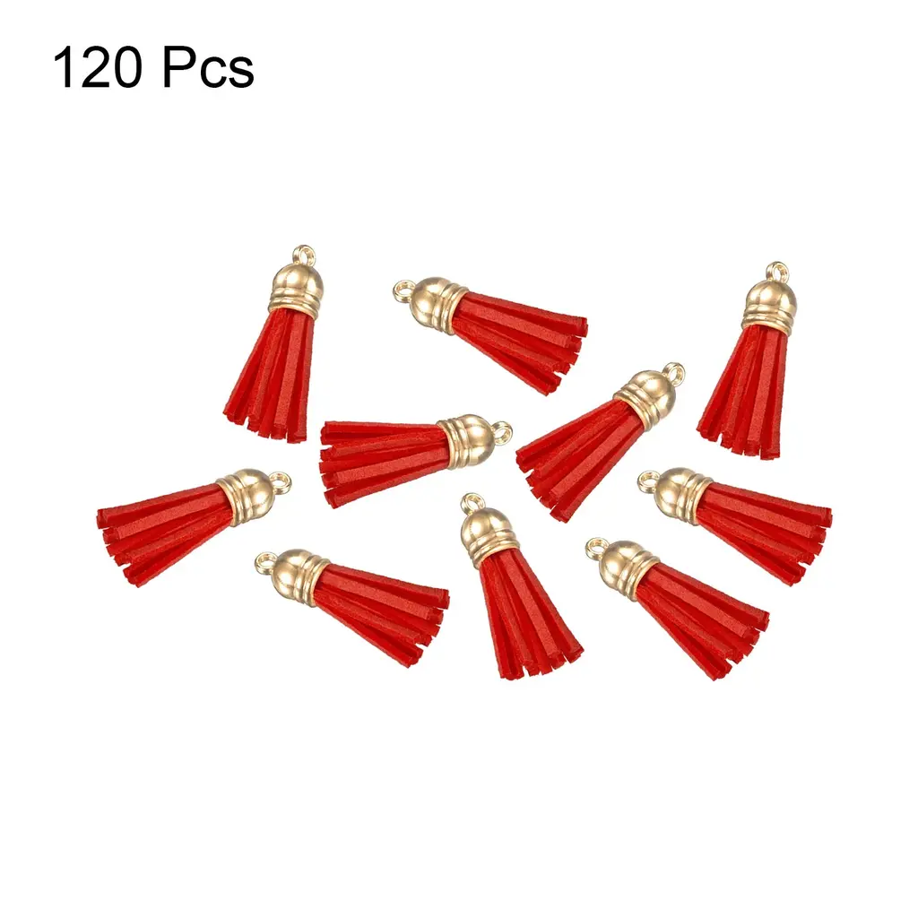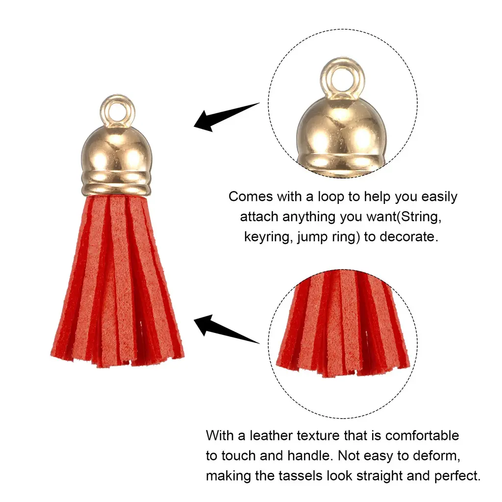 [Leather Tassels] - Total Size: 37mm x 10mm/1.46" x 0.39"(L*Dia); Thickness: 2.3mm/0.091"; Package Included: 120Pcs x Leather Tassels.[Material] - Made of suede leather material that is durable and not easy to fade. It has excellent properties such as lightweight, wear resistance, non-deformation, high strength, and long-term use. The tassel cap is made of plastic material, durable and not easy to deform.[Feature] - The tassel pendants with a leather texture that is comfortable to touch and handle. The leather tassel is not easily bent and not easy to fall off, so that the tassel looks straight and perfect.[Easy to Use] - Designed with a loop on the cap to help you easily attach with a string, keyring, wire without wasting time tidying up or worrying about splitting the thread as it goes through the body.[Application] - Great for keychain tassels, earrings, bag accessories, cellphone straps, zipper pulls, curtain pendants, clothing design, jewelry making and handmade diy accessories crafting.Description:Made of suede leather material that is durable and not easy to fade. It has excellent properties such as lightweight, wear resistance, non-deformation, high strength, and long-term use. The tassel cap is made of plastic material, durable and not easy to deform.The tassel pendants with a leather texture that is comfortable to touch and handle. The leather tassel is not easily bent and not easy to fall off, so that the tassel looks straight and perfect.Designed with a loop on the cap to help you easily attach with a string, keyring, wire without wasting time tidying up or worrying about splitting the thread as it goes through the body.Great for keychain tassels, earrings, bag accessories, cellphone straps, zipper pulls, curtain pendants, clothing design, jewelry making and handmade diy accessories crafting. Product Specifications:Material: Suede LeatherColor: RedTotal Size: 37mm x 10mm/1.46" x 0.39"(L*Dia)Thickness: 2.3mm/0.091"Package Included:120Pcs x Leather Tassels