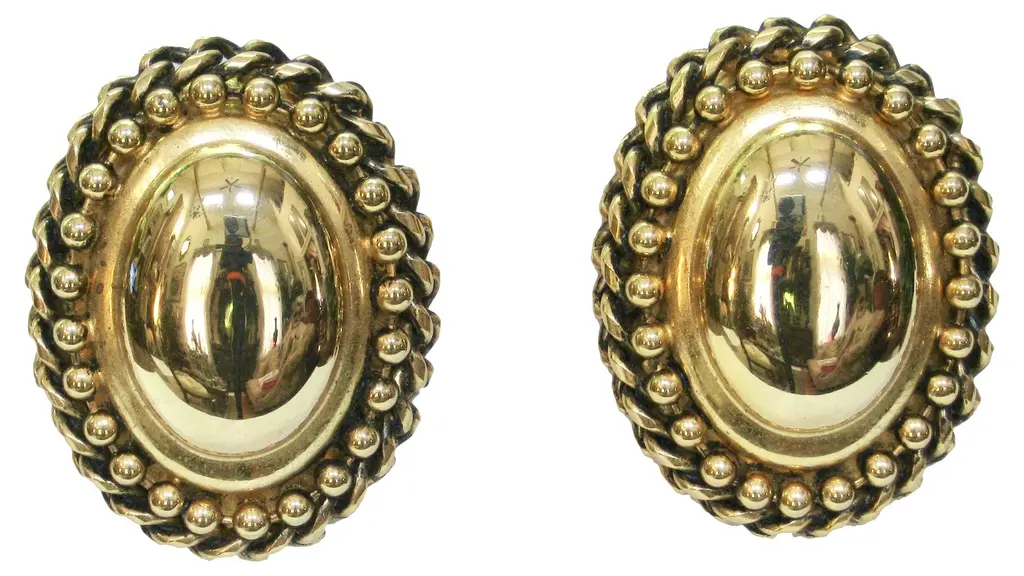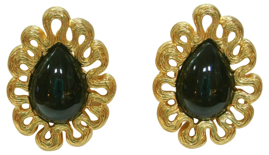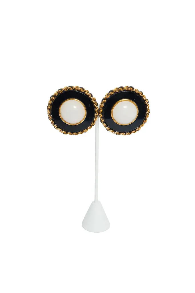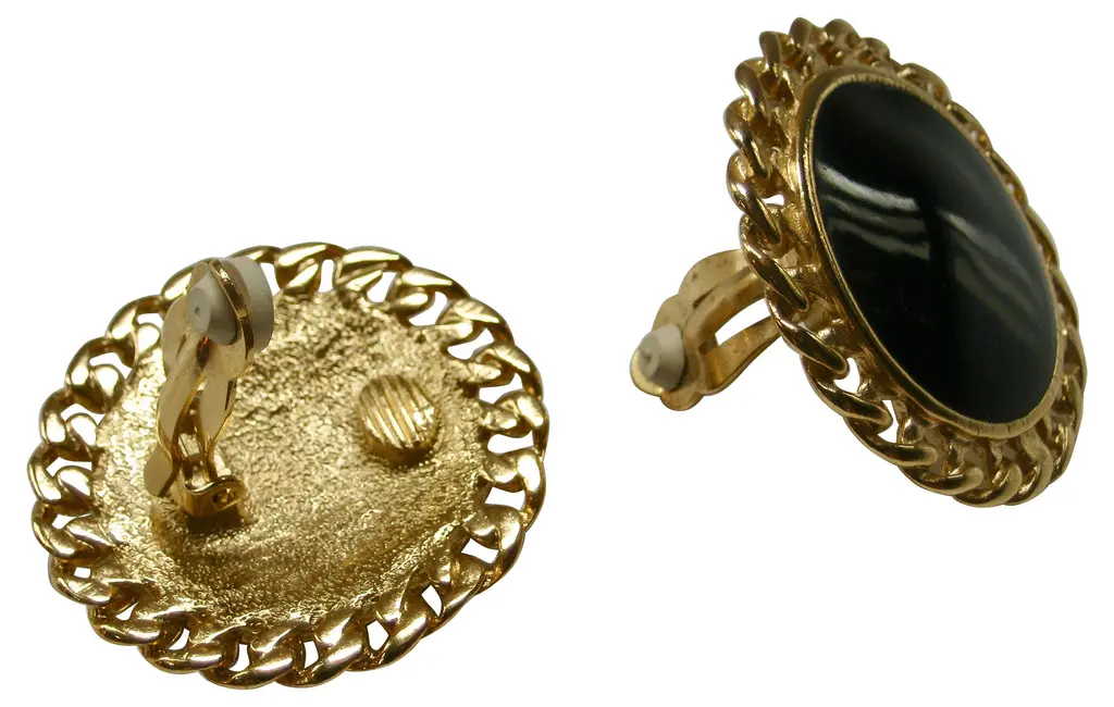 1980s black enamel clip-back earrings with gold-plated cable-motif border. From a private collection, never worn. Attributed to Givenchy. Unsigned.